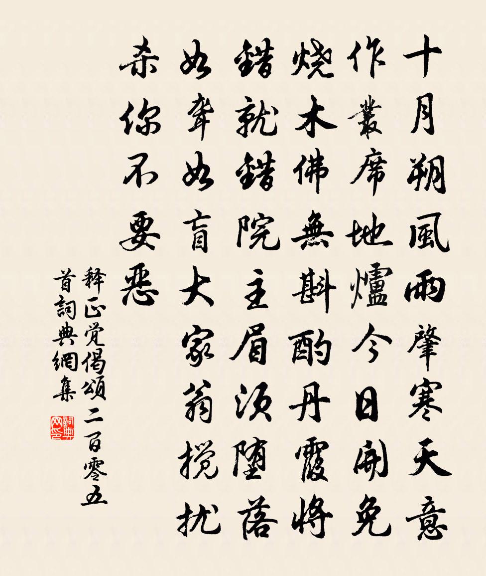 詩詞名句歷史字典書法欣賞書法字典國語詞典說文解字康熙字典古漢語字典標 題 作 者 詩 句 偈頌二百零五首作者:釋正覺 朝代:宋代偈頌二百零五首原文十月朔,風雨肇寒天意作。叢席地爐今日開,免燒木佛無斟酌。丹霞將錯就錯,院主眉須墮落。如聾如盲大家翁,攪擾殺你不要惡。詩詞問答問:偈頌二百零五首的作者是誰?答:釋正覺問:偈頌二百零五首寫於哪個朝代?答:宋代釋正覺偈頌二百零五首書法欣賞偈頌二百零五首書法作品詩詞推薦妙喜寺逵公院賦得夜磬送呂評事皎然〔唐代〕一磬寒山至,凝心轉清越。細和虛籟盡,疏繞懸泉發。在夜吟更長,停空韻難絕。幽僧悟深定,歸客忘遠別。寂歷贈鄰女(一作寄李億員外)魚玄機〔唐代〕羞日遮羅袖,愁春懶起妝。易求無價寶,難得有心郎。枕上潛垂淚,花間暗斷腸。自能窺宋玉,何必恨王昌。懷武夷紅石子二首貫休〔唐代〕常思紅石子,獨自住山椒。窗外猩猩語,爐中奼奼嬌。乳香諸洞滴,地秀眾峰朝。曾見奇人說,煙霞恨太遙。弋者青衫濕遍·悼亡納蘭性德〔清代〕青衫濕遍,憑伊慰我,忍便相忘。半月前頭扶病,剪刀聲、猶在銀釭。憶生來、小膽怯空房。到而今,獨伴梨花影送王震給事知蔡州蘇轍〔宋代〕朝廷入忘返,冠蓋如雲屯。賢哉貴公子,獨以民社言。西台出命書,落筆波濤翻。東台典封駁,坐惜日月奔。試劇過桐廬縣陳元晉〔宋代〕嚴陵耕釣處,清淑故依然。樓館危臨水,人煙近倚天。客行桑下路,晨墾嶺頭田。遲我風帆便,津頭更覓錢。陰陽吟邵雍〔宋代〕陽行一,陰行二。一主天,二主地。天行六,地行四。四主形,六主氣。西郊二首陳師道〔宋代〕紅綠相催春事闌,可能無意待人看。不因送客那能出,衰病經年一據鞍。金陵懷古劉子翬〔宋代〕荒城莽莽蔽荊榛,虎踞龍蟠跡已陳。赤壁戰爭江照晚,青樓歌舞鳥鳴春。十年王氣雄圖盡,一疊寒笳客恨新。折屐過三十六洞鄭獬〔宋代〕高溪卻瀉低溪水,溪里分明見白沙。夜來山上暴風雨,溪口流出紅桃花。董侍郎生日三首魏了翁〔宋代〕上到青天更上頭,好風滿地水連疇。雲開玉斧河邊戍,月照金牛峽外秋。舉目河山無盡藏,關心籌略最高樓。辛夷醉紅妝(中呂調)張先〔宋代〕瓊枝玉樹不相饒。薄雲衣、細柳腰。一般妝樣百般嬌。眉眼細、好如描。東風搖草百花飄。恨無計、上青條。更起秋日寇準〔宋代〕江天物候潛衰變,氣爽初疑夏景餘。雨漬亂苔侵古壁,風飄紅葉滿荒渠。晚雲連岳幽藏寺,秋水澄江靜見魚。昔歲得家書杜甫〔唐代〕去憑遊客寄,來為附家書。今日知訊息,他鄉且舊居。熊兒幸無恙,驥子最憐渠。臨老羈孤極,傷時會合疏。二毛和張叔靖三絕鄭剛中〔宋代〕後生修飾正爭妍,老者何顏與後肩。竹逕柴門閉深寂,嵇康只願得高眠。和趙給事白蠅拂歌盧綸〔唐代〕華堂多眾珍,白拂稱殊異。柄裁沈節香襲人,上結為文下垂穗。霜縷霏微瑩且柔,虎鬚乍細龍髯稠。皎然素色不因尋南溪常山道人隱居 / 尋南溪常道士劉長卿〔唐代〕一路經行處,莓苔見履痕。白雲依靜渚,芳草閉閒門。過雨看松色,隨山到水源。溪花與禪意,相對亦忘言。歸隱嵩陽張詠〔宋代〕浮世事無限,何須要到頭。壯心為客盡,孤跡臥雲休。匣劍已全棄,林僧亦少酬。從來愁恨意,乞待外人愁。寄崔帥卿洪咨夔〔宋代〕歸鴻隻影宿汀洲,夢繞蘆花不奈愁。潁谷杯羹無日遺,翳桑橐飯有時酬。功名曠世來斯受,議論驚人合則留。此事偈頌一百五十首釋心月〔宋代〕六月火邊坐,有眼無耳朵。鐵蛇鑽不入,鐵牛沖不破。名句推薦巴山楚水淒涼地,二十三年棄置身。劉禹錫《酬樂天揚州初逢席上見贈》 滿腹詩書漫古今,頻年流落易傷心。宇文虛中《在金日作·選二》 林中有奇鳥,自言是鳳凰。阮籍《詠懷八十二首·其七十九》 是故置本不安者,無務豐末。墨子《墨子·02章 修身》 古岩泉滴滴,幽谷鳥關關。令狐楚《賦山 / 一七令·山》 莎衫筠笠。正是村村農務急。盧炳《減字木蘭花·莎衫筠笠》 故人相望若為情。別愁深夜雨,孤影小窗燈。陳克《臨江仙·四海十年兵不解》 相思無因見,悵望涼風前。李白《折荷有贈》 石溪久住思端午,館驛樓前看發機。盧肇《競渡詩 / 及第後江寧觀競渡寄袁州剌史成應元》 理郁者苦貧,辭溺者傷亂劉勰《文心雕龍·神思》