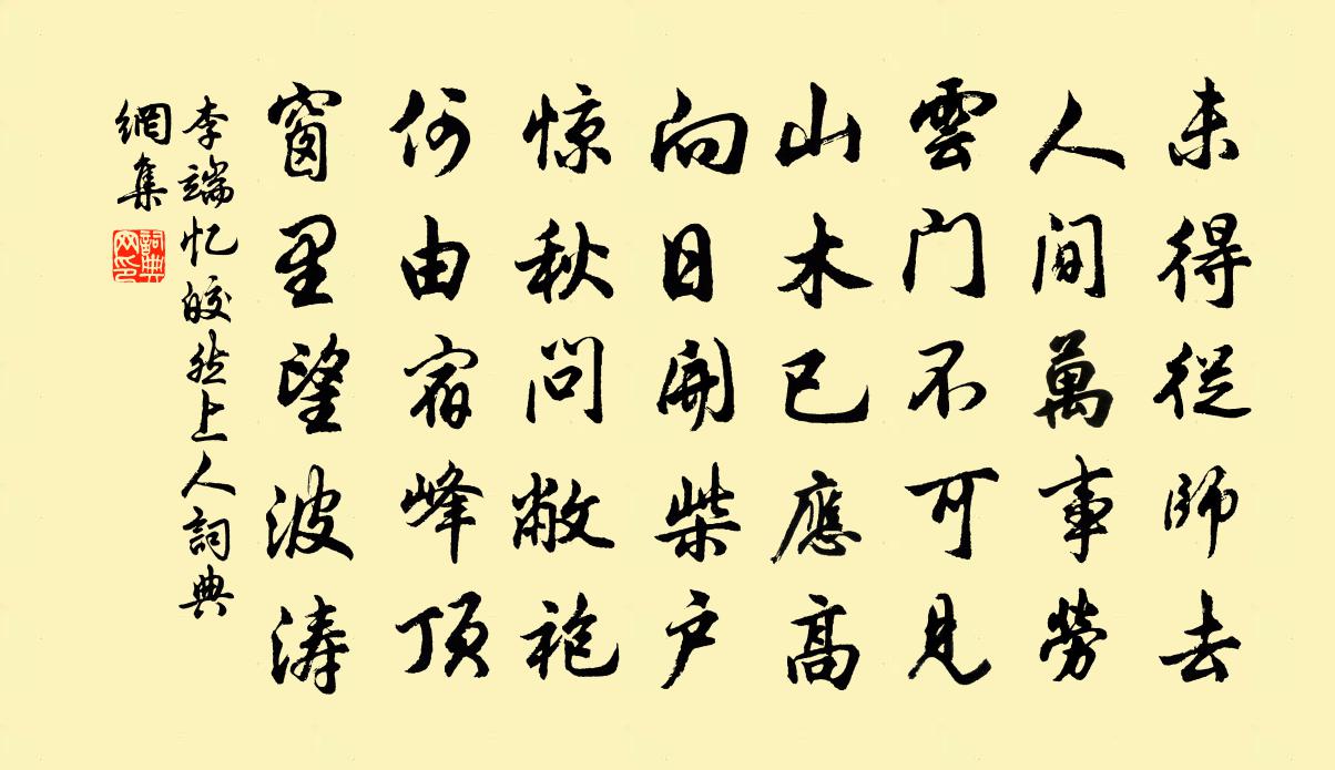 詩詞名句歷史字典書法欣賞書法字典國語詞典說文解字康熙字典古漢語字典標 題 作 者 詩 句 憶皎然上人作者:李端 朝代:唐代憶皎然上人原文未得從師去,人間萬事勞。雲門不可見,山木已應高。向日開柴戶,驚秋問敝袍。何由宿峰頂,窗里望波濤。詩詞問答問:憶皎然上人的作者是誰?答:李端問:憶皎然上人寫於哪個朝代?答:唐代問:憶皎然上人是什麼體裁?答:五律李端憶皎然上人書法欣賞憶皎然上人書法作品注釋全唐詩:卷285_27詩詞推薦西江月·世事短如春夢朱敦儒〔宋代〕世事短如春夢,人情薄似秋雲。不須計較苦勞心。萬事原來有命。幸遇三杯酒好,況逢一朵花新。片時歡笑且相親讀杜子美集姜特立〔宋代〕巴蜀勞重往,荊湘無定居。宦情常造次,行橐屢空虛。宮闕煙塵外,江村盜賊余。弟兄蹤跡斷,妻子信音疎。生理行次漢水寄荊南漕唐司勛鄭獬〔宋代〕漢水渺渺東南流,蕭蕭雨打杏花洲。欲托雙魚寄書札,不知幾日到荊州。荊州故人日漸遠,到時綠草滿沙頭。爭得寄呈史太師二首張鎡〔宋代〕昔為金闕相,曾是玉皇師。近即維垣拜,還從彭祖期。傳聞風景勝,我賦洞天詩。肯示漁樵否,林間要勒碑。滿江紅 自豫章阻風吳城山作張元乾〔宋代〕春水迷天,桃花浪、幾番風惡。雲乍起、遠山遮盡,晚風還作。綠卷芳洲生杜若。數帆帶雨煙中落。傍向來、沙觜藍田溪雜詠二十二首石蓮花錢起〔唐代〕幽石生芙蓉,百花慚美色。遠笑越溪女,聞芳不可識。劉家江阻風二首洪咨夔〔宋代〕歲月孤槎轉,風波斷梗隨。謝三元自慣,巽二莫相欺。沙岸往來拍,蘆林開闔吹。欠伸呼斗酒,一笑酹馮夷。小園李建勛〔唐代〕小園吾所好,栽植忘勞形。晚果經秋赤,寒蔬近社青。竹蘿荒引蔓,土井淺生萍。更欲從人勸,憑高置草亭。題蒲葵扇雍裕之〔唐代〕傾心曾向日,在手幸搖風。羨爾逢提握,知名自謝公。夜與原甫江家步歸梅堯臣〔宋代〕丹砂漆盤盛井水,冷浸半坼山櫻花。始見春色不奈喜,黃昏招飲夜還家。劉郎居南我居北,陌上泥開天正黑。風吹臨寂頌釋顯嵩〔宋代〕八十年中常浩浩,寵開肆貨摩尼寶。也無一個共商量,不是山僧收鋪早。酬楊比部員外暮宿琴堂朝躋書閣率爾見贈之作(作王維)盧照鄰〔唐代〕閒拂檐塵看,鳴琴候月彈。桃源迷漢姓,松徑有秦官。空谷歸人少,青山背日寒。羨君棲隱處,遙望白雲端。句張權〔宋代〕江轉荊湖第二州,巴渝東畔楚西頭。懷梅花及斯遠趙蕃〔宋代〕幾思載酒更攜筇,一訪梅花山崦中。忽念去君三十里,悵然將復與誰同。澗舖嶺道中四首趙蕃〔宋代〕鉅竹差差合,青杉裊裊長。人多表池檻,此乃亘山岡。次韻張秀才雪陳造〔宋代〕可是春皇吝物華,群仙剪水作奇葩。壺中天地渾糜玉,風處園林盡勒花。宿火暖寒聊榾柮,夜光落手急驚嗟。忍飢漫興劉克莊〔宋代〕保社有幽子,戶庭無雜賓。若非負苓者,即是耦耕人。筇穩慵呼馬,蔬甘勝擘麟。篋中詩又滿,誰謂此翁貧。己亥十月送成父弟絜兩戶幼累歸玉山五首趙蕃〔宋代〕已辦知津送去舟,重臨快閣亦悠悠。黃知橘柚江行好,此去況經龍霧洲。廬山尋靈紀不遇貫休〔唐代〕久別稀相見,深山道益孤。葉全離大朴,君尚在新吳。鍾嗄聲飄驛,山頑氣噴湖。留詩如和得,一望寄前途。【中呂】紅繡鞋_次韻劍擊西張可久〔元代〕次韻劍擊西風鬼嘯,琴彈夜月猿號,半醉淵明可人招。南來山隱隱,東去浪淘淘,浙江歸路杳。春日湖上二首百五名句推薦如何同枝葉,各自有枯榮李白《樹中草》 三百年間同曉夢,鐘山何處有龍盤。李商隱《詠史二首·其一》 朔風如解意,容易莫摧殘。崔道融《梅花》 喜無以賞,怒無以殺管仲《管子·版法》 枕上十年事,江南二老憂,都到心頭。徐再思《水仙子·夜雨》 頑老情懷,都無歡事,良宵愛幽獨。吳文英《一寸金·秋感》 可憐報國無路,空白一分頭。楊炎正《水調歌頭·登多景樓》 穗帷飄井幹,樽酒若平生。謝朓《同謝諮議詠銅雀台》 紙上得來終覺淺,絕知此事要躬行。陸游《冬夜讀書示子聿》 所謂敬天者,不獨嚴而有禮,當有其實。張廷玉《明史·本紀·卷三》
