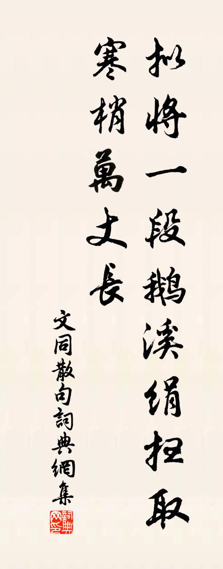 詩詞名句歷史字典書法欣賞書法字典國語詞典說文解字康熙字典古漢語字典標 題 作 者 詩 句 句作者:文同 朝代:宋代句原文擬將一段鵝溪絹,掃取寒梢萬丈長。詩詞問答問:句的作者是誰?答:文同問:句寫於哪個朝代?答:宋代文同句書法欣賞句書法作品詩詞推薦次陸務觀韻寄王景文一首王阮〔宋代〕朔風搖楚水,國步益艱辛。往事忽成夢,逆胡何日臣。凡今天下士,皆昔座中人。尚被中原發,煩君與正巾。追感往事陸游〔宋代〕世事紛紛過眼新,九衢依舊漲紅塵。桃花夢破劉郎老,燕麥搖風別是春。題蛻龍洞白茆洞佚名〔宋代〕西南酒十里嶺之酒巔,靈冢酒巋然洞隱仙。門辟神扃低視井,柱生一竊仰瞻天。瓮中春酒今朝釀,洞內仙賓昔日賢浣溪沙(和曾純甫題謝氏小閣)張掄〔宋代〕築室崢嶸占寶峰。退朝燕坐萬緣空,出塵高志抗冥鴻。何日嘉招陪一笑,看君豪飲釂千鍾。試憑鄙句作先容。贈東庵約公翁卷〔宋代〕問今年八十,退院久清閒。白雪髭慵剃,青松戶早關。取泉來煮茗,與客話游山。弟子何僧是,緇衣多往還。山居雜詩九十首曹勛〔宋代〕三春君卉盛,在花茂與殘。好花正穠麗,不作十日看。蓓嫩便須賞,開時惟可嘆。繼自喜新綠,吾心常並觀。燕巢軍幕宋之問〔唐代〕非關憐翠幕,不是厭朱樓。故來呈燕頷,報導欲封侯。偈頌一百零一首釋慧性〔宋代〕春行萬國春無跡,臘雪消殘始見功。頭頭應現,處處流通。木馬泥牛吼,花柳撼春風。送程公辟守洪州王安石〔宋代〕畫船插幟搖秋光,鳴鐃傳鼓水洋洋。豫章太守吳郡郎,行指鬥牛先過鄉。鄉人出孰航酒漿,炰龜鱠魚炊稻粱。芡頭許州旌節到作薛能〔唐代〕兩地旌旗擁一身,半緣傷舊半榮新。州人若憶將軍面,寫取雕堂報國真。病中絕句陸游〔宋代〕半脫貂裘雪滿鞍,慣將豪舉壓儒酸。病來意氣渾非昨,一炷香菸帳底看。天童玲瓏岩樓鑰〔宋代〕捫蘿歷棧上層峰,寖覺芒鞋踏半空。七竅幾時開渾沌,八窗無處不玲瓏。已欣古洞容身過,直恐丹丘有路通。俯視定風波(丙寅四月吳門西樓之集)蔡伸〔宋代〕老去情鐘不自持。篸花酌酒送春歸。玉貌冰姿人窈窕。一笑。清狂豈減少年時。欲上香車俱脈脈,半簾花影月平西題章野人山居 [一作秦系詩]馬戴〔唐代〕帶郭茅草詩興饒,回看一曲倚危橋。門前山色能深淺,壁上湖光自動搖。閒花散落填書帙,戲鳥低飛礙柳條。向此重刻孫謝二公詩劉述〔宋代〕漢興文藝推儒首,諫議才能□□師。更向謝岩鐫麗句,清風千古照江湄。再幸華清宮徐夤〔唐代〕腸斷將軍改葬歸,錦囊香在憶當時。年來卻恨相思樹,春至不生連理枝。雪女冢頭瑤草合,貴妃池裡玉蓮衰。霓裳東掖四絕句隔塵亭石象之〔宋代〕山椒亭榭適徘徊,病膜煩襟斗頓開。若有塵埃何處隔,此中自是少塵埃。蝶戀花晏幾道〔宋代〕卷絮風頭寒欲盡,墜粉飄紅,日日成香陣。新酒又添殘酒困,今春不減前春恨。蝶去鶯飛無處問,隔水高樓,望斷送程傳叟葉適〔宋代〕茂苑台高春日明,君顏如花楊柳青。蕭條別離風雨外,楊柳自青君貌改。誰知仰天愬天公,三辰五星在心中。老作宣妙墳院古柏衛宗武〔宋代〕古來喬木產墓宅,新甫之儔匪凡質。風梳雨沐三百年,聳壑昂霄過千尺。孤標屹立獨擎天,繁柯偏重常傾日。蒼皮名句推薦窮猿投林,豈暇擇木!房玄齡《晉書·列傳·第六十二章》 相恨不如潮有信,相思始覺海非深。白居易《浪淘沙·借問江潮與海水》 嘆隙中駒,石中火,夢中身。蘇軾《行香子·述懷》 坐看黑雲銜猛雨,噴灑前山此獨晴。崔道融《溪上遇雨二首》 年年遊子惜余春,春歸不解招遊子。賀鑄《惜余春·急雨收春》 酒盈杯,書滿架,名利不將心掛。李珣《漁歌子·荻花秋》 海角天涯,寒食清明,淚點絮花沾袖。吳文英《花心動·柳》 粉身碎骨渾不怕, 要留清白在人間于謙《石灰吟》 憶與君別年,種桃齊蛾眉。李白《獨不見》 曉鏡但愁雲鬢改,夜吟應覺月光寒。李商隱《無題·相見時難別亦難》
