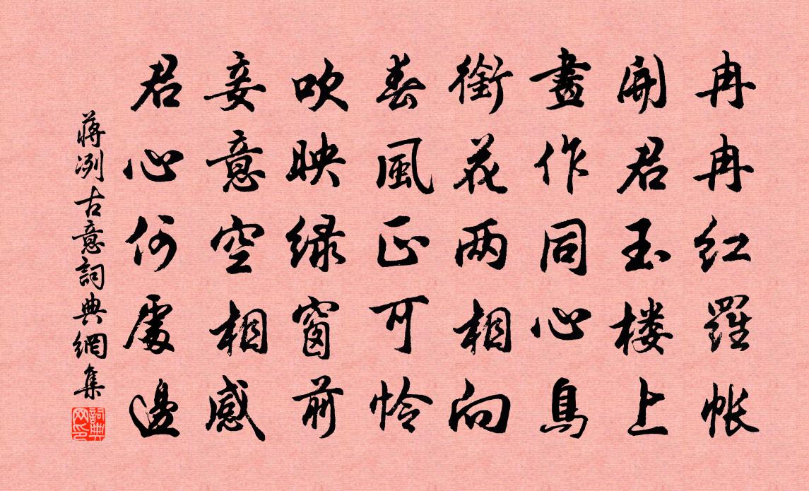 詩詞名句歷史字典書法欣賞書法字典國語詞典說文解字康熙字典古漢語字典標 題 作 者 詩 句 古意作者:蔣冽 朝代:唐代古意原文冉冉紅羅帳,開君玉樓上。畫作同心鳥,銜花兩相向。春風正可憐,吹映綠窗前。妾意空相感,君心何處邊。詩詞問答問:古意的作者是誰?答:蔣冽問:古意寫於哪個朝代?答:唐代問:古意是什麼體裁?答:五古蔣冽古意書法欣賞古意書法作品注釋全唐詩:卷258_11詩詞推薦二郎神王十朋〔宋代〕深深院。夜雨過,簾櫳高卷。正滿檻、海棠開欲半。仍朵朵、紅深紅淺。遙認三千宮女面。勻點點、胭脂未遍。更送津赴紹興倅八首吳芾〔宋代〕當年我鎮臥龍山,曾種千花與萬竿。歲久不知無恙否,因來且為報平安。題仙居道中徐似道〔宋代〕地褊山成簇,溪平水不奔。晴天帶陰色,冬日作春溫。草聚雞豚市,機聲桑柘村。舟人識行李,相約候歸轅。昭武太守王子文日舉李賈嚴羽共觀前輩一兩家戴復古〔宋代〕欲參詩律似參禪,妙趣不由文字傳。個裡稍關心有誤,發為言句自超然。送人過衛州楊巨源〔唐代〕憶昔征南府內游,君家東閤最淹留。縱橫聯句長侵曉,次第看花直到秋。論舊舉杯先下淚,傷離臨水更登樓。相思秋辭江南黃滔〔唐代〕灞陵橋上路,難負一年期。積雨鴻來夜,重江客去時。勞生多故疾,漸老少新知。惆悵都堂內,無門雪滯遺。送李才元學士知邛州蘇洵〔宋代〕貧賤帶羞妻子,帶富貴樂鄉帶關。不見帶李夫子,得意今西還。白馬渡滻水,紅旗照蜀山。歸來未解帶,故舊已滿朱叔止通判屢示詩詞綽有家法輒次年字韻一篇周必大〔宋代〕筆勢奔騰決大川,談鋒激烈敵丁年。花開共入長春苑,柯爛爭看不老仙。西笑君先聽漢履,上征我未拍洪肩。從今居厚不果行次韻二首劉克莊〔宋代〕物色來林下,安排起海濱。居然蒙錦阱,幸未駕蒲輪。非我瑕疵女,雲誰毀譽臣。只愁從此去,未易致虞人。甲辰歲與塗漢英別己酉復相過遽告行固小留之曾豐〔宋代〕轉蓬分首入梅頭,千里空餘夢往還。把酒無非酹明月,鳴弦不復鼓高山。匆匆六載重攜手,草草三杯一破顏。相聚小舟晚興四首楊萬里〔宋代〕蒻篷舊屋雨聲乾,蘆蕟新檐暖日眠。枕底席邊俱綠水,腳根頭上兩青天。次韻道潛南康見寄蘇轍〔宋代〕一葉追隨魚與龍,紅粳白酒幸年豐。也知山色遙相待,苦畏君詩欲見攻。乘興風帆終日去,尋幽蠟屐及春同。請君麥晁公溯〔宋代〕層雲挾雨來,四郊樹木蒼。東風吹春促,尚帶花葯香。年華不可駐,倏見夏日長。近傳陵陂麥,宿昔青已黃。隣舍送外甥懷素上人歸鄉侍奉錢起〔唐代〕釋子吾家寶,神清慧有餘。能翻梵王字,妙盡伯英書。遠鶴無前侶,孤雲寄太虛。狂來輕世界,醉里得真如。飛錫梁燕黃庚〔宋代〕梁間兩處燕成窠,來往銜泥帶落花。昵昵並頭休巧語,相依總在別人家。記萬載風俗三絕祖無擇〔宋代〕居民覆其屋,大半施白瓦。山際兩三家,如經新雪下。幸白鹿觀應制李嶠〔唐代〕駐蹕三天路,回旃萬仞谿。真庭群帝饗,洞府百靈棲。玉酒仙壚釀,金方暗壁題。佇看青鳥入,還陟紫雲梯。郿塢蘇軾〔宋代〕衣中甲厚行何懼,塢里金多退足憑。畢竟英雄誰得似,臍脂自照不須燈。廣都江上作陸游〔宋代〕微波不搖江,纖雲不行天。我來倚杖立,天水相澄鮮。平遠望不盡,日落自生煙。梅花耿獨立,雪樹明前川。好風系尋陽上崔相渙其一李白〔唐代〕邯鄲四十萬,同日陷長平。能回造化筆,或冀一人生。名句推薦諸君才絕世,獨步許誰強妙信《九日酬諸子》 新妝宜面下朱樓,深鎖春光一院愁。劉禹錫《和樂天春詞 / 春詞》 悠悠天宇曠,切切故鄉情。張九齡《西江夜行》 郭門臨渡頭,村樹連谿口。王維《新晴野望》 季子正年少,匹馬黑貂裘。辛棄疾《水調歌頭·舟次揚州和人韻》 天闕象緯逼,雲臥衣裳冷杜甫《游龍門奉先寺》 青天蜀道難,紅葉吳江冷。張可久《普天樂·秋懷》 天地相合,以降甘露,民莫之令而自均。老子《老子·道經·第三十二章》 東岩富松竹,歲暮幸同歸。王勃《送盧主簿》 歸夢寄吳檣。水驛江程去路長。陸游《南鄉子·歸夢寄吳檣》