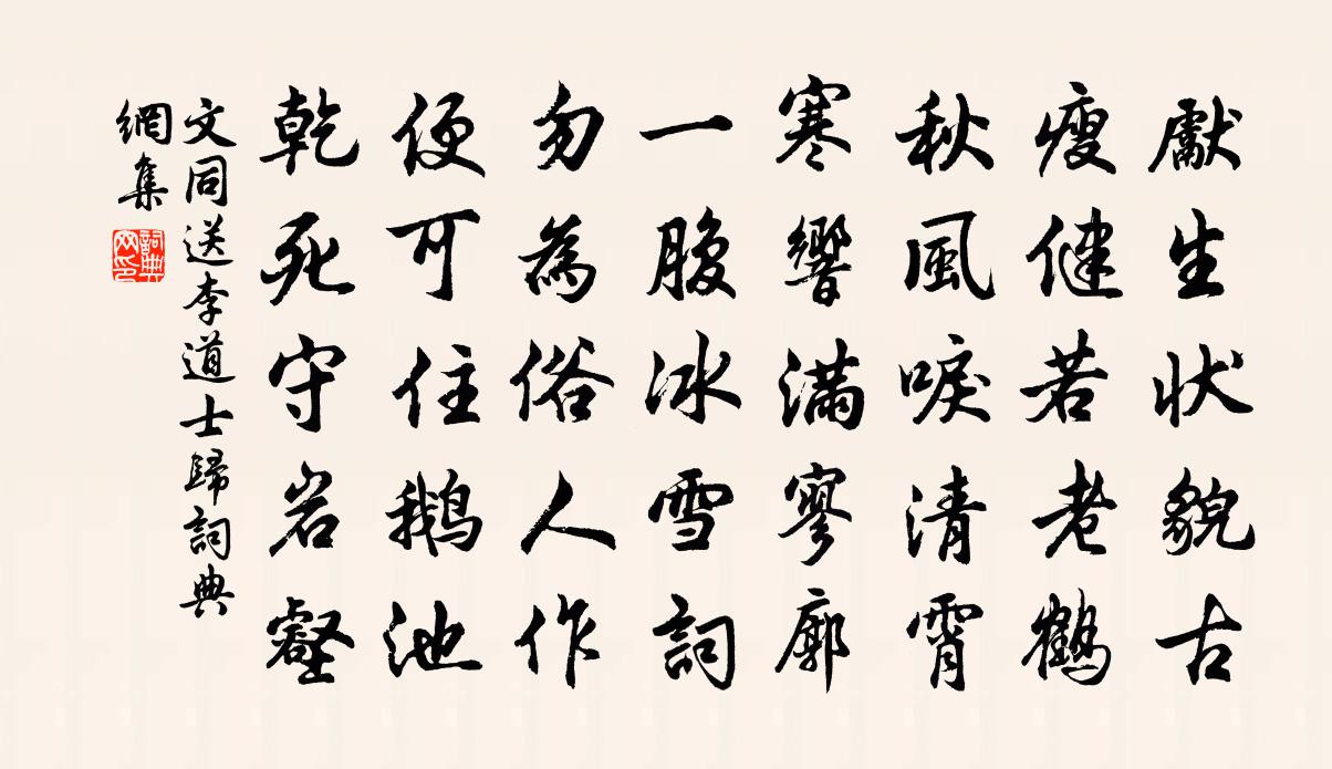 詩詞名句歷史字典書法欣賞書法字典國語詞典說文解字康熙字典古漢語字典標 題 作 者 詩 句 送李道士歸作者:文同 朝代:宋代送李道士歸原文先生狀貌古,瘦健若老鶴。秋風唳清霄,寒響滿寥廓。一腹冰雪詞,勿為俗人作。便可住鵝池,乾死守岩壑。詩詞問答問:送李道士歸的作者是誰?答:文同問:送李道士歸寫於哪個朝代?答:宋代文同送李道士歸書法欣賞送李道士歸書法作品詩詞推薦湖中夕泛歸南屏四絕釋道濟〔宋代〕五月西湖涼似秋,新荷吐蕊暗香浮。明年花落人何在,把酒問花花點頭。送雁宕慶藏主釋智朋〔宋代〕四十九盤飛鳥外,衲衣猶帶宕雲寒。豁開湖海煙波眼,枯木石頭在雁山。金陵雜興二百首蘇泂〔宋代〕內官折送御園梅,歷刺如薪苦不才。安得昌原帶苔樹,疏花分得幾枝來。送鄭錫(曙曾事此公季父)司空曙〔唐代〕漢陽雲樹清無極,蜀國風煙思不堪。莫怪別君偏有淚,十年曾事晉征南。秋懷十首微雲淡河漢疏雨滴梧桐為韻楊冠卿〔宋代〕古人例躬耕,我坐老無斷。勇為梁父吟,已愧杜鵑喚。幽幽桃華源,尚不知有漢。婦子彼何為,徒使人意亂。與士繇游金山翌日分袂二絕陳東〔宋代〕早別金山恰曉鍾,離帆分破一江風。瓜洲渡口波聲遠,後夜相思明月中。次韻費夢得晚秋感懷三首郭印〔宋代〕搖落秋風晚,吾衰已一翁。不堪居世上,寧忍臥山中。帷幄人焉用,塵埃帝尚蒙。仰天無計出,老淚濺寒空。鄭伯克段於鄢左丘明〔先秦〕初,鄭武公娶於申,曰武姜,生莊公及共叔段。莊公寤生,驚姜氏,故名曰寤生,遂惡之。愛共叔段,欲立之。亟吉父用晁恭道韻作詩謝同會次韻王洋〔宋代〕蒲柳先衰祗自驚,靜思前事似前生。力侔元氣推先覺,醉打愁城堪一行。求援援暌緣富厚,鼓宮宮動亦萬成。會當女郎山姜夔〔宋代〕不見郢中能賦客,可憐負此女郎山。冰魂寂寞無歸處,獨宿鴛鴦沙冰寒。李評事公進示文集因贈之歐陽詹〔唐代〕風雅不墜地,五言始君先。希微嘉會章,杳冥河梁篇。理蔓語無枝,言一意則千。往來更後人,澆盪醨前源。傾筐次韻張守與潤守總卿詩四首陳造〔宋代〕天階玉作筍,此地合垂紳。尚戒專城馭,虛逢籲俊辰。公方閱竹馬,名已薦楓宸。政恐經綸去,諸公拱後塵。簡彥博趙蕃〔宋代〕憶作連郛住,猶為解榻期。古書相是正,餘事劇娛嬉。近者間何闊,懷哉我所思。如聞獲稻畢,當是入山時。為善吟邵雍〔宋代〕人之為善事,善事義當為。金石猶能動,鬼神其可欺。事須安義命,言必道肝脾。莫問身之外,人知與不知。好了歌注曹雪芹〔清代〕陋室空堂,當年笏滿床;衰草枯楊,曾為歌舞場。蛛絲兒結滿雕梁,綠紗今又糊在蓬窗上。說什麼脂正濃,粉正香遊仙王貞白〔唐代〕我家三島上,洞戶眺波濤。醉背雲屏臥,誰知海日高。露香紅玉樹,風綻碧蟠桃。悔與仙子別,思歸夢釣鰲。華亭百詠淨居院許尚〔宋代〕明眼知何在,山門久寂然。宗風未淪替,還喜一鐙傳。菩薩蠻張元乾〔宋代〕甘林玉蕊生香霧。游蜂爭采清晨露。芳意著人濃。微烘曲室中。春來瀛海外。瀋水迎風碎。好事富餘熏。頻分幾縷臨江仙程垓〔宋代〕濃綠鎖窗閒院靜,照人明月團團。夜長幽夢見伊難。瘦從香臉薄,愁到翠眉殘。只道花時容易見,如今花盡春闌。老將效唐人體陸游〔宋代〕寶劍夜長鳴,金痍老未平。指弓夸野戰,抵掌說番情。已矣黑山戍,悵然青史名。和親不用武,教子作儒生。名句推薦秋風萬里動,日暮黃雲高。岑參《鞏北秋興寄崔明允》 投我以桃,報之以李。佚名《抑》 江心雲帶蒲帆重,樓上風吹粉淚香。嚴仁《鷓鴣天·惜別》 修己而不責人左丘明《左傳·閔公·閔公二年》 千里孤墳,無處話淒涼。蘇軾《江城子·乙卯正月二十日夜記夢》 潦倒不通世務,愚頑怕讀文章。曹雪芹《紅樓夢·第三回》 橫看成嶺側成峰,遠近高低各不同。蘇軾《題西林壁》 入春才七日,離家已二年。薛道衡《人日思歸》 君子和而不流;強哉矯。中立而不倚;強哉矯。國有道,不變塞焉;強哉矯。國無道,至死不變;強哉矯。子思《中庸·第十章》 時來風送滕王閣,運去雷轟薦福碑。佚名《增廣賢文·上集》