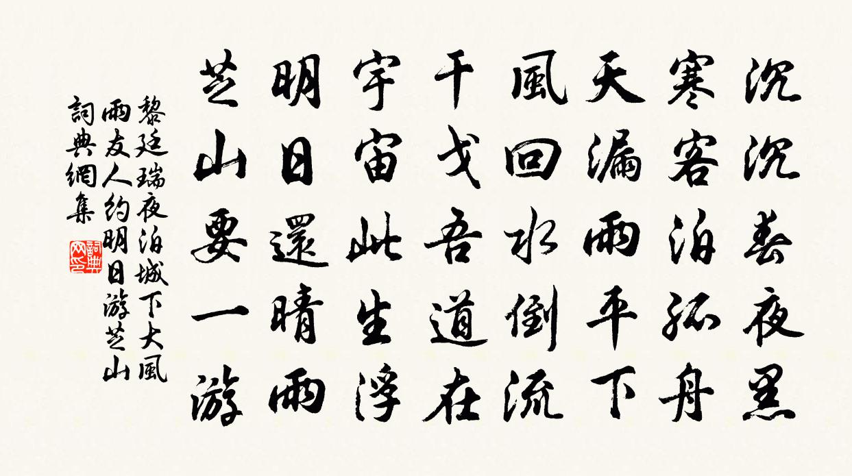 詩詞名句歷史字典書法欣賞書法字典國語詞典說文解字康熙字典古漢語字典標 題 作 者 詩 句 夜泊城下大風雨友人約明日游芝山作者:黎廷瑞 朝代:宋代原文沉沉春夜黑,寒客泊孤舟。天漏雨平下,風回水倒流。干戈吾道在,宇宙此生浮。明日還晴雨,芝山要一游。詩詞問答問:《夜泊城下大風雨友人約明日游芝山》的作者是誰?答:黎廷瑞問:該詩寫於哪個朝代?答:宋代書法欣賞夜泊城下大風雨友人約明日游芝山書法作品詩詞推薦戲呈南池同游諸兄劉宰〔宋代〕方池事南郊,勝踐又西風。多稼天連碧,芳蓮水映紅。漁歌來席上,鳥影度屏中。想見垂楊里,詩成又暮鍾。促拍醜奴兒(辛巳除夕)劉辰翁〔宋代〕送歲可無詩。得團欒、忍不開眉。不記去年今夕夢,江東懷抱,江西信息,舍北妻兒。五十扊扅炊。待五十、富貴寶氣亭胡銓〔宋代〕塵容不逐江流淨,酒力都從雪壓消。斗下祗今無劍氣,年來牛犢在人腰。廣東漕李實夫四首戴復古〔宋代〕乾坤雖廣大,人物不能多。議論還諸老,文章自一科。從橫負才略,緩急任干戈。不有濟時傑,其如世事何。醉題匡城周少府廳壁岑參〔唐代〕婦姑城南風雨秋,婦姑城中人獨愁。愁雲遮卻望鄉處,數日不上西南樓。故人薄暮公事閒,玉壺美酒琥珀殷。潁陽游後湖賞蓮花李璟〔唐代〕蓼花蘸水火不滅,水鳥驚魚銀梭投。滿目荷花千萬頃,紅碧相雜敷清流。孫武已斬吳宮女,琉璃池上佳人頭。早夏郡樓宴集姚合〔唐代〕官散有閒情,登樓步稍輕。窗雲帶雨氣,林鳥雜人聲。曉日襟前度,微風酒上生。城中會難得,掃壁各書名。次韻和丹陽裴如晦學士寄示與蔡子直陳述古唱蘇頌〔宋代〕惠愛昔曾留二浙,能聲行復表三河。更傳騷雅聯編富,可是江山助思多。寄杭州靈隱寺宋震使君貫休〔唐代〕罷郡歸侵夏,仍聞靈隱居。僧房謝朓語,寺額葛洪書。月樹獮猴睡,山池菡萏疏。吾皇愛清靜,莫便結吾廬。資中八首范祖禹〔宋代〕劍閣橫空鎖蜀門,資中岩岫若雲屯。天傾白日千山底,峽束長江萬里奔。望蓬萊 道友修庵馬鈺〔元代〕丘與馬,入道絕貪求。欲報師恩常念念,三年守服豈能休。何處好藏頭。舊居址,深謝許同修。但願我公同我志,訴衷情張元乾〔宋代〕形似之美。久欲記之而因循。比與諸公和長短句,故及之以訴衷情。蓋里中推星球紅、鶴頂紅,皆佳品。海舶便風留題碧落堂楊萬里〔宋代〕僊人白日上青冥,千載如聞月下笙。南北萬山俱在下,中間一水獨穿城。江西個是絕奇處,天下幾多虛得名。滕閣題鶴鳴泉曹松〔唐代〕仙鶴曾鳴處,泉兼半井苔。直峰拋影入,片月瀉光來。瀲灩侵顏冷,深沉慰眼開。何因值舟頂,滿汲石瓶回。小舟晚興四首楊萬里〔宋代〕蒻篷舊屋雨聲乾,蘆蕟新檐暖日眠。枕底席邊俱綠水,腳根頭上兩青天。大熱陸游〔宋代〕五月頗閔雨,炎風吹旱麈,氣羸不給喘,流汗沾衣巾。呼婢使具浴,報以未買薪。汝事雖不恪,亦坐乃翁貧。汲井再寄滿子權二首王令〔宋代〕秋盡啼衰蟲,君思雲奈何。我愚得君思合少,居賢勞我心則多。非獨辭源長,瀉海為江河。平生未始有點缺,玉日鳳棲梧 山居遣興王丹桂〔元代〕滿目青青松間竹。掩映山家,有甚閒榮辱。獨自唱吟斟美。味濃醉倒和衣宿。清夢覺來情未足。重抱瑤琴,品弄一葉舟侯善淵〔元代〕大道本無一物。遍納十方充塞。無外亦無心。不容針。要見闡開清目。認得本元虛谷。非淺亦非深。滿壺金。秋蕊香陳允平〔宋代〕晚酌宜城酒暖。玉軟嫩紅潮面。醉中窈窕度嬌眼。不識愁深恨淺。繡窗一縷香絨線。擊雙燕。海棠滿地夕陽遠。明名句推薦刑天舞乾戚,猛志固常在。陶淵明《讀山海經·其十》 料峭春風吹酒醒,微冷,山頭斜照卻相迎。蘇軾《定風波·三月七日》 此身行作稽山土,猶吊遺蹤一泫然。陸游《沈園二首》 去年夜半橫江夢,倚危檣,參差曾賦劉辰翁《桂枝香· * 人去》 君子恥不修,不恥見污。荀子《荀子·非十二子》 知者行之始。行者知之成。王陽明《傳習錄·卷上·門人陸澄錄》 低頭羞見人,雙手結裙帶。毛鉉《 * 詞·下床著新衣》 伏屍百萬,流血漂櫓。賈誼《過秦論》 綠雲擾擾,梳曉鬟也;杜牧《阿房宮賦》 倦遊京洛風塵,夜來病酒無人問。晁端禮《水龍吟·詠月》