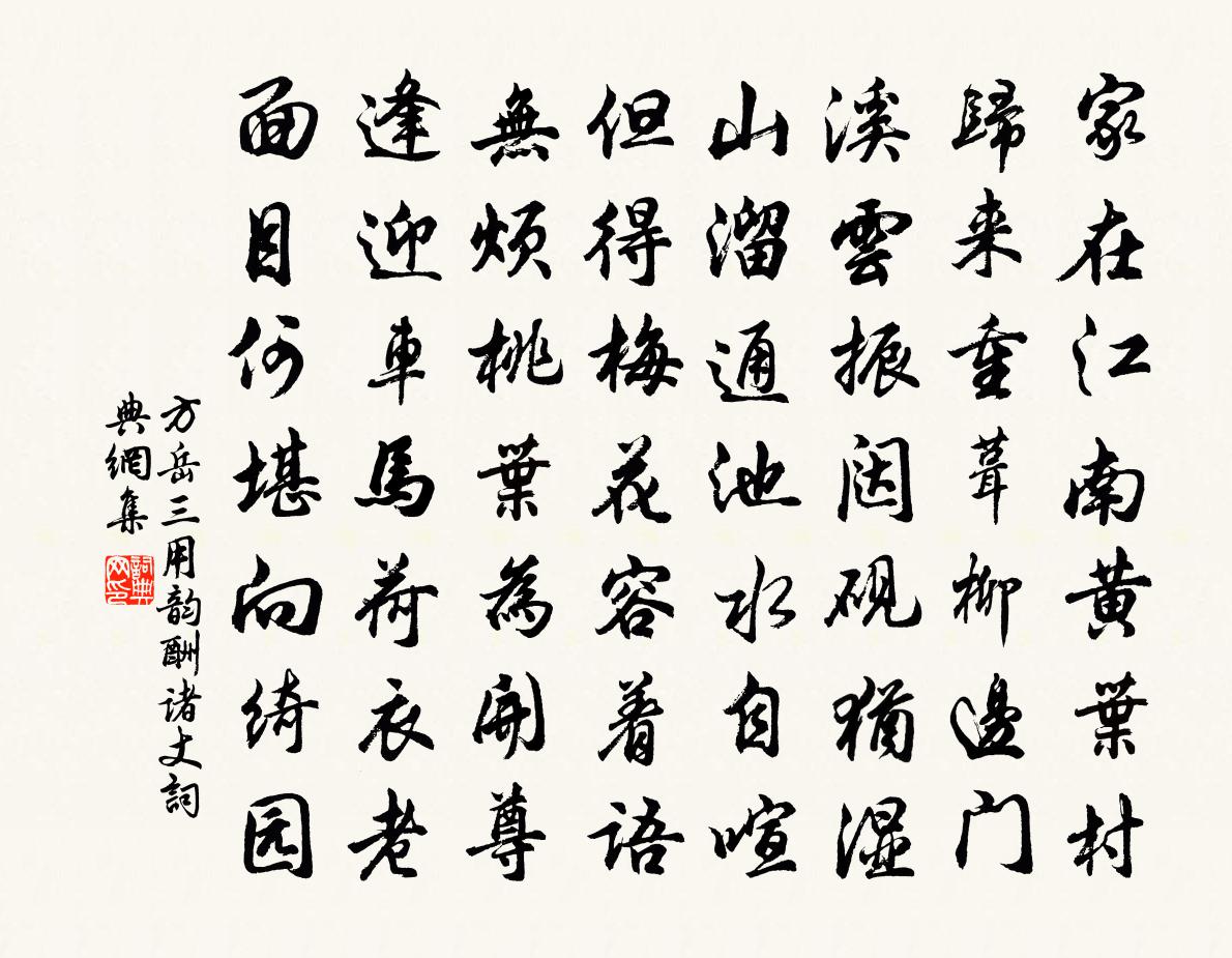 詩詞名句歷史字典書法欣賞書法字典國語詞典說文解字康熙字典古漢語字典標 題 作 者 詩 句 三用韻酬諸丈作者:方岳 朝代:宋代三用韻酬諸丈原文家在江南黃葉村,歸來重葺柳邊門。溪雲振闥硯猶濕,山溜通池水自喧。但得梅花容著語,無煩桃葉為開尊。逢迎車馬荷衣老,面目何堪向綺園。詩詞問答問:三用韻酬諸丈的作者是誰?答:方岳問:三用韻酬諸丈寫於哪個朝代?答:宋代方岳三用韻酬諸丈書法欣賞三用韻酬諸丈書法作品詩詞推薦題釣台對嚴氏樓三首滕岑〔宋代〕秋江不許一塵染,只有青山倒影寒。我欲移家來住此,煩君先為斬魚竿。觀方外書陸游〔宋代〕司馬遺書有坐忘,顗翁止觀略相當。龜堂閉戶常終日,時得相從一炷香。孔周翰嘗令仙源中秋以事留東武時陳君榮右王蘇軾〔宋代〕超然台聞周翰乞此郡客有誦其詩者乃次其韻二篇以為他日一笑。壞壁題詩已五年,故人風物兩依然。定知來歲中秋擬嵇康絕交寄湘中貫微齊己〔唐代〕何處同嵇懶,吾徒道異諸。本無文字學,何有往來書。岳寺逍遙夢,侯門勉強居。相知在玄契,莫訝八行疏。旅舍書懷寄所知二首羅隱〔唐代〕思量前事不堪尋,牢落余情滿素琴。四海豈無騰躍路,一家長有別離心。道從汩沒甘雌伏,跡恐因循更陸沈。寂寞戲效樂天體張鎡〔宋代〕去日不可再,來日焉可虛。直待百事足,漫把四大拘。黃河幾曾清,白髮莫旋烏。全福貴安然,真樂難強圖。樸直浣溪沙(再和)李之儀〔宋代〕依舊琅玕不染塵。霜風吹斷笑時春。一簪華發為誰新。白雪幽蘭猶有韻,鵲橋星渚可無人。金蓮移處任塵昏。別東林寺僧李白〔唐代〕東林送客處,月出白猿啼。笑別廬山遠,何煩過虎溪。全州礲岩陳峴〔宋代〕泉流縈帶戛冰玉,石壁深窈寒侵衣。開鑿應勞造化力,窟宅如待靈仙歸。西江月(小鹿鳴)王千秋〔宋代〕四俊鄉書薦鶚,一夔漕府登賢。明年春晚柳如煙。看取臚傳金殿。冊府牙籤晝閱,詞垣紫誥宵傳。青樓買酒定無緣題元丹丘潁陽山居李白〔唐代〕仙遊渡潁水,訪隱同元君。忽遺蒼生望,獨與洪崖群。卜地初晦跡,興言且成文。卻顧北山斷,前瞻南嶺分。遙通湖上對酒行張謂〔唐代〕夜坐不厭湖上月,晝行不厭湖上山。眼前一尊又長滿,心中萬事如等閒。主人有黍百餘石,濁醪數斗應不惜。即今二十四詩品司空圖〔唐代〕匪神之靈,匪機之微,如將白雲,清風與歸。遠引若至,臨之已非。少有道契,終與俗違。亂山喬木,碧苔芳暉。春懷衛宗武〔宋代〕伊耆司化權,與物何落落。不見陽和敷,但聞風雨惡。柔綠尚含滋,水紅慳破萼。動植久陵暴,至仁同橐簽。可使所寓堂後月季再生與遠同賦蘇轍〔宋代〕客背有芳藂,開花不遺月。何人縱尋斧,害意肯留卉。偶乘秋雨滋,冒土見微茁。猗猗抽條穎,頗欲傲寒冽。勢窮念奴嬌(碧含笑)趙長卿〔宋代〕晚妝才罷,見櫳絲勻玉,一團嬌秀。趁得年光,長是向、金谷無花時候。不比鶯鶯,不關燕燕,不似章台柳。清涼寄同年朱景淵通判八首劉宰〔宋代〕四海游夫了,粹學洞谷今。聞善亟推挽,常恐力不任。時危系長才,白日已西沉。拱木戰寒風,淒其千載心。頌古八首釋雲〔宋代〕獨唱清新拍不同,寥寥千古意無窮。擬開眼向聲前聽,早被風吹別調中。牛渚夜泊崔塗〔唐代〕煙老石磯平,袁郎夜泛情。數吟人不遇,千古月空明。人事年年別,春潮日日生。無因逢謝尚,風物自淒清。送柳判官赴振武李益〔唐代〕邊庭漢儀重,旌甲似雲中。虜地山川壯,單于鼓角雄。關寒塞榆落,月白鬍天風。君逐嫖姚將,麒麟有戰功。名句推薦入門休問榮枯事,且看容顏便得知。佚名《增廣賢文·上集》 遙憐小兒女,未解憶長安。杜甫《月夜》 以身教者從,以言教者訟。范曄《後漢書·列傳·第五鍾離宋寒列傳》 滿園花菊鬱金黃,中有孤叢色似霜。白居易《重陽席上賦白菊》 日往菲薇,月來扶疏。左思《三都賦》 當關不報侵晨客,新得佳人字莫愁。李商隱《富平少侯》 離恨做成春夜雨。添得春江,劃地東流去楊炎正《蝶戀花·別范南伯》 私勿與人,謀必辟。來俊臣《羅織經·治下卷第三》 從前種種,譬如昨日死;從後種種,譬如今日生袁黃《了凡四訓·立命之學》 知章騎馬似乘船,眼花落井水底眠杜甫《飲中八仙歌》
