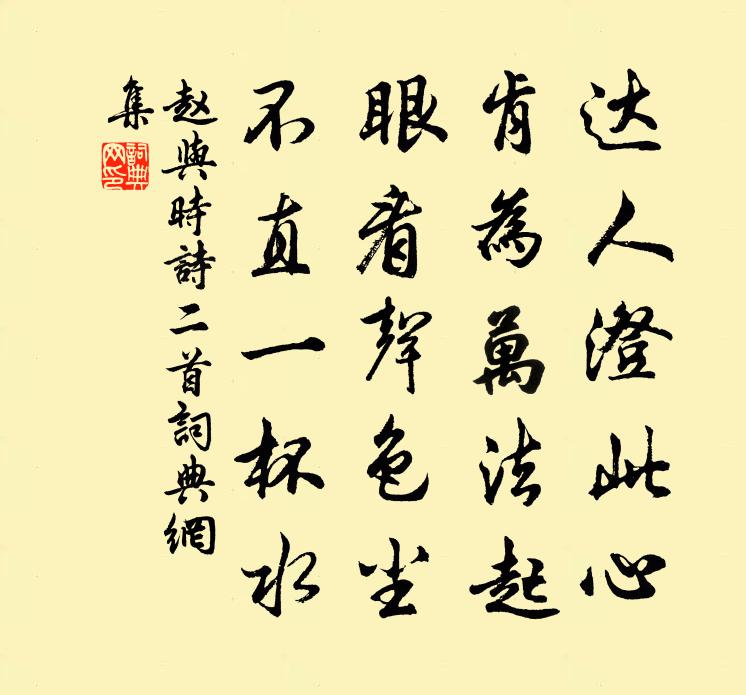 詩詞名句歷史字典書法欣賞書法字典國語詞典說文解字康熙字典古漢語字典標 題 作 者 詩 句 詩二首作者:趙與時 朝代:宋代詩二首原文達人澄此心,肯為萬法起。眼看聲色塵,不直一杯水。詩詞問答問:詩二首的作者是誰?答:趙與時問:詩二首寫於哪個朝代?答:宋代趙與時詩二首書法欣賞詩二首書法作品詩詞推薦挽邵公容春王柏〔宋代〕北風獵獵兮申原之幽,玄扉啟兮靈辰不留。蘇黃之像兮儼其如在,容春之人兮杳不可求。一棺兮厚德,萬古兮高丘紅梅陸游〔宋代〕薴蘿山下越溪女,戲作長安時世妝。白白朱朱雖小異,斷知不是百花香。題張僧繇醉僧圖懷素〔唐代〕人人送酒不曾沽,終日松間掛一壺。草聖欲成狂便發,真堪畫入醉僧圖。和范元作五絕胡寅〔宋代〕馬遷法左氏,實錄系日月。孰傳經世學,儻可論絕筆。破虜凱歌二十四首周麟之〔宋代〕向來燒飯起中都,已覺胡星墮玉除。罪惡貫盈天不赦,區區猶欲禱醫閭。臨江仙王千秋〔宋代〕者也之乎真太錯,甘心吞棘吞蓬。有無俱盡見真空。爐錐難自薦,關捩只心通。野鶴孤雲元自在。剛論隱豹冥鴻。好事近朱敦儒〔宋代〕眼裡數閒人,只有釣翁瀟灑。已佩水仙宮印,惡風波不怕。此心那許世人知,名姓是虛假。一棹五湖三島,任船兒送陳養晦謁閬風舍先生四首戴表元〔宋代〕嚼雪餐冰二十年,空月日月自風煙。從君識盡搜詩法,不透薌岩不是仙。大衍易吟四十首方回〔宋代〕仁道成已極,體元乾長人。獨休不遠復,當且學回仁。西軒詩甘露寺鬼〔唐代〕趙壹能為賦,鄒陽解獻書。可惜西江水,不救轍中魚。偉哉橫海鱗,壯矣垂天翼。一旦失風水,翻為螻蟻食。功遂入道詩十九首王慶升〔宋代〕閏年為厄要先推,陽忒陰差莫妄為。宋待一陽來復後,斗加東北月沈西。次程斗山村居韻十首楊公遠〔宋代〕隱跡深村里,年今四十餘。謾攜三寸管,欠讀幾行書。愛竹和煙種,移梅帶月鋤。簞瓢還自樂,飯糗茹青蔬。和王中丞使君春日過高評事幽居陳羽〔唐代〕風光滿路旗幡出,林下高人待使君。笑藉紫蘭相向醉,野花千樹落紛紛。馮當可游龍鶴山有詩贈安道人用韻二首郭印〔宋代〕一到仙山眼自明,前身彷佛記曾經。真人眇忽在何許,更隨藜杖緣青冥。柳張旭〔唐代〕濯濯煙條拂地垂,城邊樓畔結春思。請君細看風流意,未減靈和殿里時。偈頌一百零四首釋紹曇〔宋代〕庭院春深,和風翠陰。桃花簇錦,柳線搖金。無盧靈雲徒說悟,一生埋沒祖師心。舟過季家山小泊陸游〔宋代〕困睫蒙蒙渴煮茶,繫船來叩野人家。風翻翠浪千畦麥,水漾紅雲一塢花。健犢破荒耕犖确,幽禽除蠹啄槎牙。尋春淳熙四年二月既望靜江守臣張某奉詔勸農於郊張栻〔宋代〕嗟爾父老,勿替諄諄。其未率從,警厲其身。三吊吟四首方回〔宋代〕偶聞一人死,惻怛吁以驚。千人萬人死,能不愴厥情。長平幾性命,銳頭付一坑。亡者抱永痛,勝喜功名成。功名偈頌二百零五首釋正覺〔宋代〕主中賓,賓中主,相合回頭看里許。明月團團夜正央,崑崙抱出珊瑚樹。名句推薦相逢秋月滿,更值夜螢飛。王績《秋夜喜遇王處士》 將軍狐裘臥不暖,都護寶刀凍欲斷。岑參《天山雪歌送蕭治歸京》 行有不得者,皆反求諸己,其身正而天下歸之。孟子《孟子·離婁章句上·第四節》 綴玉聯珠六十年,誰教冥路作詩仙。李忱《吊白居易》 一苗露水一苗草,一朝天子一朝臣。佚名《增廣賢文·下集》 一條藤徑綠,萬點雪峰晴。李白《冬日歸舊山》 多少新亭揮淚客,誰夢中原塊土。劉克莊《賀新郎·送陳真州子華》 樂殊貴賤,禮別尊卑。周興嗣《千字文·全文》 滿腹詩書漫古今,頻年流落易傷心。宇文虛中《在金日作·選二》 越人語天姥,雲霞明滅或可睹。李白《夢遊天姥吟留別 / 別東魯諸公》