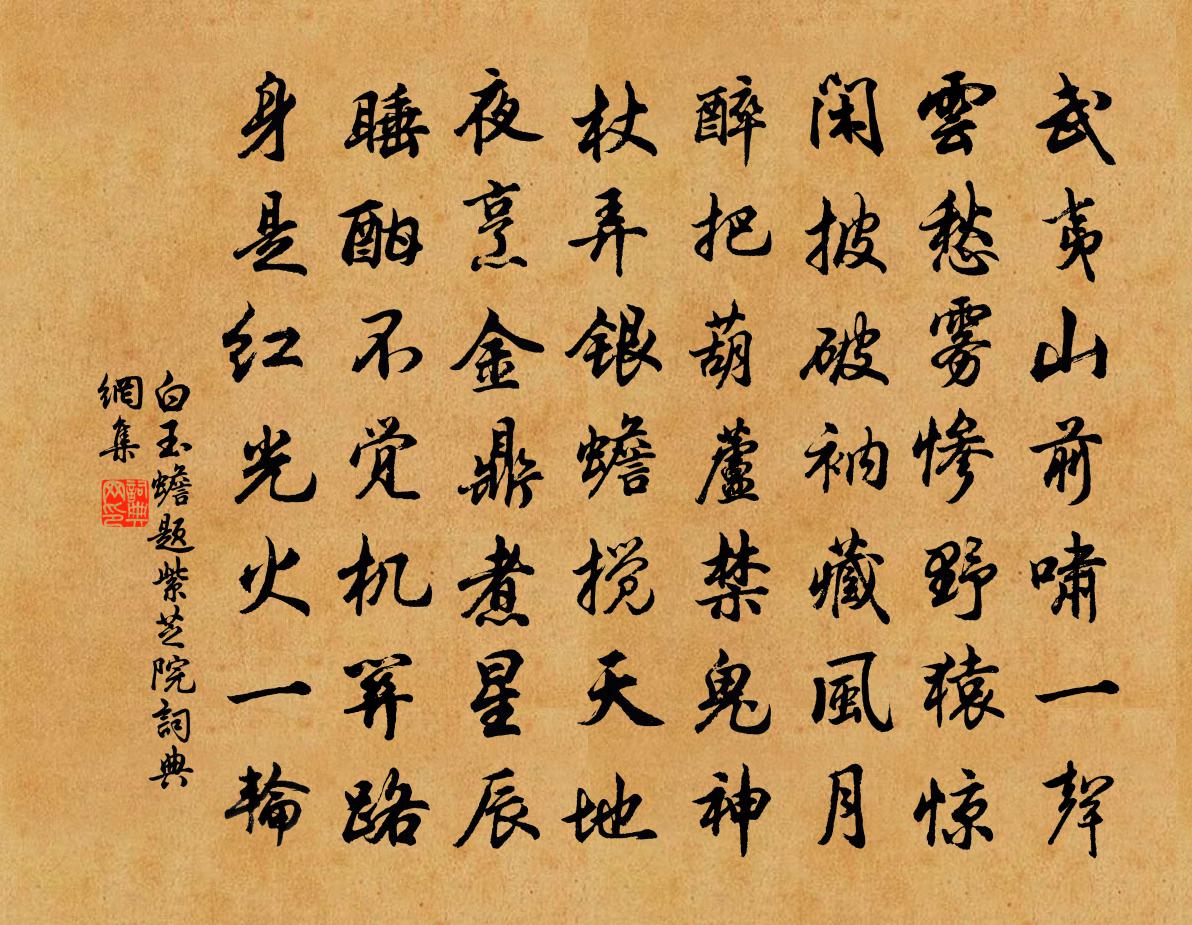 詩詞名句歷史字典書法欣賞書法字典國語詞典說文解字康熙字典古漢語字典標 題 作 者 詩 句 題紫芝院作者:白玉蟾 朝代:宋代題紫芝院原文武夷山前嘯一聲,雲愁霧慘野猿驚。閒披破衲藏風月,醉把葫蘆禁鬼神。杖弄銀蟾攪天地,夜烹金鼎煮星辰。睡酣不覺機關路,身是紅光火一輪。詩詞問答問:題紫芝院的作者是誰?答:白玉蟾問:題紫芝院寫於哪個朝代?答:宋代問:題紫芝院是什麼體裁?答:七古白玉蟾題紫芝院書法欣賞題紫芝院書法作品詩詞推薦叢桂軒四首老翠趙崇璡〔宋代〕霓裳阿妹舞婆娑,老翠連雲秀復華。露令山房籠月色,風清池館落天葩。分來竇氏三秋種,斧罷吳生幾樹花。莫訝句翁卷〔宋代〕官曆春猶淺。良月二十一日郡庠置酒爐亭勞余出山且取子美陳著〔宋代〕蘭菊不競芳,鴻燕各有時。可以人不如,大哉義曰隨。頌古二十首釋了一〔宋代〕烏臼分明棒有眼,這僧直是眼無筋。假饒打著百千個,切莫將伊掛齒唇。無題·鳳尾香羅薄幾重李商隱〔唐代〕鳳尾香羅薄幾重,碧文圓頂夜深縫。扇裁月魄羞難掩,車走雷聲語未通。曾是寂寥金燼暗,斷無訊息石榴紅。斑騅行雪趙文〔宋代〕夜寒枕席跳霰珠,夜深我睡霰亦無。未晨仆起縈炊火,怪見滿地瓊瑤鋪。我行至此不得止,但倚紅酒為先驅。路逢對棋與道源至草堂寺王安石〔宋代〕北風吹人不可出,清坐且可與君棋。明朝投局日未晚,從此亦復不吟詩。和周公美韻陳文蔚〔宋代〕風光報答可無詩,漸喜春風熟燕泥。客至甚思留竹隱,書來無奈趣岩棲。幸同故國雲雖暮,郎誦新吟日未西。自愧秋日東風舒岳祥〔宋代〕舊雨黃魚簄,新霜紫蟹{上竹下脯}。吾生了朝夕,何事憶江湖。念奴嬌蘇仲及〔宋代〕問梅何事,對岩東微笑,暗中輕馥。韻絕姿高直下視,紅紫端如童僕。繞樹千回,臨風三嗅,待與論心曲。何人還偈頌一百一十七首釋紹曇〔宋代〕久雨新晴,物情顯煥。蝶弄海棠陰,鶯啼楊柳岸。聲色純正真,不得一半。堪笑靈雲活眼睛,卻被桃花換。啞,瞎夏珪秋江風雨圖乾隆〔清代〕雨絲風片遠連天,一棹漁舟萬頃煙,無事買魚沽酒客,卻繞書畫米家船。南鄉子(壽)張元乾〔宋代〕山寺輞川圖。霜葉雲林錦繡居。壽斝浮春珠翠擁,歡娛。滿院流泉繞綺疏。道氣自膚腴。幾席輕塵一點無。天要耆和谹父小雨秋涼王洋〔宋代〕時豐報祀拂黃收,共說金穰更幾秋。樹染煙濃山著色,月臨天迥水明樓。盈囷黍答三時力,七字詩銷萬斛愁。飽飯戲答宣叔頌黃庭堅〔宋代〕探龍淵,履虎尾。別狐貉,辨蚖虺。頭雪白,心灰死。老斲輪,不教子。君聞此,當洗耳。秋思洪咨夔〔宋代〕一曲玉連瑣,十分金屈巵。故新相代謝,底用為秋悲。登西樓呈桑彥周李新〔宋代〕獨自行藏莫倚欄,市廛野色不相干。是中門戶也羅雀,何處身心更夢棺。錦水背人朝暮去,雪山隨我久長寒。一生漫成三首李商隱〔唐代〕不妨花何范盡詩花家,未解花當年重物華。遠把龍山千里雪,將來擬並洛陽花。沈約憐何遜,延年毀謝莊。清新俱次韻朱光庭初夏蘇軾〔宋代〕朝罷人人識鄭崇,直聲如在履聲中。臥聞疏響梧桐雨,獨詠微涼殿閣風。諫苑君方續承業,醉鄉我欲訪無功。陶然和仲庶夜過新開湖憶沖之仲塗共泛王安石〔宋代〕水遠浮秋色,河空洗夜氛。行隨一明月,坐失兩孤雲。露發此時濕,風顏何處醺。淹留各有趣,不比漢三君。名句推薦華而不實,恥也。左丘明《國語·晉語·秦伯享重耳以國君之禮》 圓荷浮小葉,細麥落輕花。杜甫《為農》 無端嫁得金龜婿,辜負香衾事早朝。李商隱《為有》 君子贈人以言,庶人贈人以財。荀子《荀子·大略》 田家占氣候,共說此年豐。孟浩然《田家元日》 黃河落天走東海,萬里寫入胸懷間。李白《贈裴十四》 而浮生若夢,為歡幾何?李白《春夜宴桃李園序 / 春夜宴從弟桃花園序》 用兵之道,先勝後戰。陳壽《三國志·魏書·荀彧攸賈詡傳》 團扇,團扇,美人病來遮面。王建《宮中調笑·團扇》 夫孝,百行之冠,眾善之始也。范曄《後漢書·列傳·劉趙淳于江劉周趙列傳》