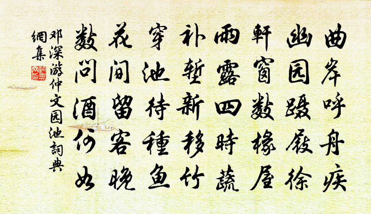 詩詞名句歷史字典書法欣賞書法字典國語詞典說文解字康熙字典古漢語字典標 題 作 者 詩 句 游仲文園池作者:鄧深 朝代:宋代游仲文園池原文曲岸呼舟疾,幽園躡屐徐。軒窗數椽屋,雨露四時蔬。補塹新移竹,穿池待種魚。花間留客晚,數問酒何如。詩詞問答問:游仲文園池的作者是誰?答:鄧深問:游仲文園池寫於哪個朝代?答:宋代鄧深游仲文園池書法欣賞游仲文園池書法作品詩詞推薦宮詞宋白〔宋代〕新生帝子浴漪蘭,三日宮中列綺筵。嬪御稱觴呼萬歲,笙歌一片夜掀天。偈頌一百六十首釋宗杲〔宋代〕投子下繩床,今朝為舉揚。驢前馬後漢,切忌亂承當。雪中梅竹圖家鉉翁〔宋代〕梅兄乃我義理朋,竹友從我林壑游。青青不受塵土涴,皓皓肯與紅紫侔。別來天涯今幾載,老大相逢俱白頭。玉龍紹興享先農十一首佚名〔宋代〕莫重於祭,非禮不成。籩豆有踐,爾餚既聲。神具醉止,薦以齊明。贊入也時,釐事斯成。賦劉子澄墨莊趙蕃〔宋代〕勤力漢疏傅,遺安龐德公。公家業異此,衰盛國應同。邊情張蠙〔唐代〕窮荒始得靜天驕,又說天兵擬渡遼。聖主尚嫌蕃界近,將軍莫恨漢庭遙。草枯朔野春難發,冰結河源夏半銷。惆悵張似之送栗子木瓜張鎡〔宋代〕帶日零風色未乾,肯隨槃俎斗斕斑。客爐爆處從氈破,女手批時忌蜜慳。甘園杜甫〔唐代〕春日清江岸,千甘二頃園。青雲羞葉密,白雪避花繁。結子隨邊使,開筒近至尊。後於桃李熟,終得獻金門。題趙園宗澤〔宋代〕鑿池智有泉源,種木胸無芥蒂。螭頭吐水涓涓,端是銀潢一派。喜晴趙蕃〔宋代〕掃除詩癖未能空,從使人譏手病風。事業深虞一無就,壯顏都有幾時紅。挽沈叔晦國錄孫應時〔宋代〕庭靜汲長孺,官師蕭望之。士能令國重,吾意匪公誰。朱紱江湖遠,蒼顏疾病衰。堂堂竟如此,造物爾胡為。暖甚去綿衣趙蕃〔宋代〕誰道江南春有寒,未經社日衣能單。桑麻過雨日夜長,桃李因風高下殘。舊說中州政如此,了知瘴氣不能幹。天公寄宿倅陸經子履王令〔宋代〕勳業悠悠未可貪,直須隨處酌醺酣。君知仕路三無慍,我與人情七不堪。聞借朱衣為別乘,想回青眼憶高談。東風品令佚名〔宋代〕山重雲起。斷橋外、池塘水。曉來風定,竹枝相亞,殘陽影里。多少風流,都在冷香疏蕊。江南千里。問折得、誰述懷嚴含質〔唐代〕昔為仙子今為虎,流落陰崖足風雨。更將斑毳被余身,千載空山萬般苦。水龍吟(題夢雲軒)周紫芝〔宋代〕楚山千疊浮空,楚雲只在巫山住。鸞飛鳳舞,當時空記,夢中奇語。曉日曈日龍,夕陽零亂,裊紅縈素。問如今依石竺山二十詠劉克莊〔宋代〕自飢猶可忍,民飢誰惻隱。吾評首陽薇,不若石竺筍。劉公詩孔武仲〔宋代〕原甫吾不識,聞之士大夫。少時已絕群。卓牽千里駒。讀書足智慮,萬卷力有餘。善發六藝蘊,高談詆先儒。天文夜檢故書得孫季蕃詞有懷其人二首劉克莊〔宋代〕中年豪宕以詞行,醉墨淋漓一座傾。昔競捧箋求少蘊,今誰瀝酒吊耆卿。戴花起舞生無悶,薦菊為餚死亦清。愁絕水龍吟(海棠)王沂孫〔宋代〕世間無此娉婷,玉環未破東風睡。將開半斂,似紅還白,餘花怎比。偏占年華,禁菸才過,袷衣初試。嘆黃州一夢名句推薦丹桂不知搖落恨,素娥應信別離愁。王琪《望江南·江南月》 至長反短,至短反長,天之道也。呂不韋《呂氏春秋·論·似順論》 禍在於好利;害在於親小人尉繚《尉繚子·十二陵》 耿斜河、疏星淡月,斷雲微度。張元乾《賀新郎·送胡邦衡待制赴新州》 末路驚風雨,窮邊飽雪霜文天祥《除夜》 何處它年寄此生,山中江上總關情。虞集《院中獨坐》 聞道春還未相識,走傍寒梅訪訊息。李白《早春寄王漢陽》 田園寥落干戈後,骨肉流離道路中。白居易《望月有感》 家童掃蘿徑,昨與故人期。錢起《谷口書齋寄楊補闕》 所謂伊人,在水一方。佚名《蒹葭》