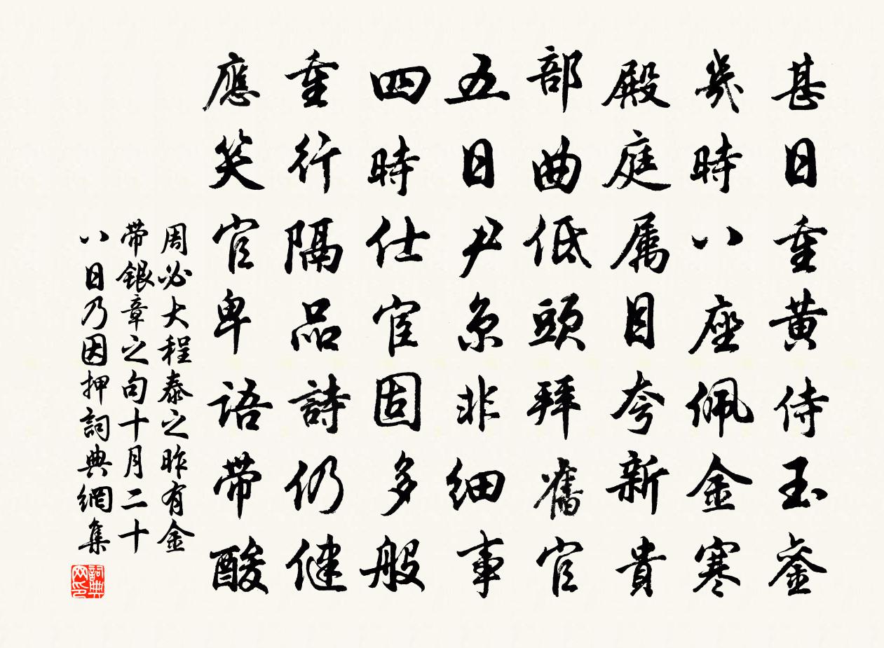詩詞名句歷史字典書法欣賞書法字典國語詞典說文解字康熙字典古漢語字典標 題 作 者 詩 句 程泰之昨有金帶銀章之句十月二十八日乃因押作者:周必大 朝代:宋代原文甚日重黃侍玉鑾,幾時八座佩金寒。殿庭屬目夸新貴,部曲低頭拜舊官。五日尹京非細事,四時仕宦固多般。重行隔品詩仍健,應笑官卑語帶酸。詩詞問答問:《程泰之昨有金帶銀章之句十月二十八日乃因押》的作者是誰?答:周必大問:該詩寫於哪個朝代?答:宋代書法欣賞程泰之昨有金帶銀章之句十月二十八日乃因押書法作品詩文賞析【原題】:程泰之昨有金帶銀章之句十月二十八日乃因押伴北使赤岸御筵服重金侍宴紫宸殿坐間嘗作數語為戲後兩日復得其詩亦再次韻詩詞推薦雜劇·朱太守風雪漁樵記佚名〔元代〕第一折(沖末扮王安道上,詩云)一葉扁舟系柳梢,酒開新瓮鮓開包。自從江上為漁父,二十年來手不抄。老漢會鯨川八景蓮塘雨聲家鉉翁〔宋代〕贏得荷風伴晚涼,夜闌急雨到陂塘。茅檐似減三分暑,鼻觀俄然失卻香。水月亭馬俌〔宋代〕陽來毛中坤坎波毛翻,月本毛於地仍東毛還。誰為聚之古祗柏,涵碧湛湛琉璃盤。珊瑚晶瑛澈凝湍,西風晚來覺亦【南呂】金字經_梅邊雪冷松吳鎮〔元代〕梅邊雪冷松邊路,月寒湖上村,縹緲梨花入夢雲。巡,小檐芳樹春。江梅信,翠禽啼向人。游靈壁蘭皋園賀鑄〔宋代〕集仙昔榮養,卜築循蘭陔。深徑萬株合,清池百畝開。飛梁蔭菡萏,攢棟跨崔嵬。淮海劚紅藥,瀟湘移翠栽。岱松送僧仲剬東遊兼寄呈靈澈上人劉禹錫〔唐代〕釋子道成神氣閒,住持曾上清涼山。晴空禮拜見真像,金毛五髻卿雲間。西遊長安隸僧籍,本寺門前曲江碧。松間騷詞二章釋善珍〔宋代〕獲印兮汾陽,結茆兮湘之崗。湘之岳兮帝宮謁帝,帝不敢驕兮奔魑魅而走蜚龍。余行兮余意,一笑兮足驚一世。人春日六言十二首劉克莊〔宋代〕褵褷病鶴翅短,虺隤老馬力疲。不知大翰會事,且吟小家數詩。陽關詞三首 贈張繼願蘇軾〔宋代〕受降城下紫髯郎,戲馬台南古戰場。恨君不取契丹首,金甲牙旗歸故鄉。冬夜寓居寄儲太祝(一作薛據詩)綦毋潛〔唐代〕自為洛陽客,夫子吾知音。盡義能下士,時人無此心。奈何離居夜,巢鳥悲空林。愁坐至月上,復聞南鄰砧。次韻志歸十首方回〔宋代〕添竹復添花,清陰一倍加。病身思灼艾,暑節近浮瓜。晚景今如許,初心豈有他。甘貧仍守拙,肯羨五侯家。賀俞婺州除左史林宗放〔宋代〕報政天邊美譽新,十行細札下嚴宸。逢人政爾詢司馬,縱俗何由借寇恂。制勝萬全端有道,折衝一點是精神。向來看蔣玉父有珍炙膏肓王邁〔宋代〕炷勻劇炎火,端躬如泰山。醫師工指授,豎子覺毛寒。鐵脊樑須壯,銀河水不乾。明知寧忍痛,絕欲信為難。送洪季陽分教橫州嫌呈丁師二首劉宰〔宋代〕仕有為貧難擇地,志將及物要乘時。青衫入手南中去,此意惟應我輩知。南歌子楊無咎〔宋代〕笛噴風前曲,歌翻意外聲。年來老子厭風情。可是於君一見、眼雙明。枕臂聽殘漏,停杯對短檠。直教筆底有文星詠圓通崇勝院崔鶠〔宋代〕崢嶸廬山高,下看三江水。青天瀑布飛,白日看煙起。人家閒崦口,石道喬松底。似窺仙剎麗,翠影亂螭尾。亭亭頌古一○一首釋子淳〔宋代〕家家門掩蟾蜍月,處處鶯啼楊柳風。若謂縱橫無變異,猶如擲劍擬虛空。雨中游法王寺詩李廌〔宋代〕雨腳如麻未肯收,雨中還作法王游。雲埋輦路煙初合,水濺松岩雪亂流。心畏險途常恐失,寒侵病骨已知秋。群峰浣溪沙蔡伸〔宋代〕淺褐衫兒壽帶藤。碾花如意枕冠輕。鳳鞋弓小稱娉婷。約略梳妝隨事好,出塵標韻出塵清。一枝梅映玉壺冰。令狐員外宅宴寄中丞韓翃〔唐代〕寒色凝羅幕,同人清夜期。玉杯留醉處,銀燭送歸時。獨坐隔千里,空吟對雪詩。名句推薦微微風簇浪,散作滿河星。查慎行《舟夜書所見》 紅樓隔雨相望冷,珠箔飄燈獨自歸。李商隱《春雨》 何用慰相思,裁書寄關右。李益《送諸暨王主簿之任》 城小賊不屠,人貧傷可憐元結《賊退示官吏》 兵者詭道,善因事變。房玄齡《晉書·帝紀·第一章》 寺憶曾游處,橋憐再渡時。杜甫《後游》 月既不解飲,影徒隨我身。李白《月下獨酌四首·其一》 嫦娥應悔偷靈藥,碧海青天夜夜心。李商隱《嫦娥》 夜寒不近流蘇,只憐他、後庭梅瘦。毛滂《上林春令·十一月三十日見雪》 永豐柳,無人盡日飛花雪。張先《千秋歲·數聲鶗鴂》