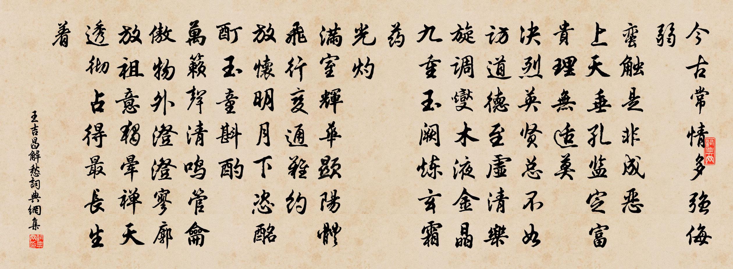 詩詞名句歷史字典書法欣賞書法字典國語詞典說文解字康熙字典古漢語字典標 題 作 者 詩 句 解愁作者:王吉昌 朝代:元代解愁原文今古常情,多強侮弱。蠻觸是非成惡。上天垂孔監,定富貴理無適莫。決烈英賢,總不如訪道德,至虛清樂。旋調燮、木液金晶,九重玉闕,煉玄霜藥。光灼。滿室輝華,顯陽體飛行,變通難約。放懷明月下,恣酩酊、玉童斟酌。萬籟聲清鳴管龠。傲物外、澄澄寥廓。放祖意獨暈,禪天透徹,占得最長生著。詩詞問答問:解愁的作者是誰?答:王吉昌問:解愁寫於哪個朝代?答:元代問:解愁是什麼體裁?答:詞王吉昌解愁書法欣賞解愁書法作品詩詞推薦不赴宴贈丘妓白玉蟾〔宋代〕舞拍歌聲妙不同,笑攜玉斚露春蔥。梅花體態香凝雪,楊柳腰肢瘦怯風。螺髻雙鬟堆淺翠,櫻唇一點弄嬌紅。白鷗謝王丞餉臨漳火山綠筍陳宓〔宋代〕撫民無術知何補,空負家山幾度秋。豈有甘涼來可口,但知朱墨苦埋頭。近城好景頻須到,適意新詩底用搜。從此閉門陸游〔宋代〕閉門何所樂,聊息此生勞。霜薄殘蕪綠,風酣萬木號。研朱點周易,飲酒讀離騷。斷盡功名念,非關快剪刀。大觀祀社稷九首佚名〔宋代〕坤元生物,公里相宣。蠲茲祀事,美報致虔。清酤芬如,靈壇巋然。酌尊奠觴,神其格焉。點絳唇(生朝)張元乾〔宋代〕嵩洛雲煙,間生真相耆英裔。要知鮐背。難老中和氣。報導玉堂,已草調元制。華夷喜。繡裳貂珥。便向東山起。聲聲慢侯善淵〔元代〕人心剛硬,不肯回頭。深沉苦海淹留。酒色財氣不捨,甚日方休。聞早尋歸出路,樂陶陶、雲水閒遊。無縈系,也寓杭久無詩長至後偶賦懷歸五首呈仁仲實方回〔宋代〕同雲欲雪暮天陰,濁酒樓頭手自斟。漫仕偶嘗叨五馬,倦遊何止喪千金。盡捐寓宅償逋負,僅保殘書伴嘯吟。從此滿路花(和秋風吹渭水)黃裳〔宋代〕乾坤生古意,草木起秋聲。移人名利境,夢中驚。便尋靈寶,鳳髓與龜精。密報黃芽就,紫府門開,道情有個鶯鶯菩薩蠻(初夏)趙長卿〔宋代〕方池新漲蒲萄綠。曉來雨過花如浴。測測杏園風。梢頭一捻紅。危樓愁獨倚。一寸心千里。宿酒尚微醺。懶裝堆髻賢八詠濂溪愛蓮姚勉〔宋代〕斯蓮君子花,幾為佛所污。先生獨拈出,萬世知嚮慕。贈鄧漢卿趙師秀〔宋代〕單獨一身長不定,亦無書卷得相隨。忙過人世當閒日,老遇朝廷用少時。沖雪自言行路苦,看松長恨買山遲。蕭蕭伯氏臨江使君寄薌林次韻王洋〔宋代〕君王勸駕一輕舟,惕履西江飽勝游。井邑詩書今化魯,春秋盟會不書鄒。詩中侯印知無分,筆下尊拳勿太遒。快讀凍頭王氏藝芳堂周必大〔宋代〕一聞編簡香,如入芝蘭室。況將百尺樓,高貯三萬帙。清芬藹階庭,賸馥沾黨術。從渠海上夫,顛倒放李赤。和趙靜樂梅韻鄭清之〔宋代〕司寒駕天騁軌力,凍合冰蠶不成織。皮膚皸瘃雪滿衣,真人恬漠與道息。一花挺出萬木僵,其友松筠乃能識。清香故山陸游〔宋代〕禹祠行樂盛年年,繡轂爭先罨畫船。十里煙波明月夜,萬人歌吹早鶯天。花如上苑常成市,酒似新豐不直錢。老子都下竹枝詞方文〔清代〕自古長安似弈棋,一番客到一番悲。許多大老休官去,幾個名娼又嫁誰?同鄭子野訪王隱居戴復古〔宋代〕聯騎來尋失馬翁,相期投宿此山中。一庭花影三更月,萬壑松聲半夜風。共把酒杯眠不得,劇談世事恨無窮。明朝次韻曾子開從駕二首蘇軾〔宋代〕槐街綠暗雨初勻,瑞霧香風滿後塵。清廟幸同觀濟濟,豐年喜復接陳陳。雍容已饜天庖賜,俯伏初嘗貢茗新。輦路鷓鴣天朱淑真〔宋代〕獨倚闌乾晝日長。紛紛蜂蝶斗輕狂。一天飛絮東風惡,滿路桃花春水香。當此際,意偏長。萋萋芳草傍池塘。千鍾紹興朝日十首佚名〔宋代〕[黃鐘為角]升暉麗天,陽德之母。率無頗偏,兼燭下土。恭事崇壇,禮樂具舉。頓御龍,裴回容興。名句推薦老去悲秋強自寬,興來今日盡君歡。杜甫《九日藍田崔氏莊》 楊柳乍如絲,故園春盡時。納蘭性德《菩薩蠻·問君何事輕離別》 象龍喚不應,竹龍起行雨張孝祥《湖湘以竹車激水粳稻如雲書此能仁院壁》 或理在方寸而求之域表,或義在咫尺而思隔山河。劉勰《文心雕龍·神思》 斟酌乎質文之間,而隱括乎雅俗之際,可與言通變矣。劉勰《文心雕龍·通變》 本來無一物,何處惹塵埃!惠能《菩提偈》 郎騎竹馬來,繞床弄青梅。李白《長干行二首》 人孰無親,罪人慎察其宗。來俊臣《羅織經·固榮卷第六》 開花必早落,桃李不如松。李白《箜篌謠》 不似秋光,只與離人照斷腸。蘇軾《減字木蘭花·春月》