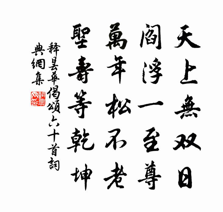 詩詞名句歷史字典書法欣賞書法字典國語詞典說文解字康熙字典古漢語字典標 題 作 者 詩 句 偈頌六十首作者:釋曇華 朝代:宋代偈頌六十首原文天上無雙日,閻浮一至尊。萬年松不老,聖壽等乾坤。詩詞問答問:偈頌六十首的作者是誰?答:釋曇華問:偈頌六十首寫於哪個朝代?答:宋代釋曇華偈頌六十首書法欣賞偈頌六十首書法作品詩詞推薦天都峰范成大〔宋代〕維帝有下都,作鎮此南國。孤撐紫玉樓,橫絕太霄碧。晶熒砂竇紅,夭矯泉紳白。晴雲無盡藏,竟日裊幽石。諸峰水調歌頭(壽武公望)廖行之〔宋代〕韓國武中令,公望乃雲孫。平生壯志,凜凜長劍倚天門。鬱積胸中謀慮,慷慨尊前談笑,袖手看風雲。唾手功名事宮詞宋白〔宋代〕水心高殿接蘭塘,才拂龍鬚一簟涼。瑟瑟枕函雲母帳,冰盤仙果近人香。繡薄眉佚名〔宋代〕化愚魯。拋離火院夫兒女。憑慧劍、斬斷三塗。人我山崩,是非海己枯。舊業消除,新殃不做。句杜偉〔唐代〕忽睹邢武辭,泠其金石備。減字木蘭花謝逸〔宋代〕疏疏密密,薝蔔林中飛玉出。妒舞欺梅。悠揚隨風去卻回。遙岑玉刻,不見雲中浮寸碧。夜色清妍。庭下交光月午舟中即事三首鄧深〔宋代〕兩岸農家各自耕,相過正欠小舟撐。牧童來往如平地,騎得吳牛入水行。送樞密使樓先生還鄉王用〔宋代〕輔治皇朝已有年,一朝辭老意乾乾。滿京朱紫鹹懷德,設席城門表大賢。別酒斟來須罄盞,陽關迭唱促開船。於今游清潭呂資益蟠谷絕啜羹劉過〔宋代〕香不求知色正青,青於九畹見飄零。山中若有離騷伴,痛飲吾知勝獨醒。次茂洪韻張鎡〔宋代〕披嵐長嘯和岩洞,衣汗未冷毛髮知。貪奇甘戀足欲駐,擁鼻將返心還疑。清音來賢只過目,亭下樹邊俱欠詩。歸輿重題西明寺牡丹 時元九在江陵。白居易〔唐代〕往年君向東都去,曾嘆花時君未回。今年況作江陵別,惆悵花前又獨來。只愁離別長如此,不道明年花不開。菩薩蠻(四)韋莊〔唐代〕權君今夜須沉醉,尊前莫話明朝事。珍重主人心,酒深情亦深。須愁春漏短,莫訴金杯滿。遇酒且呵呵,人生能幾琅琊山六題班春亭歐陽修〔宋代〕信馬尋春踏雪泥,醉中山水弄清輝。野僧不用相迎送,乘興閒來興盡歸。冬日放言二十一首張耒〔宋代〕靈通古叢林,他日休吾車。出門循古城,荒圃畦寒蔬。手種堂下花,頗已數尺余。何人攬其華,故人應念予。送孔先生還山韓維〔宋代〕先生花樂道者,花於世澹無欲。高風自絕人,正行不違俗。朅來城闕游,不受麈事觸。目久望林壑,駕言反幽築。聲聲慢(殘夢和兒韻)趙功可〔宋代〕情痴倦極,天闊歸遲,吟魂無力隨風。月落牆陰,一屏睡睫濛濛。邯鄲平生難記,記花前、猶醉金鍾。留連處,忽又和風雨二首楊萬里〔宋代〕東風未得顛如許,定被春光引得顛。脕雨何妨略彈壓,不應猶自借渠權。風風雨雨又春窮,白白朱朱已眼空。拚卻寄陸務觀楊萬里〔宋代〕君居東浙我江西,鏡里新添幾縷絲。花落六回疏信息,月明千里兩相思。不應李杜翻鯨海,更羨夔龍集鳳池。道是早過何郎陸九齡〔宋代〕蕭蕭風雨曉籃輿,沒脛泥深我仆痡。卻憶去年苗欲槁,任從行李且虛徐。如夢令馮延巳〔唐代〕塵拂玉台鸞鏡,鳳髻不堪重整。綃帳泣流蘇,愁掩玉屏人靜。多病,多病,自是行雲無定。名句推薦窮巷多怪,曲學多辯。商鞅《商君書·更法》 回首天涯,一抹斜陽,數點寒鴉。張可久《折桂令·九日》 四十年來家國,三千里地山河李煜《破陣子·四十年來家國》 北風吹雪四更初,嘉瑞天教及歲除。陸游《除夜雪》 如來說諸心皆為非心是名為心。鳩摩羅什譯《金剛經·一體同觀》 青春須早為,豈能長少年。孟郊《勸學》 遲日園林悲昔游,今春花鳥作邊愁。杜審言《渡湘江》 攜扙來追柳外涼,畫橋南畔倚胡床。秦觀《納涼》 坐愁群芳歇,白露凋華滋。李白《秋思》 夫禮之初,始諸飲食戴聖《禮記·禮運》