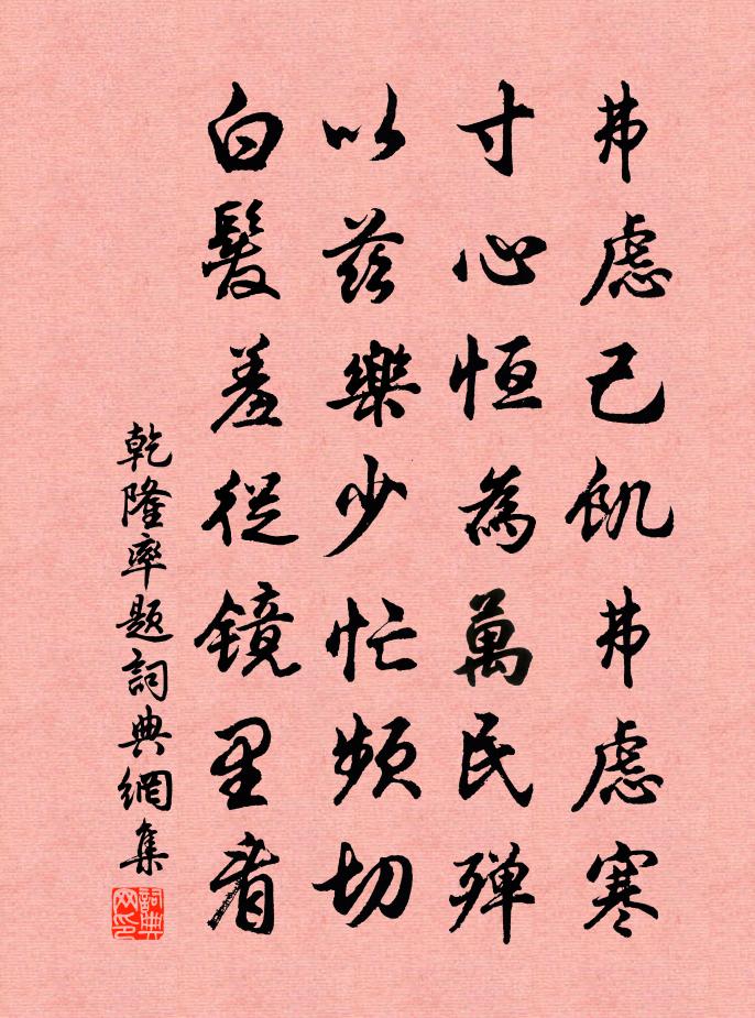 詩詞名句歷史字典書法欣賞書法字典國語詞典說文解字康熙字典古漢語字典標 題 作 者 詩 句 率題作者:乾隆 朝代:清代率題原文弗慮己飢弗慮寒,寸心恆為萬民殫。以茲樂少忙頻切,白髮羞從鏡里看。詩詞問答問:率題的作者是誰?答:乾隆問:率題寫於哪個朝代?答:清代乾隆率題書法欣賞率題書法作品詩詞推薦琴曲歌辭別鵠操韓愈〔唐代〕雄鵠銜枝來,雌鵠啄泥歸。巢成不生子,大義當乖離。江漢水之大,鵠身鳥之微。更無相逢日,安可相隨飛。送顏幾聖龍學尚書出守泉州二首楊萬里〔宋代〕我昔綾衾下直時,公為壁水大宗師。清風明月行樂耳,布襪青鞋隨所之。顛倒壺觴留落日,翻騰山水入新詩。我來再和秉國約游石淙司馬光〔宋代〕上國分攜十五秋,未嘗偶坐捧茶甌。石淙今會須如約,彼此相毛各滿頭。旅宿杜牧〔唐代〕旅館無良伴,凝情自悄然。寒燈思舊事,斷雁警愁眠。遠夢歸侵曉,家書到隔年。滄江好煙月,門系釣魚船。上游參預壽二首程公許〔宋代〕河流貫陝啊,底柱自中立。江水迸瞿唐,灩澦制其溢。豈此一拳多,雲根必奇質。檜柏相因依。煙霞老山澤。必世唐多令 懷高沙張之翰〔元代〕往事水東流。槐根春夢休。被長淮、隔斷中州。三十六湖湖上住,卻又過、一年秋。佳處總堪游。同盟只數鷗。把次徐隆慶壽詩韻二首洪咨夔〔宋代〕牛奪箕張小丙申,熟知命駁不能純。年來頗怪刀頭蜜,老去難供席上珍。闖靄千章森戟纛,鏖鳳萬壑繹韻鈞。劍山再和易後韻為前韻六首衛宗武〔宋代〕西風葉滿庭,欹枕聽鳴雨。悽然百感生,愁緒未易數。思昔詠乾旌,良馬素絲組。今為白屋夫,低頭拜官府。猶喜宜春漫述汪應辰〔宋代〕本是扶犁客,隨緣漫作官。故山應念我,薇蕨已闌乾。沁園春侯善淵〔元代〕啟訴芳年,猛悟回頭,縱情任真。棄父娘兄嫂,妻男侄女,孤雲野鶴,二十餘春。風瑞漂萍,隨方安分,一任交人和范公希文懷慶朔堂曹經〔宋代〕池館名公舊日栽,幾番零落又春開。誰人解識紅芳意,猶有多情五馬來。郭文舉祠釋文珦〔宋代〕封禺山水國,曾是郭文游。列岫開新障,平川合眾流。丹青遺像在,松竹古祠秋。雖不逢堯禪,高風似許由。雪效柳子厚晃沖之〔宋代〕月落雞聲寒,曉色靜茅屋。開門驚不知,夜雪壓修竹。槎牙生新冰,鱗甲刻溪谷。皛皛洲渚明,冽冽川原肅。孤蹲再和勸學韻鄭清之〔宋代〕仕學優於服田力,公儀之家廢葵織。詩書為府道德林,樂在藏修洎游息。濃薰班馬有餘香,暗摸曹劉豈難識。插架詠興五首。小庭亦有月白居易〔唐代〕小庭亦有月,小院亦有花。可憐好風景,不解嫌貧家。菱角報笙簧,谷兒抹琵琶。紅綃信手舞,紫綃隨意歌。[菱子夜四時歌·春林花多媚佚名〔南北朝〕春林花多媚,春鳥意多哀。春風復多情,吹我羅裳開。見鶯三首白玉蟾〔宋代〕鮮怡寡樂負清明,簾外花如紅淚傾。又是殘春將立夏,如何到處不啼鶯。朝中措韓淲〔宋代〕薰風兩節照稽山。三百里湖間。鏡上誰為賀老,棹船能伴官閒。今年壽日,不妨吟嘯,還上清班。為寄長生新曲,玉爐三澗雪 自詠丘處機〔元代〕夜宿溪古廟,曉登竹徑荒村。日中無事餒巡門。淡飯求佗一頓。不會深窮造化,隨緣且度朝昏。是非人我絕談論生查子(史輔之席上歌者贈《雲頭香乞詞》)高觀國〔宋代〕蓬萊一捻雲,徹骨龍涎染。風味韻而芳,笑語柔而婉。花嬌綠鬢寒,酒凝清歌怨。翠幄已煙濃,銀燭重休翦。名句推薦豆雨聲來,中間夾帶風聲。蔣捷《聲聲慢·秋聲》 小桃無主自開花,菸草茫茫帶曉鴉。戴復古《淮村兵後》 笙歌散後酒初醒,深院月斜人靜。司馬光《西江月·寶髻松松挽就》 治國無法則亂,守法而弗變則悖,悖亂不可以持國。呂不韋《呂氏春秋·覽·慎大覽》 明月別枝驚鵲,清風半夜鳴蟬。辛棄疾《西江月·夜行黃沙道中》 日色已盡花含煙,月明欲素愁不眠。李白《長相思三首·其二》 春水碧於天,畫船聽雨眠。韋莊《菩薩蠻·人人盡說江南好》 軍中無戲言羅貫中《三國演義·第二十五回》 不虛美,不隱惡司馬光《資治通鑑·唐紀·唐紀十三》 已知泉路近,欲別故鄉難。夏完淳《別雲間》