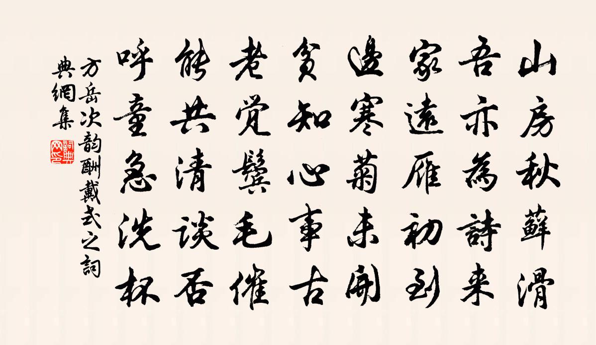 詩詞名句歷史字典書法欣賞書法字典國語詞典說文解字康熙字典古漢語字典標 題 作 者 詩 句 次韻酬戴式之作者:方岳 朝代:宋代次韻酬戴式之原文山房秋蘚滑,吾亦為詩來。家遠雁初到,邊寒菊未開。貧知心事古,老覺鬢毛催。能共清談否,呼童急洗杯。詩詞問答問:次韻酬戴式之的作者是誰?答:方岳問:次韻酬戴式之寫於哪個朝代?答:宋代方岳次韻酬戴式之書法欣賞次韻酬戴式之書法作品詩詞推薦中牟縣旅王禹偁〔宋代〕古縣日初沉,軺車忽見尋。不將遷客累,方認故人心。無酒銷寒漏,挑燈聽遠砧。郟郊重里路,並轡未妨吟。賀新郎·用前韻送杜叔高辛棄疾〔宋代〕細把君詩說。悵餘音、鈞天浩蕩,洞庭膠葛。千尺陰崖塵不到,惟有層冰積雪。乍一見、寒生毛髮。自昔佳人多薄磔鴆楊維楨〔元代〕蘄州鬼,鬼來惡。蘄州鴆,鴆何凶。聲如萬腰鼓,百鳥不敢鳴。委地一片羽,百草不敢生。如何崇家柵養相夸矜。寄宋嗣宗晁公溯〔宋代〕蜀江自嶓冢,流惡及丘原。寧止數斗泥,乃有千丈渾。帝選高才郎,遠來乘輶軒。悽然在川上,會思澄其源。重部秋思陸游〔宋代〕山步溪橋又早秋,飄然無處不堪游。僧廊偶為題詩入,魚市常因施藥留。和鍾西耘庶常德祥律門感懷詩黃遵憲〔清代〕雷動星馳入貢車,舌人環列護爻閭。但占風雨都來享,偶斷苞茅便問諸。宅北曾分羲仲命,綏南遠賜趙佗書。盟津晚髮長蘆晁補之〔宋代〕船頭勾曲洪濤外,船尾長蘆白霧中。千里山容初上日,一江帆影盡乘風。和王夷仲雪中見貽吳芾〔宋代〕歲晚端居寂寞濱,雪花零亂更愁人。捲簾已覺青山老,入座仍添白髮新。寫景自憐佳句少,論交還喜宿心親。來詩通川客舍鄭谷〔唐代〕奔走失前計,淹留非本心。已難消永夜,況復聽秋霖。漸解巴兒語,誰憐越客吟?黃花徒滿手,白髮不勝簪。送鄭山人歸山王建〔唐代〕玉作車轅蒲作輪,當初不起潁陽人。一家總入嵩山去,天子何因得諫臣。南湖有懷遂初尤公侍郎寄贈七言張鎡〔宋代〕停驂曾送柳邊舟,忽忽今冬病故秋。望遠溪山常入夢,寫殘書信只成愁。明心坐斷三千佛,謁帝行歸十二樓。臨水春日行李白〔唐代〕深宮高樓入紫清,金作蛟龍盤繡楹。佳人當窗弄白日,弦將手語彈鳴箏。春風吹落君王耳,此曲乃是升天行。因出南嶽陶弼〔宋代〕祝融何峻極,下看白雲根。絕頂人稀,諸峰勢獨尊。闊能遮日域,高不避天閽。觀盆池白蓮齊己〔唐代〕素萼金英噴露開,倚風凝立獨徘徊。應思瀲灩秋池底,更有歸天伴侶來。次公卷韻吳則禮〔宋代〕故人已去逐飛蓬,醉墨新辭手自封。欲識暮年魂斷處,從今不忍聽霜鍾。更漏子石孝友〔宋代〕燭銷紅,窗送白。冷落一衾寒色。雞喚起,馬馳行。月昏衣上明。酒香唇,妝印臂。竟夜人人共睡。魂蝶亂,夢鸞祭坦仲履釋文珦〔宋代〕仲履真吾徒,敏慧出流輩。比玉無纖瑕,方珠絕微纇。子心如秋月,皎皎長不昧。子身如閒雲,出處極自在。相從頌古二十九首釋師體〔宋代〕萬里無雲銀漢橫,大方玄路等閒行。阿爺智量世希有,女子圓光頂{左寧右頁}生。雷潭為定講師賦黃庚〔宋代〕縛草為庵枕碧漪, * 長是坐禪時。一聲霹靂驚龍起,布衲蒙頭總不知。次前韻二首司馬光〔宋代〕頭白惜春情更興,花間獨醉競分陰。泉聲醒耳自可樂,不用歌拋滿袖金。名句推薦垂緌飲清露,流響出疏桐。虞世南《蟬》 王者之宰民也,莫不同四海,一遠近, 為父母而子之。令狐德棻《周書·本紀·卷四》 陽月南飛雁,傳聞至此回。宋之問《題大庾嶺北驛》 幅巾藜杖北城頭,捲地西風滿眼愁。陸游《秋晚登城北樓》 待羔兒、酒罷又烹茶,揚州鶴。辛棄疾《滿江紅·和范先之雪》 上無威,下生亂。來俊臣《羅織經·治下卷第三》 隔牖風驚竹,開門雪滿山。王維《冬晚對雪憶胡居士家》 酌酒會臨泉水,抱琴好倚長松。王維《田園樂七首·其七》 年年歲歲望中秋,歲歲年年霧雨愁。曾幾《癸未八月十四日至十六夜月色皆佳》 禍福將至,善必先知之;不善,必先知之。故至誠如神。子思《中庸·第二十四章》