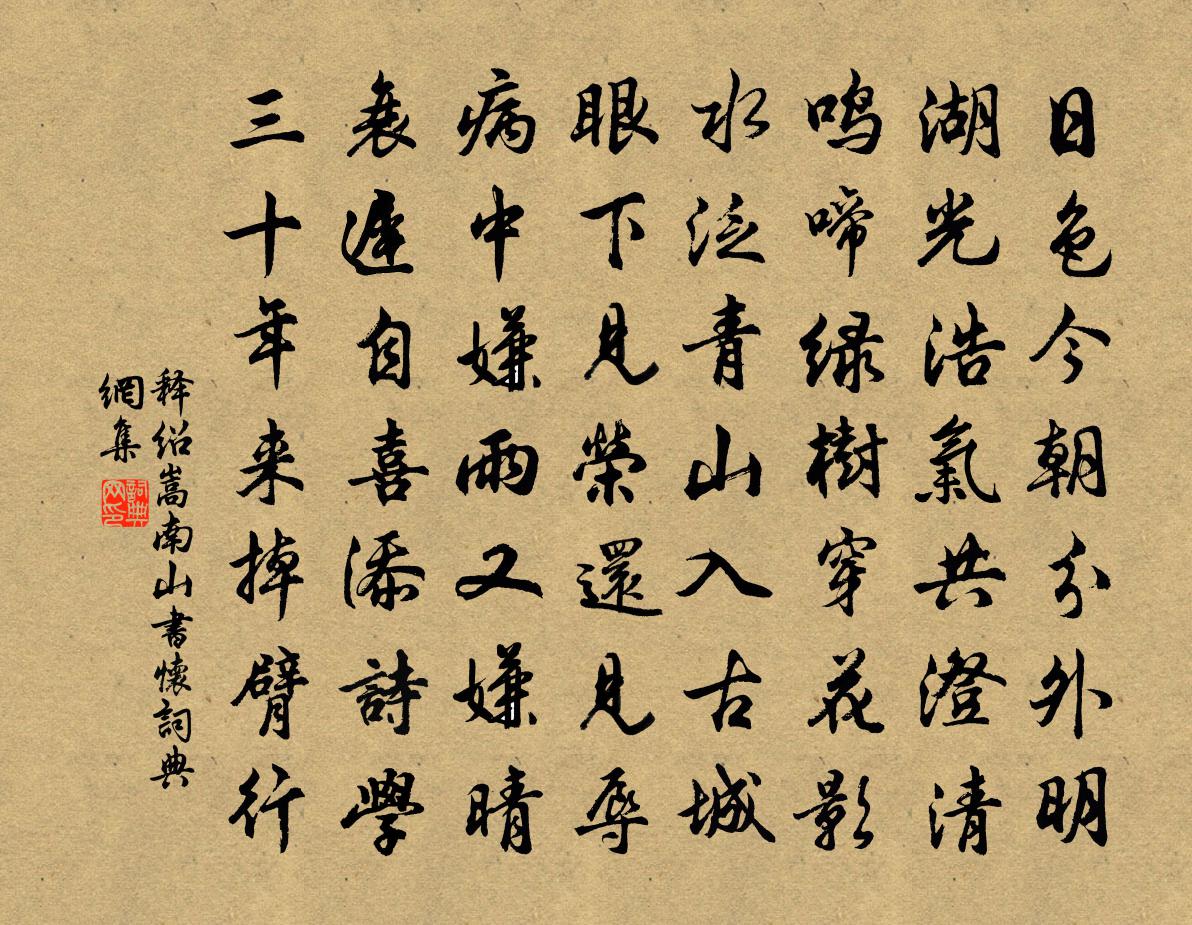 詩詞名句歷史字典書法欣賞書法字典國語詞典說文解字康熙字典古漢語字典標 題 作 者 詩 句 南山書懷作者:釋紹嵩 朝代:宋代南山書懷原文日色今朝分外明,湖光浩氣共澄清。鳴啼綠樹穿花影,水泛青山入古城。眼下見榮還見辱,病中嫌雨又嫌晴。衰遲自喜添詩學,三十年來掉臂行。詩詞問答問:南山書懷的作者是誰?答:釋紹嵩問:南山書懷寫於哪個朝代?答:宋代釋紹嵩南山書懷書法欣賞南山書懷書法作品詩詞推薦會南禪游鄒氏園和知丞韻黃榦〔宋代〕杯酒聯翩臭味同,橫枝疎影費天工。千林落木人煙絕,獨倚斜陽對晚風。游虎丘曾幾〔宋代〕誰能竟日把書看,盪槳扶筇十裡間。未辦深藏豹林谷,不妨時到虎丘山。秋來千頃境絕麗,老矣北窗人極閒。忽見去德清十數里阻冰舟行甚艱趙蕃〔宋代〕常時一夜北新橋,問訊茲來故不遙。豈慮堅冰忽成合,更當冷日未能消。志存紆直無渠怒,行有艱難自我招。賴是東陽涵碧亭(《金華志》:興宗寶曆初令東陽創此亭)於興宗〔唐代〕高低竹雜松,積翠復留風。路劇陰溪里,寒生暑氣中。同太常尉遲博士闕下待漏楊巨源〔唐代〕沈沈延閣抱丹墀,松色苔花顥露滋。爽氣曉來青玉甃,薰風宿在翠花旗。方瞻御陌三條廣,猶覺仙門一刻遲。此地餞吳長文司理用修持賢業教無欠為韻裘萬頃〔宋代〕狂瀾涌如此,砥柱其誰為。天意必有在,吾身姑自持。句祖詠〔唐代〕不知疊嶂夜來雨,清曉石楠花亂流。第一百三十二卷婦病行佚名〔兩漢〕婦病連年累歲,傳呼丈人前一言。當言未及得言,不知淚下一何翩翩。“屬累君兩三孤子,莫我兒飢且寒,有過慎寄同年朱景淵通判八首劉宰〔宋代〕四海游夫了,粹學洞谷今。聞善亟推挽,常恐力不任。時危系長才,白日已西沉。拱木戰寒風,淒其千載心。偈頌十二首釋道璨〔宋代〕天晴蓋卻屋,乘時刈卻禾。輸納王租了,秋冬事轉多。阿呵呵,喚不回頭爭奈何。偈頌一百零二首釋紹曇〔宋代〕撼茶樹,偷筍去。角虎出林,鐵蛇橫路,毒氣炎炎如火聚。眨上眉毛風降臨親,靈跡不在猿啼處。送潁陰張主簿宋庠〔宋代〕早服英雄彀,胡為州縣勞。荊璆不自鬻,郢雪向誰高。月鼓千聲疊,霜風萬竅號。行行星聚國,芳尺慰同袍。詠畫扇詩佚名〔南北朝〕細絲本自輕,弱彩何足眄。直為發紅顏,謬成握中扇。乍奉長門泣,時承柏梁宴。思妝開已掩,歌容隱而見。但畫別友人長孫佐輔〔唐代〕愁多不忍醒時別,想極還尋靜處行。誰遣同衾又分手,不如行路本無情。衢學講堂更名時心和貳車韻車韻五首袁甫〔宋代〕莫道今人不古如,分明氣象魯之洙。坤爻六二知何義,試叩膠庠學易徒。題盧處士山居 / 處士盧岵山居溫庭筠〔唐代〕西溪問樵客,遙識楚人家。古樹老連石,急泉清露沙。千峰隨雨暗,一逕入雲斜。日暮飛鴉集,滿山蕎麥花。吳娃曲陸游〔宋代〕臂上燒香拜佛前,願郎安穩過新年。多情已是長多病,莫要留心在妾邊。和林成之五題江上蘇頌〔宋代〕何處偏傷江上春,天涯失意未歸人。片雲極望添鄉思,孤棹隨波寄客身。塞雁來時憑遠信,海鷗馴處見吾真。休嗟夜投山家陸游〔宋代〕驀溝上阪到山家,牧豎應門兩髻丫。葑火正紅煨竽熟,豈知新貴築堤沙?贈方山人二首吳芾〔宋代〕日者俱雲我未歸,獨君算我有歸期。仍言不出三秋里,東望家山喜可知。名句推薦我本不棄世,世人自棄我。李白《送蔡山人》 秀色掩今古,荷花羞玉顏。李白《西施 / 詠薴蘿山》 夫兩貴之不能相事,兩賤之不能相使,是天數也。荀子《荀子·王制》 啜苦咽甘,茶也。陸羽《茶經·五之煮》 滄江好煙月,門系釣魚船。杜牧《旅宿》 年去年來白髮新,匆匆馬上又逢春。于謙《立春日感懷》 一尺深紅勝麴塵,天生舊物不如新。溫庭筠《南歌子詞二首 / 新添聲楊柳枝詞》 海上生明月,天涯共此時。張九齡《望月懷遠》 菩薩妖精,總是一念。若論本來,皆屬無有。吳承恩《西遊記·第十七回》 荷葉五寸荷花嬌,貼波不礙畫船搖;石濤《荷花》