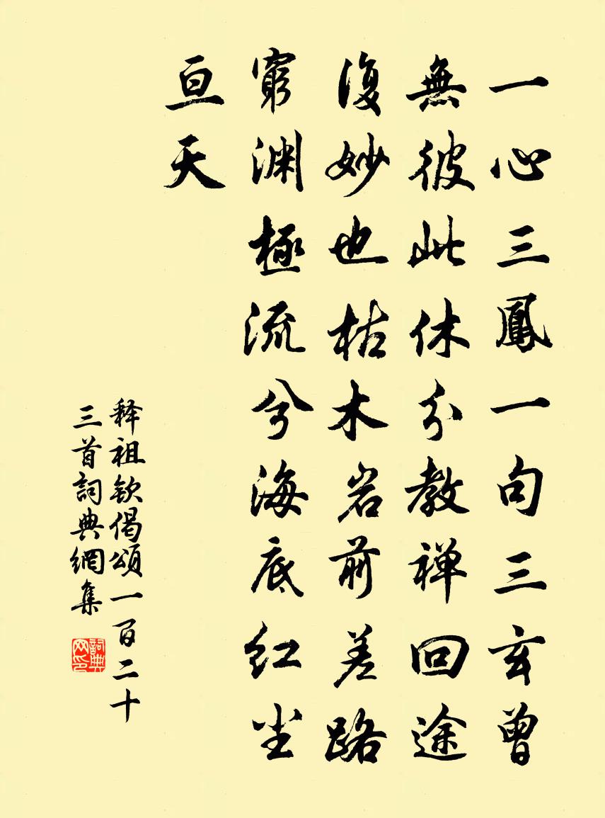 詩詞名句歷史字典書法欣賞書法字典國語詞典說文解字康熙字典古漢語字典標 題 作 者 詩 句 偈頌一百二十三首作者:釋祖欽 朝代:宋代偈頌一百二十三首原文一心三鳳,一句三玄。曾無彼此,休分教禪。回途復妙也,枯木岩前差路。窮淵極流兮,海底紅塵亘天。詩詞問答問:偈頌一百二十三首的作者是誰?答:釋祖欽問:偈頌一百二十三首寫於哪個朝代?答:宋代釋祖欽偈頌一百二十三首書法欣賞偈頌一百二十三首書法作品詩詞推薦阮郎歸 壽太乙真人李六祖劉敏中〔元代〕八千歲月作春秋。神仙第一流。笑看塵世等浮漚。家居麟鳳洲。才八十,盡優遊。細斟雙玉甌。醉邀明月與同游。詠塵林泳〔宋代〕野馬相吹生不盡,海犀能辟語成空。高埋旗鼓無邊黑,暗染衣冠日下紅。寧可濯纓歌濁水,莫教舉扇障西風。渾無謾成史安叔〔宋代〕閒較新詩意未降,吟髭撚斷數莖霜。忽然得句笑聲發,驚起花間蝶也狂。送友人及第歸一本題下有新羅二字張蠙〔唐代〕家林滄海東,未曉日先紅。作貢諸蕃別,登科幾國同。遠聲魚呷浪,層氣蜃迎風。鄉俗稀攀桂,爭來問月宮。醉蓬萊歐陽修〔宋代〕見羞容斂翠,嫩臉勻紅,素腰裊娜。紅藥闌邊,惱不教伊過。半掩嬌羞,語聲低顫,問道有人知麽。強整羅裙,偷中秋夜對月許棠〔唐代〕月月勢皆圓,中秋朗最偏。萬方期一夕,到曉是經年。影蔽星芒盡,光分物狀全。惟應苦吟者,目斷向遙天。魚梁宋庠〔宋代〕八月霜潦收,江槎絕煙渚。竹落如綱裁,淵鱗劇雲聚。鷖鳥爭食飛,兒童荷叉語。去乙鯿項肥,吳羹免轑釜。送文著上人游越姚合〔唐代〕水石隨緣豈計程,東吳相遇別西京。夜禪月下袈裟濕,曉上山巔錫杖鳴。念我為官應易老,羨師依佛學無生。越中望江南·江南蝶歐陽修〔宋代〕江南蝶,斜日一雙雙。身似何郎全傅粉,心如韓壽愛偷香。天賦與輕狂。微雨後,薄翅膩煙光。才伴遊蜂來小院,春雨劉子翬〔宋代〕暝色春朝雨,滋榮喜及時。雲昏遙莫辨,地渴久方知。柳岸游畫歇,濤江釣舸移。拒寒須把酒,病骨況支離。早見桃花方回〔宋代〕離家四五程,所至盡堪驚。未許盜皆息,焉能軍不行。人移山里住,春廢道傍耕。破屋知誰主,桃花照眼明。河北語佚名〔唐代〕唯此兩何, * 最多。公子行張祜〔唐代〕錦堂晝永繡簾垂,立卻花驄待出時。紅粉美人擎酒勸,青衣年少臂鷹隨。輕將玉杖敲花片,旋把金鞭約柳枝。近地鹽亭縣永樂山叩雲亭文同〔宋代〕長江合高峰,爽氣左右繞。中流望絕巘,萬丈見木杪。孤寧揭其上,隱隱一拳小。李君令茲邑,邀我升縹緲。是時應化非真分第三十二釋印肅〔宋代〕七寶豈齊經,福多不離心。心心心是佛,何處更堪尋。泉州貢院舉梁八詠真德秀〔宋代〕梁脊伊誰姓氏題,梅溪去後有苕溪。自慚拙守何為者,強策駑駘繼鴂騠。寒食清明十首劉克莊〔宋代〕向來稱合老,歸去作園翁。鬚髮已華皓,紫薇藥應紅。贈元稹白居易〔唐代〕自我從宦遊,七年在長安。所得惟元君,乃知定交難。豈無山上苗,徑寸無歲寒。豈無要津水,咫尺有波瀾。之子感遇二十五首張耒〔宋代〕風霜凜已高,歲月逝雲邁。蕭條陋巷士,藜藿守耿介。欲吐胸中語,旁人笑言大。漆室非近憂,宜遭鄰里怪。秋閨月權德輿〔唐代〕三五二八月如練,海上天涯應共見。不知何處玉樓前,乍入深閨玳瑁筵。露濃香徑和愁坐,風動羅幃照獨眠。初卷名句推薦無限春風來海上。便與春工。染得桃紅似肉紅。蘇軾《減字木蘭花·立春》 砌下落梅如雪亂,拂了一身還滿。李煜《清平樂·別來春半》 哀蟬無留響,叢雁鳴雲霄。陶淵明《己酉歲九月九日》 待到重陽日,還來就菊花。孟浩然《過故人莊》 小男供餌婦搓絲,溢榼香醪倒接罹。李郢《南池》 荷葉生時春恨生,荷葉枯時秋恨成。李商隱《暮秋獨游曲江》 十年重見,依舊秀色照清眸。王以寧《水調歌頭·呈漢陽使君》 蜂兒不解知人苦,燕兒不解說人愁。程垓《最高樓·舊時心事》 千錘萬鑿出深山,烈火焚燒若等閒。于謙《石灰吟》 孤雁飛南遊,過庭長哀吟。曹植《雜詩六首·其一》