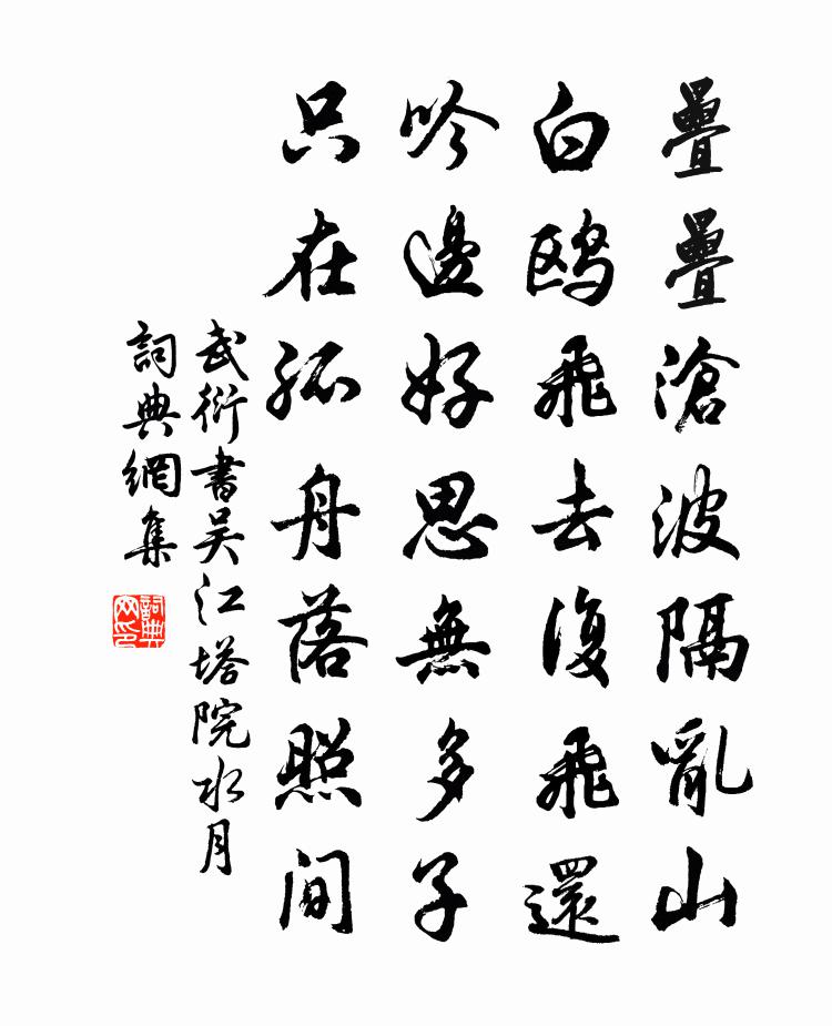 詩詞名句歷史字典書法欣賞書法字典國語詞典說文解字康熙字典古漢語字典標 題 作 者 詩 句 書吳江塔院水月作者:武衍 朝代:宋代書吳江塔院水月原文疊疊滄波隔亂山,白鷗飛去復飛還。吟邊好思無多子,只在孤舟落照間。詩詞問答問:書吳江塔院水月的作者是誰?答:武衍問:書吳江塔院水月寫於哪個朝代?答:宋代武衍書吳江塔院水月書法欣賞書吳江塔院水月書法作品詩詞推薦題虎丘馮時行〔宋代〕海甸平無際,突阜如踞虎。杉松閟岩壑,殿閣煥藻黼。老眼凌雲煙,吳會略可俯。昔游恍如昨,歲月不勝數。老矣靈岩劉黻〔宋代〕千岩圍一寺,入境便無塵。古木猶知已,高崖若正人。山靈袪虎跡。石髓幻龍身。上有通天竅,民愁獨未伸。奉和持國曼叔方叔送師直歸馬上同賦之什梅堯臣〔宋代〕郊外桃李花,赤赤復白白。為君歌古曲,行子在南陌。眾人各已歸,春風送無跡。安知春風送,到處花當客。我病更漏子杜安世〔宋代〕雪肌輕,花臉薄。愁困不忺梳掠。眉翠裊,眼波長。偎人言語香。看難厭,憐不足。苦恨別離何速。珠樹遠,彩鸞憶王孫汪元量〔宋代〕五陵無樹起秋風。千里黃雲與斷蓬。人物蕭條市井空。思無窮。惟有青山似洛中。感舊絕句陸游〔宋代〕鵝黃酒邊綠荔枝,摩訶池上納涼時。冰紈不畫驂鸞女,卻寫江南白紵辭。二月十四日梅花二首楊萬里〔宋代〕雨打知無那,春暄絕不禁。小風千點雪,落日一須金。送潘景參赴利路帳乾趙師秀〔宋代〕蜀道如天遠,攜家難計程。不從三峽過,免聽幾猿聲。戌密野花少,棧虛山雨鳴。同年同寂寞,此去子成名。句張湜〔宋代〕吳山空對越山明。游白狼山兩首鄭燮〔清代〕懸岩小閣碧梧桐,似有人聲在半空。百叩銅環渾不應,松花滿地午蔭濃。金縷曲(五日和韻)劉辰翁〔宋代〕錦岸吳船鼓。問沙鷗、當日沈湘,是何端午。長恨青青朱門艾,結束腰身似虎。空淚落、嬋媛嬃女。我醉招累清醒憶友釋文珦〔宋代〕同人久別離,訊息不曾知。心似長堤柳,千絲又萬絲。春夜雪再用韻十首楊公遠〔宋代〕雪霽風猶萬竅號,微吟擁鼻袖無羔。一寒如此還風味,和得詩成句法高。西江月(春歸)韓元吉〔宋代〕山路冥冥雨暗,溪橋陣陣花飛。一年寂寂又春歸。白髮自驚塵世。不惜障泥渡水,且尋團扇題詩。杜鵑休繞暮煙啼鷓鴣天晏幾道〔宋代〕小玉樓中月上時。夜來惟許月華知。重簾有意藏私語,雙燭無端惱暗期。傷別易,恨歡遲。歸來何處驗相思。沈郎即事李洪〔宋代〕寶策歡傳萬歲聲,塗山執玉萃華纓。獨憐太史周南滯,不預堯階賀太平。秋懷十首以竹藥閉深院琴樽開小軒為韻陸游〔宋代〕飲酒可不病,自酌隨淺深;處世可無患,惟勿欺此心。此心實通天,一念天所臨。子能守吾言,可度豺虎林。和顏長官百詠朱門朱繼芳〔宋代〕泥金摺損舞衣羅,蹙破遙山皓齒歌。此曲人間聽不得,莫愁還自有愁多。酬俞子清侍郎惠畫韻王炎〔宋代〕一去星沙二十年,夢魂時到橘洲邊。從今不起南征念,移得湘山在目前。落梅風·斜陽外李致遠〔元代〕斜陽外,春雨足,風吹皺一池寒玉。畫樓中有人情正苦,杜鵑聲莫啼歸去。名句推薦別有根芽,不是人間富貴花。納蘭性德《採桑子·塞上詠雪花》 大者不能,小者不為,是棄國捐身之道也。荀子《荀子·大略》 上有所欲,其神若親,禮下勿辭,拒者無助矣。來俊臣《羅織經·治下卷第三》 黃河捧土尚可塞,北風雨雪恨難裁。李白《北風行》 舉頭紅日近,回首白雲低。寇準《詠華山》 風起,雪飛炎海變清涼。蘇軾《定風波·南海歸贈王定國侍人寓娘》 其交也以道,其接也以禮,斯孔子受之矣。孟子《孟子·萬章章句下·第四節》 昔年多病厭芳尊,今日芳尊惟恐淺。錢惟演《木蘭花·城上風光鶯語亂》 想當年,金戈鐵馬,氣吞萬里如虎。辛棄疾《永遇樂·京口北固亭懷古》 人生百年有幾,念良辰美景,休放虛過。元好問《驟雨打新荷》
