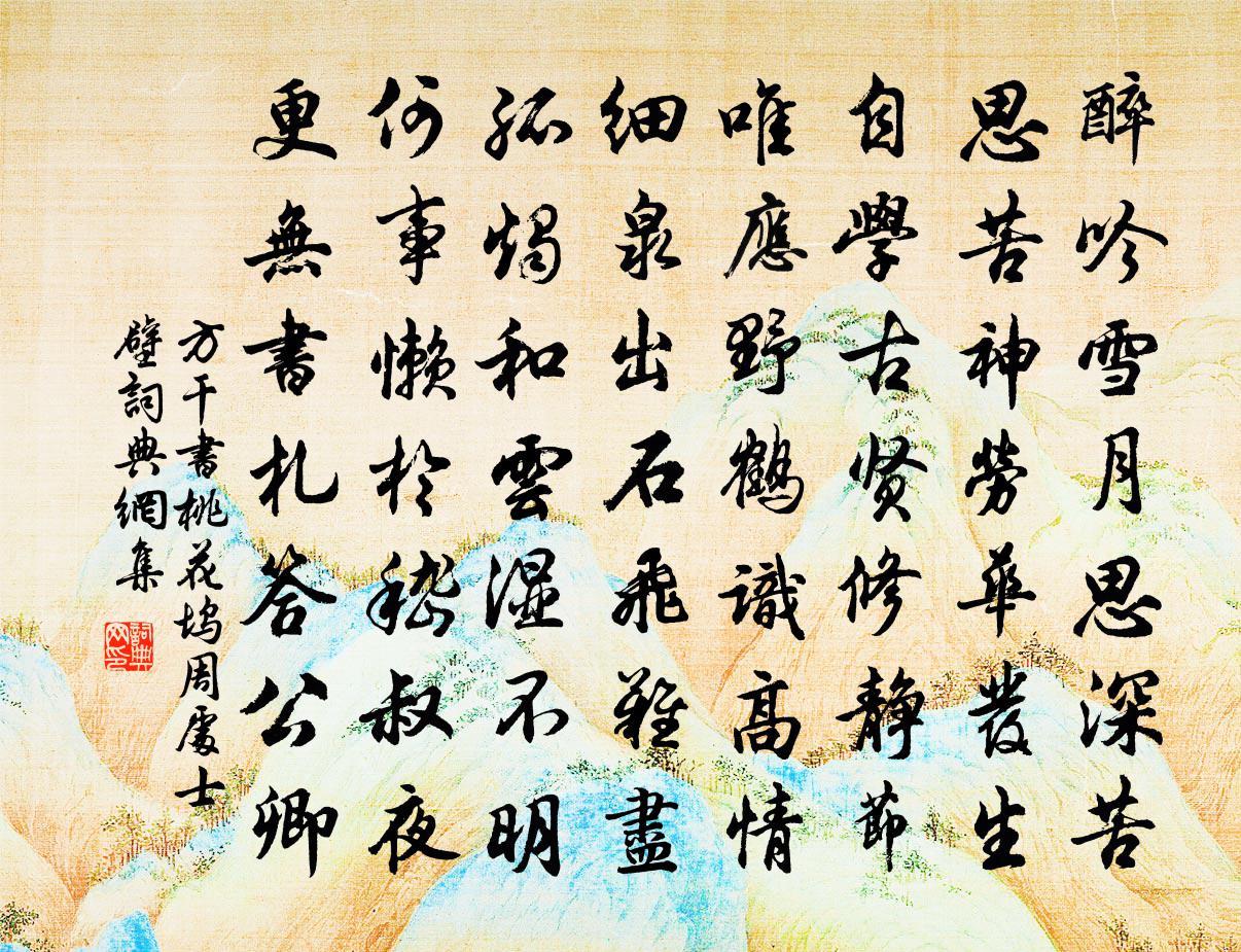詩詞名句歷史字典書法欣賞書法字典國語詞典說文解字康熙字典古漢語字典標 題 作 者 詩 句 書桃花塢周處士壁作者:方乾 朝代:唐代書桃花塢周處士壁原文醉吟雪月思深苦,思苦神勞華發生。自學古賢修靜節,唯應野鶴識高情。細泉出石飛難盡,孤燭和雲濕不明。何事懶於嵇叔夜,更無書札答公卿。詩詞問答問:書桃花塢周處士壁的作者是誰?答:方乾問:書桃花塢周處士壁寫於哪個朝代?答:唐代問:書桃花塢周處士壁是什麼體裁?答:七律方乾書桃花塢周處士壁書法欣賞書桃花塢周處士壁書法作品注釋全唐詩:卷650-31詩詞推薦寓言九首其七王安石〔宋代〕鐘鼓非樂本,本末猶相因。仁聲入人深,孟子言之醇。如何貞觀君,從古同隋陳。風俗不粹美,惜哉世無臣。以雪梨遺韓子文李洪〔宋代〕婺女新梨玉雪如,姑山綽約想肌膚。使君應喚纖纖手,飣座風流近酒壺。虞美人石孝友〔宋代〕醉尋芳草城頭路。底事頻凝佇。麗譙直下小層樓。鴛瓦重重勻砌、幾重愁。睡紅顰翠春風面。咫尺無由見。從教笑喜雨四首張耒〔宋代〕手種五色蕉,意待聽秋雨。南風扇旱日,破葉萎不舉。滂沱未終夕,綠潤遽如許。秋色入書幃,已覺青鸞舞。題馮公嶺旅邸劉宰〔宋代〕層樓傑閣聳朱欄,樓下行人自往還。但見彩雲橫木未,不知身在翠微間。李蘇軾〔宋代〕不及梨英軟,應慚梅萼紅。西園有千葉,淡佇更纖穠。和尹懋秋夜遊灉湖張說〔唐代〕灉湖佳可游,既近復能幽。林里棲精舍,山間轉去舟。雁飛江月冷,猿嘯野風秋。不是迷鄉客,尋奇處處留。頌古四十八首釋慧開〔宋代〕問既一般,答說相似。飯里有砂,泥中有刺。節物釋文珦〔宋代〕節物苦驚人,那堪遠客身。梅心輕送臘,柳意轉隨春。叢薄啼新鳥,深泉動蟄鱗。獨憐歸夢短,不得面慈親。鄂州南樓書事四首黃庭堅〔宋代〕畫閣傳觴容十客,透風透月兩明軒。南樓盤礡三百尺,天上雲居不足言。登湖州銷暑樓陳亞〔宋代〕重樓肆登賞,豈羨石為廊。風月前湖近,軒窗半夏涼。罾青識漁浦,芝紫認仙鄉。卻恐當歸闕,靈台為別傷。南園雜詩六首見山台書臥偶成司馬光〔宋代〕移床獨上高台臥,颯颯涼風吹面過。林蟬忽噪驚薄夢,手執殘書幅巾墮。後迎駕行鄧肅〔宋代〕揮鞭沖曉露,歸鞍載夕陽。一日復一日,不見御袍黃。左衽須文繡,氈車奉珪璋。作意禮樂盛,而乃訪毛嬙。上皇次青陽王安石〔宋代〕十載九華邊,歸期尚渺然。秋風一乘傳,更覺負林泉。菩薩蠻蔡伸〔宋代〕鳴笳疊鼓催雙槳。扁舟穩泛桃花浪。別淚灑東風。前歡如夢中。夢魂無定據。不到相逢處。縱使夢相逢。香閨豈解和李季章校書西湖即事三首孫應時〔宋代〕風日都門外,樓台十萬家。西湖春事足,不話洛陽花。東禪陳師道〔宋代〕東阡急雨未成泥,度密穿青取徑微。邂逅無人成獨往,殷懃有月與同歸。木蘭花/玉樓春莫將〔宋代〕花時人道多風雨。梅蕊都來無幾許。何須飄灑濕芳心,粉面琳琅如淚注。家童莫掃花陰土。留浥瓊林枝上露。莫教苦筍洪咨夔〔宋代〕臨軒解褐賜湯沐,一節兩節水蒼玉。氣嚴慣嘗志士膽,格高厭食太官肉。此君可人如西湖,荷邊冰簟三更鋪。心知和瑞雪江萬里〔宋代〕與天通處在人和,未有人和天薦瘥。訊息連朝來玉闕,川原滿眼盡銀河。坡書已得歐公體,力士宜尊太白靴。人物名句推薦山重水複疑無路,柳暗花明又一村。陸游《游山西村》 是故置本不安者,無務豐末。墨子《墨子·02章 修身》 花開不並百花叢,獨立疏籬趣未窮。鄭思肖《畫菊》 千里稻花應秀色,五更桐葉最佳音。曾幾《蘇秀道中》 喃喃教言語,一一刷毛衣。白居易《燕詩示劉叟》 天行有常,不為堯存,不為桀亡。應之以治則吉,應之以亂則凶。荀子《荀子·天論》 日往菲薇,月來扶疏。左思《三都賦》 霧柳暗時雲度月,露荷翻處水流螢。張元乾《浣溪沙·山繞平湖波撼城》 雲物淒涼拂曙流,漢家宮闕動高秋。趙嘏《長安晚秋 / 秋望 / 秋夕》 夜雨做成秋,恰上心頭。納蘭性德《浪淘沙·夜雨做成秋》