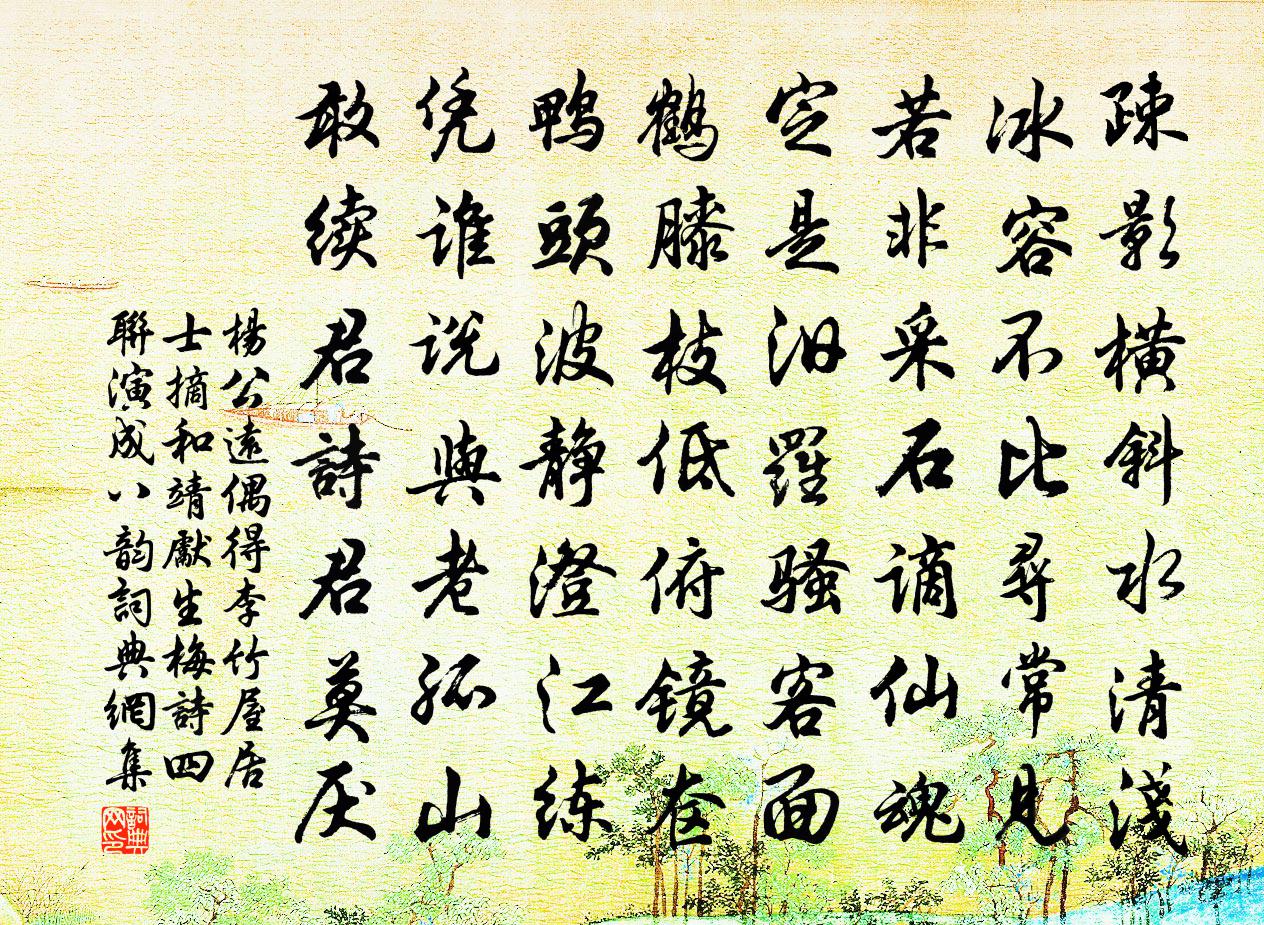 詩詞名句歷史字典書法欣賞書法字典國語詞典說文解字康熙字典古漢語字典標 題 作 者 詩 句 偶得李竹屋居士摘和靖先生梅詩四聯演成八韻作者:楊公遠 朝代:宋代原文疎影橫斜水清淺,冰容不比尋常見。若非採石謫仙魂,定是汨羅騷客面。鶴膝枝低俯鏡奩,鴨頭波靜澄江練。憑誰說與老孤山,敢續君詩君莫厭。詩詞問答問:《偶得李竹屋居士摘和靖先生梅詩四聯演成八韻》的作者是誰?答:楊公遠問:該詩寫於哪個朝代?答:宋代書法欣賞偶得李竹屋居士摘和靖先生梅詩四聯演成八韻書法作品詩文賞析【原題】:偶得李竹屋居士摘和靖先生梅詩四聯演成八韻句工而韻險似難繼和愧不自揣僭敢續貂珠玉在傍覺我形穢五首詩詞推薦答太守虞察院遊仙岩詩張繼先〔宋代〕累年林下意何長,岩谷風霜亦備嘗。俗客不曾交得到,達人應未以為狂。江亭昔造懷寧海,石屋今居似瀨鄉。誰拎讀潁公清風庥司馬光〔宋代〕一言華袞足為榮,況吒文編久愈明。鄒湛不逢羊叔子,世間何處復知名。廣福僧智昕西歸蘇轍〔宋代〕老人寄東岩,蕭然四無鄰。八尺清冷泉,中有白髮人。婆娑弄明月,松間夜相賓。平生指庚壬,終老投此身。築室寄樂天元稹〔唐代〕無身尚擬魂相就,身在那無夢往還。直到他生亦相覓,不能空記樹中環。性之尋梅歸來有詩因感一絕胡仲參〔宋代〕處士廬前門逕深,僅留佳句與人吟。孤山近日無行路,疏影暗香何處尋。杜鵑釋文珦〔宋代〕遊魂變化事無涯,吳蜀相望萬里賒。回首故宮歸不得,聲聲啼血染山花。和李光祖吳芾〔宋代〕男子升沉自有詩,莫輕感慨嘆稽遲。古來常患才難得,道在寧憂世不知。會際亨嘉膺晝接,且接粗糲療朝飢。他年除夕徐集孫〔宋代〕一歲驚心忽已除,宦遊尚自客西湖。漫題桃板標茅屋,旋買梅花插瓦壺。俸薄倖無賒酒債,官閒卻有索詩逋。明朝偈頌一百零二首釋紹曇〔宋代〕死柴頭,無煙火。信口一吹,面門爍破。可憐龍門遠知客禮首座。火爐頭熱血相噴,分爭你我,笑倒嵩山破灶墮。寄贈薛濤元稹〔唐代〕錦江滑膩蛾眉秀,幻出文君與薛濤。言語巧偷鸚鵡舌,文章分得鳳凰毛。紛紛辭客多停筆,個個公卿欲夢刀。別後悟南柯 本名南柯子 和常顯之王丹桂〔元代〕宴坐心恆適,幽居興可嘉。靜鳴天鼓漱雲芽。吐納綿綿,隨分保生涯。但解安時運,奚憂換物華。三山瓊路信非賒聽嘉陵江水聲寄深上人韋應物〔唐代〕鑿崖泄奔湍,古稱神禹跡。夜喧山門店,獨宿不安席。水性自雲靜,石中本無聲;如何兩相激,雷轉空山驚?貽之廬陵別朱觀先輩徐鉉〔唐代〕桂籍知名有幾人,翻飛相續上青雲。解憐才子寧唯我,遠作卑官尚見君。嶺外獨持嚴助節,宮中誰薦長卿文。新詩春光好(寒食將過淮作)葛立方〔宋代〕禁菸卻釀春愁。正系馬、清淮渡頭。後日清明催疊鼓,應在揚州。歸時元已臨流。要綺陌、芳郊恣游。三月羈懷當昭陵行蔡襄〔宋代〕宮人上臨候昏鍾,簾外香菸燭影紅。庭柏飛霜陵漏永,可憐今夜月明中。送常清上人還舒州皎然〔唐代〕灊人思爾法,楚信有回船。估客親宵語,閒鷗偶晝禪。經聲含石瀲,麈尾拂江煙。常說歸山意,誅茅廬霍前。遇高台獲信老詩集林用中〔宋代〕今朝移步野雲端,幸得新詩讀夜闌。識破中間真隱訣,月明風雪道休寒。楚樓袁說友〔宋代〕東江風月夜潮平,西望巫山白帝城。止為山川增楚觀,惜哉徒沸市廛聲。偈六十九首釋道寧〔宋代〕晷運推移,日南長至。分明一道恩光,照徹十方三世。全彰諸祖玄關,漏泄衲僧巴鼻。靈雲剛道無疑,彌勒徒夸授閩中歲暮懷吳中釋文珦〔宋代〕冉冉年光盡,淒淒客思驚。疎狂輕萬事,行役負平生。海月移松影,山風壯瀑聲。寒宵頻作夢,曾不離吳城。名句推薦自古驕兵多致敗,從來輕敵少成功。羅貫中《三國演義·第六十九回》 自是浮生無可說。人間第一耽離別。王國維《蝶戀花·滿地霜華濃似雪》 拜迎長官心欲碎,鞭撻黎庶令人悲。高適《封丘作》 手如柔荑,膚如凝脂佚名《碩人》 春風知別苦,不遣柳條青。李白《勞勞亭》 柳花驚雪浦,麥雨漲溪田。李賀《南園十三首》 應知早飄落,故逐上春來。何遜《詠早梅 / 揚州法曹梅花盛開》 燕子斜陽來又去,如此江山。朱彝尊《賣花聲·雨花台》 只愁飛詔下青冥。不應霜塞晚,橫槊看詩成。周紫芝《臨江仙·送光州曾使君》 嶺外音書斷,經冬復歷春。宋之問《渡漢江》