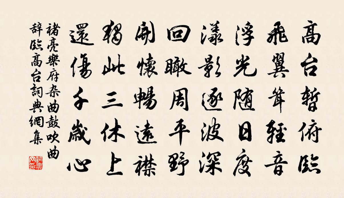 詩詞名句歷史字典書法欣賞書法字典國語詞典說文解字康熙字典古漢語字典標 題 作 者 詩 句 樂府雜曲。鼓吹曲辭。臨高台作者:褚亮 朝代:唐代原文高台暫俯臨,飛翼聳輕音。浮光隨日度,漾影逐波深。回瞰周平野,開懷暢遠襟。獨此三休上,還傷千歲心。詩詞問答問:《樂府雜曲。鼓吹曲辭。臨高台》的作者是誰?答:褚亮問:該詩寫於哪個朝代?答:唐代問:該詩是什麼體裁?答:樂府書法欣賞樂府雜曲。鼓吹曲辭。臨高台書法作品注釋全唐詩:卷17_38全唐詩:卷32_22詩詞推薦淨涼夜坐馮伯規〔宋代〕水光灩灩竹陰□,何□□香露泛襟。更欲□闌看身轉,一鉤弦月過□心。二十八日行香即事項安世〔宋代〕柳岸蒙蒙濕,溝波點點跳。窗槽斜溜涌,轎頂碎聲飄。村擔果爭市,山桅花滿橋。愁聽新使客,墟里說蕭條。江亭別裴饒羅隱〔唐代〕行杯且待怨歌終,多病憐君事事同。衰鬢別來光景里,故鄉歸去亂罹中。乾坤墊裂三分在,井邑摧殘一半空。日晚縣齋十詠習射亭寧參〔宋代〕危亭當旅進,飛鏑共星鳴。才奏蘋蘩節,空聞霹靂聲。澤宮期並勝,相圃憶偕行。敏手無虛發,由來已鵠平。早朝白居易〔唐代〕鼓動出新昌,雞鳴赴建章。翩翩穩鞍馬,楚楚健衣裳。宮漏傳殘夜,城陰送早涼。月堤槐露氣,風燭樺煙香。雙闕壽安宣相吳泳〔宋代〕磊落堪輿氣,崢嶸社稷身。地傾曾鎮靜,天造要經綸。倉首懷公輔,中原仗老臣。綸揚申命寵,渥照午橋新。司馬柳絕句杜牧〔唐代〕數樹新開翠影齊,倚風情態被春迷。依依故國樊川恨,半掩村橋半拂溪。送陳雲崖儲泳〔宋代〕出門即遠道,君去有誰令。詩價侯門賤,時情客路輕。晚雲歸獨樹,寒雨暗荒城。此地還相別,誰能不動情。觀濤鄭獬〔宋代〕怒濤沃日為之陰,下有蛟龍不測深。若比人間惡風浪,長江風浪本無心。鷓鴣天 九日晉溪魏初〔元代〕何處龍山事不偏。晉王祠下水浮天。參空鐵樹三千丈,刻石名臣五百年。歌浩蕩,酒如川。暫陪珠履對風煙。自憐春波堂小飲懷棠湖舊隱三首岳珂〔宋代〕虛欄四面挹湖光,最愛薰風六月涼。萬朵鞭蕖紅影鬧,兩行楊柳綠絲長。鋪陳雪月晶明態,商略陰晴濃淡妝。四序梅花李流謙〔宋代〕道人一味著幽禪,誰遣天花到眼邊。亂插銅瓶看盡日,向人終是好因緣。宦遊張耒〔宋代〕宦遊吾漫爾,未慕致身早。秋來憶山苦,遙夜夢顛倒。鳴蟲待誰聽,落葉煩我掃。誰得省勞人,吾生常草草。野廟吳融〔唐代〕古原荒廟掩莓苔,何處喧喧鼓笛來。日暮鳥歸人散盡,野風吹起紙錢灰。早春邊城懷歸崔湜〔唐代〕大漠羽書飛,長城未解圍。山川凌玉嶂,旌節下金微。路向南庭遠,書因北雁稀。鄉關搖別思,風雪散戎衣。歲盡西齋秋感二十首方回〔宋代〕寂靜無所為,宴坐觀我天。此心儼不動,豈即非聖賢。孰謂軻也死,斯文遂無傳。鳳麟有嘴角,煎膠寄遺編。斂之謝東粹包宏父三首癸卯夏戴復古〔宋代〕詩文雖兩途,理義歸乎一。鳳騷凡幾變,晚唐諸子出。本朝師古學,六經為世用。諸公相羽翼,文章還正統。晦翁睡思李覯〔宋代〕俗語不入耳,旅愁還到心。坐多渾易厭,夢好欲重尋。暴雨撩蓬響,殘陽過嶺陰。回看奔競苦,此興貴南金。柳紳歸縉雲楊億〔宋代〕東甌別業寄秋雲,平昔題橋墨尚存。故郡曾登太守榻,上都頻掃相君門。揮毫月殿香盈袖,錫宴星津酒滿樽。歸去龍鼻水泉宋習之〔宋代〕老龍倦雷霆,奔山化為石。惟有鼻不枯,尚留雲雨跡。名句推薦美人卷珠簾,深坐顰蛾眉。李白《怨情》 天南地北雙飛客,老翅幾回寒暑。元好問《摸魚兒·雁丘詞 / 邁陂塘》 垂柳依依惹暮煙,素魄娟娟當繡軒。王元鼎《憑欄人·閨怨》 功不可以虛成,名不可以偽立班固《漢書·傳·敘傳上》 靜勝躁,寒勝熱。清靜為天下正。老子《老子·德經·第四十五章》 燕子斜陽來又去,如此江山。朱彝尊《賣花聲·雨花台》 為當時曾寫榴裙,傷心紅綃褪萼。吳文英《澡蘭香·林鐘羽淮安重午》 白草黃沙。月照孤村三兩家。蔣氏女《減字木蘭花·題雄州驛》 所志在功名,離別何足嘆。陸龜蒙《別離》 石壕村里夫妻別,淚比長生殿上多。袁枚《馬嵬》