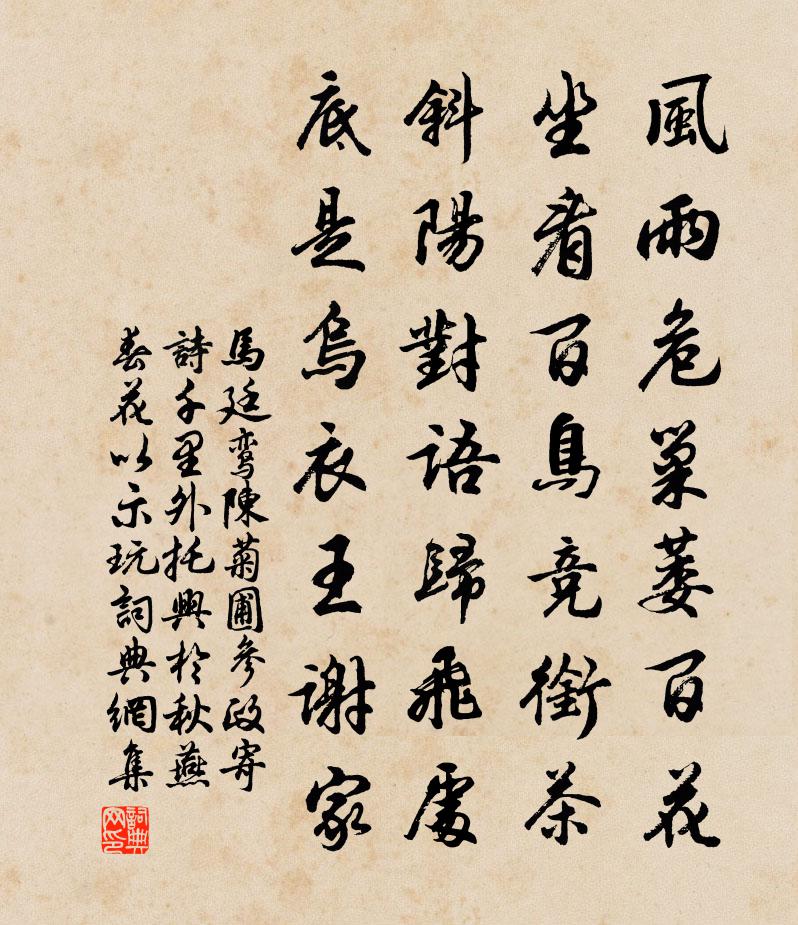 詩詞名句歷史字典書法欣賞書法字典國語詞典說文解字康熙字典古漢語字典標 題 作 者 詩 句 陳菊圃參政寄詩千里外托興於秋燕春花以示玩作者:馬廷鸞 朝代:宋代原文風雨危巢萎百花,坐看百鳥競銜茶。斜陽對語歸飛處,底是烏衣王謝家。詩詞問答問:《陳菊圃參政寄詩千里外托興於秋燕春花以示玩》的作者是誰?答:馬廷鸞問:該詩寫於哪個朝代?答:宋代書法欣賞陳菊圃參政寄詩千里外托興於秋燕春花以示玩書法作品詩文賞析【原題】:陳菊圃參政寄詩千里外托興於秋燕春花以示玩芳病叟叟病不能吟強和四章前二章借來意以自傷後二章述愚懷以志感詩詞推薦憑高徐璣〔宋代〕憑高散幽策,綠草滿春坡。楚野無林木,湘山似水波。客懷隨地改,詩思出門多。尚有溪西寺,斜陽未得過。句劉宰〔宋代〕選詩非選官,論詩非論人。興州新開古東池蘇轍〔宋代〕山繞興州萬疊青,池開近郭百泉並。昔年種柳人安在,累歲開花藕自生。波暖跳魚聞樂喜,人來野鴨望船鳴。西還題富沙廟華岳〔宋代〕平政橋頭火爍空,富沙宮殿烈煙中。地形難撲徒臨水,天意能回遽反風。十里爆雷驚客夢,萬家全璧賴神功。君王縣齋東堂盆荷著花樓恪齋約客賞之時葛秋岩作董嗣杲〔宋代〕簾底陪清傍兩年,愁城築得許能堅。詩章罷詠猶評畫,管樂沈聲卻得蟬。花縣無心聽夜漏,英溪有日罷歸船。敲窗探春慢(龜翁下世後登研意)吳文英〔宋代〕徑苔深,念斷無故人,輕敲幽戶。細草春回,目送流光一羽。重雲冷,哀雁斷,翠微空,愁蝶舞。盪鳴澌,游蓬小蛾眉亭羅公升〔宋代〕萬里風濤競擊撞,乾坤設險鍵南邦。五更畫角三州夢,兩岸青山四面窗。太白風流空舊月,虞公勳業自長江。倚闌梅雨吳融〔唐代〕渾開又密望中迷,乳燕歸遲粉竹低。撲地暗來飛野馬,舞風斜去散醯雞。初從滴瀝妨琴榭,漸到潺湲繞藥畦。少傍送梵才大師歸天台錢惟演〔宋代〕漢苑辭千柰,仙丘訪五芝。汲瓶春溜滿,卷裓曉雲滋。望剎青龍起,觀濤白馬馳。紅樓曾應制,佳句詠朝緌。和汝霖三首胡寅〔宋代〕客思如春日日深,莫令鶗鴂損芳陰。忽逢佳士能傾蓋,那用高眠有抱衾。陌上正歌歸緩緩,尊前聊酌夜沉沉。君詩別負山居士陳師道〔宋代〕田園相與老,此別意如何。更病可無酒,猶寒已自和。高名胡未廣,詩興尚能多。沙草東山路,猶須一再過。渡江雲(次趙元父韻)張炎〔宋代〕錦香繚繞地,深燈掛壁,簾影浪花斜。酒船歸去後,轉首河橋,那處認紋紗。重盟鏡約,還記得、前度秦嘉。惟只望京樓曾致堯〔宋代〕望京樓上望,望久思踟躇。境土連江徼,人家匝海隅。隔山川隱映,近郭水縈紆。雨過風腥檻,潮來岸浸蘆。長郊雨餘遠樹減翠新蟬忽鳴激耳嘹唳久客孤坐寇準〔宋代〕遙山夏雨歇,遠樹涼風至。憑欄偶開襟,新蟬動秋思。沙溪潔細流,庭木驚疏翠。節候又復然,幽憂斯所萃。芳歲道李嶠〔唐代〕銅駝分鞏洛,劍閣低臨邛。紫徼三千里,青樓十二重。玉關塵似雪,金穴馬如龍。今日中衢上,堯尊更可逢。贈卜者魏易齋謝枋得〔宋代〕伯陽曾著易參同,奪盡陰陽造化功。白玉五城人可到,黃金一鼎道無窮。先生救世心衣苦,後派多才命必通。魏本天仙子·水調數聲持酒聽張先〔宋代〕水調數聲持酒聽。午醉醒來愁未醒。送春春去幾時回,臨晚鏡。傷流景。往事後期空記省。沙上並禽池上暝。雲破庵居雜詠九首張繼先〔宋代〕莫羨庵居景物清,須知樂自苦中生。山前盡日幽尋客,多說荒蹊不可行。與孫宣教釋正覺〔宋代〕作別江頭五載余,海邊相訪未嫌迂。山林意與世幾絕,丘壑姿逢秋更癯。約我道耕新活計,輟君詩戰老工夫。兒婚突永年鎮僧居李流謙〔宋代〕風慘雲低月欲墮,路上荒村愁僻左。蕭條橫道屋三間,傴僂迎門僧一個。夜深山換聲砉然,恐來吹燈不敢眠。明朝名句推薦屏卻相思,近來知道都無益。王國維《點絳唇·屏卻相思》 兵之利鈍是常事,貴因敗以為成耳。佚名《百戰奇略·第六卷·敗戰》 織婦何太忙,蠶經三臥行欲老。元稹《織婦詞》 扶桑已在渺茫中,家在扶桑東更東。韋莊《送日本國僧敬龍歸》 思悠悠,恨悠悠,恨到歸時方始休。白居易《長相思·汴水流》 人家見生男女好,不知男女催人老。王建《短歌行》 曉雞驚樹雪,寒鶩守冰池。李商隱《幽居冬暮》 家在夢中何日到,春來江上幾人還?盧綸《長安春望》 日往菲薇,月來扶疏。左思《三都賦》 天涯靜處無征戰,兵氣銷為日月光。常建《塞下曲四首·其一》
