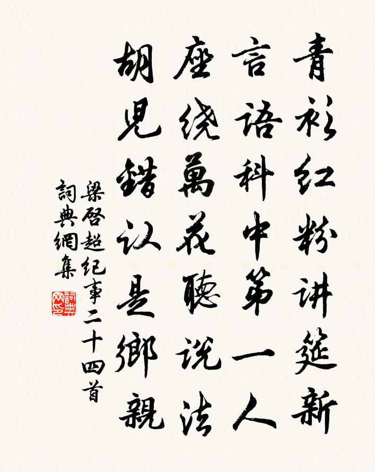 詩詞名句歷史字典書法欣賞書法字典國語詞典說文解字康熙字典古漢語字典標 題 作 者 詩 句 紀事二十四首作者:梁啓超 朝代:清代紀事二十四首原文青衫紅粉講筵新,言語科中第一人。座繞萬花聽說法,胡兒錯認是鄉親。詩詞問答問:紀事二十四首的作者是誰?答:梁啓超問:紀事二十四首寫於哪個朝代?答:清代梁啓超紀事二十四首書法欣賞紀事二十四首書法作品詩詞推薦悼主公美母夫人卷剛中〔宋代〕太博先生志行全,夫人內助實稱賢。寡居勤儉五千日,享福安榮九十年。已作芝蘭綿後裔,卻將金玉必深泉。月卿和州留別穆郎中劉長卿〔唐代〕播遷悲遠道,搖落感衰容。今日猶多難,何年更此逢。世交黃葉散,鄉路白雲重。明發看煙樹,唯聞江北鍾。望織女詩范雲〔南北朝〕盈盈一水邊。夜夜空自憐。不辭精衛苦。河流未可填。寸情百重結。一心萬處懸。願作雙青鳥。共舒明鏡前。卜運算元李敦詩〔宋代〕南北利名人,常恨家居少。每到春時聽子規,無不傷懷抱。好去向長安,細與公卿道。待得功成名遂時,不似歸來寄董總管文卿精春秋連為太平姑蘇二大郡方回〔宋代〕春秋家學漢醇儒,才尹當塗又尹蘇。光價九霄懸日月,愛思兩郡甲江湖。蛾眉採石風前笛,橘里長橋□後鱸。太白和菜花二首陳普〔宋代〕天公大似慰顏貧,二月滿園瓜子金。不問異根仍異味,盡令同色亦同心。輪蹄見棄各有路,蜂蝶爭趨亦若林。魏紫留別趙端公許渾〔唐代〕海門征棹赴龍瀧,暫寄華筵倒玉缸。簫鼓散時逢夜雨,綺羅分處下秋江。孤帆已過滕王閣,高榻留眠謝守窗。卻願暮雪四錫〔宋代〕北風慘慘生微雪,微雪片片皆橫飛。梅花柳絮隨人歸,黃雲千里凝無輝。唯念蓬蒿何處客,緼袍不暖飢且羸。擬王維偶然作梅堯臣〔宋代〕嵇康任天姓,傲散喜端居。自雲安卑者,竊比老莊歟。一月十五日,頭面忘洗梳。危坐恣搔虱,於時懶作書。一曲憶仙姿/如夢令洪皓〔宋代〕乍到園亭清處。面面此君忘去。把酒挹幽人,仰止七賢高趣。吳語。吳語。弗見滿城風絮。雲安下岩二首馮時行〔宋代〕系纜江沙靜,杖藜岩谷春。花依竹色好,草入漲痕新。占筍苔初破,嘗梅客遽顰。篙師勿槌鼓,幽興苦留人。再次韻白誑簡賓王二首陳造〔宋代〕庾郎胸次枉堆愁,馮衍才名迄不投。歸去來兮歲華晚,末如何矣鬢毛秋。令威心事千年鶴,張翰生涯一葉舟。回首李參政生日魏了翁〔宋代〕{嫠去女加刀}面花門未果馴,夏人兵馬 * 秦。誰將鞭策驅時運,十數年間日日新。次韻王才少師雜花五首李彌遜〔宋代〕不禁花惱曲江頭,欲對清尊舞沐猴。留得春紅撩客恨,爭如庭草解忘憂。又詠萬歲藤杖酬正仲並謝元惠主人潘少白舒岳祥〔宋代〕不求海上千金藥,且覓山中萬歲藤。潘子入林親揀得,舒翁履險力扶能。乞君瘦硬蒼龍節,伴我清羸病鶴形。莫向自雪堂登四望亭因歷訪蘇公遺蹟至安國院陸游〔宋代〕我醉飛屐登孱顏,拄杖出沒風煙間。三山蔥曨鮫鱷靜,九關肅穆虎豹閒。幾年金骨煉綠髓,此日始得窮躋攀。老僊八歸 庚辰七夕,與衛立禮同用此調邵亨貞〔元代〕涼欺羽扇,風生蘄竹,秋意漸滿院落。商聲又過梧桐井,還誤剖瓜佳會,泛槎仙約。漫憶中庭兒女夜,幾*語、花表弟廷憑章得象知信州玉山縣楊億〔宋代〕懷玉煙霞接武夷,我思祖德涕沾衣。縣齋製錦留遺愛,庭樹藏環長舊園。彭澤公田今已廢,遼東邑子半應非。津亭鄂州南樓范成大〔宋代〕誰將玉笛弄中秋。黃鶴飛來識舊遊。漢樹有情橫北渚,蜀江無語抱南樓。燭天燈火三更市,搖月旌旗萬里舟。卻笑古斷腸曲三十首周端臣〔宋代〕破除艱儘是恩情,卻怕恩生怨亦生。思念不休心惑亂,夢驚人語似郎聲。名句推薦月去疏簾才數尺,烏鵲驚飛,一片傷心白。宋琬《蝶戀花·旅月懷人》 陶潛酷似臥龍豪,萬古潯陽松菊高龔自珍《己亥雜詩·其一百三十》 疏籬下、試覓重陽,醉擘青露菊。吳文英《一寸金·秋感》 闌風伏雨催寒食,櫻桃一夜花狼藉。納蘭性德《菩薩蠻·闌風伏雨催寒食》 德之不修,學之不講,聞義不能徙,不善不能改,是吾憂也。孔子弟子《論語·述而篇》 遊說萬乘苦不早,著鞭跨馬涉遠道。李白《南陵別兒童入京》 騁望因高雲外盡,鄉關回首愧煙蘿。石茂華《九月九日登長城關》 人方為刀俎,我為魚肉司馬遷《史記·項羽本紀》 猿鳥猶疑畏簡書,風雲常為護儲胥。李商隱《籌筆驛》 顛狂柳絮隨風去,輕薄桃花逐水流。杜甫《絕句漫興九首·其五》