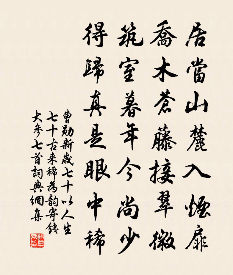 詩詞名句歷史字典書法欣賞書法字典國語詞典說文解字康熙字典古漢語字典標 題 作 者 詩 句 新歲七十以人生七十古來稀為韻寄錢大參七首作者:曹勛 朝代:宋代原文居當山麓入煙扉,喬木蒼藤接翠微。築室暮年今尚少,得歸真是眼中稀。詩詞問答問:《新歲七十以人生七十古來稀為韻寄錢大參七首》的作者是誰?答:曹勛問:該詩寫於哪個朝代?答:宋代書法欣賞新歲七十以人生七十古來稀為韻寄錢大參七首書法作品詩詞推薦仙巢李石〔宋代〕仙人九天上,驂鸞紲飛虬。飄飄紫霄御,下作人間游。二十四洞天,海上橫十洲。乾門鑿井絡,丹梯雲氣浮。中有偈頌一百零九首釋可湘〔宋代〕兩肩擔不起,壓倒世間人。覿體常現前,知他是什麼。縱使六陰塞戶,無欠亦無餘。假饒一氣轉鈞,同明復同暗。醜奴兒慢盧祖皋〔宋代〕湘筠展夢,還是帶恨欹枕。對千頃、風荷涼艷,水竹清陰。半掩龜紗,幾回小語月華侵。娉婷何處,回首畫橋,朱道中方岳〔宋代〕山寒苦厭連宵雨,溪滑頓添兼尺水。輿行兩驛費十程,篷臥一篙余百里。世事乘除類如此,人生俯仰知何似。紫螯戲答俞清老道人寒夜三首黃庭堅〔宋代〕聞道一稊米,出身縛簪纓。懷我伐木友,寒衾夢丁丁。富貴但如此,百年半曲肱。早晚相隨去,松根有茯苓。敘舊感懷呈提刑毅父並再和六首晁補之〔宋代〕賦成庚子尚魂驚,往事如風未暇評。長樂鍾前偶相對,凌煙圖上等浮名。登車豈是君無意,幞被何妨我自行。更許病後訪梅九絕劉克莊〔宋代〕夢得因桃數左遷,長源為柳懺當權。幸然不識桃並柳,卻被梅花累十年。曲江春望羅鄴〔唐代〕故國東歸澤國遙,曲江晴望憶漁樵。都緣北闕春先到,不是南山雪易消。瑞影玉樓開組繡,歡聲丹禁奏雲韶。雖然頌古十四首升座說法釋可湘〔宋代〕當堂據坐寶花床,真相從來本自黃。百萬參徒誰不見,何須重把紫金妝。鷓鴣天 九日晉溪魏初〔元代〕何處龍山事不偏。晉王祠下水浮天。參空鐵樹三千丈,刻石名臣五百年。歌浩蕩,酒如川。暫陪珠履對風煙。自憐酬樂天吟張員外詩見寄因思上京每與樂天…詠張新詩元稹〔唐代〕樂天書內重封到,居敬堂前共讀時。四友一為泉路客,三人兩詠浙江詩。別無遠近皆難見,老減心情自各知。杯酒次王適韻送張耒赴壽安尉二首蘇轍〔宋代〕魏紅深淺配姚黃,洛水家家自作塘。遊客賈生多感概,閒官白傅足篇章。山分少室雲煙老,宮廢連昌草木長。路出南溪細陂楊萬里〔宋代〕仙家有藥世無比,能乾水銀作銀子。老夫卻把水晶環,熔作南溪一溪水。閒隨稚子作兒嬉,金沙玉礫磊細陂。水從虞美人(邢子友會上)陳與義〔宋代〕超然堂上閒賓主。不受人間暑。冰盤圍坐此州無。卻有一瓶和露、玉芙蕖。亭亭風骨涼生牖。消盡尊中酒。酒闌明優缽羅花歌岑參〔唐代〕白山南,赤山北。其間有花人不識,綠莖碧葉好顏色。葉六瓣,花九房。夜掩朝開多異香,何不生彼中國兮生西方泌園春王哲〔元代〕王哲惟名,自稱知明,端正不羈。更復呼佳號重陽子,做真清真淨,相從相隨。每銳仙經,長燒心炷,水火功夫依出都呈十五叔父晁補之〔宋代〕凌兢瘦馬不堪驅,塞眼紅塵暗九衢。太學虀鹽聊樂只,故園桃李且歸歟。上書北闕三年困,種豆南山一半蕪。忍志鮑山曾鞏〔宋代〕雲中一點鮑山青,東望能令兩眼明。若道人心是矛戟,山前那得叔牙城。次韻斯遠見寄趙蕃〔宋代〕天地如許寬,出門自無之。筠窗書味長,靠壁筇一枝。吾曹本通脫,孰謂書有色。但取翰墨娛,且然相主客。霜檐再過王輅原居納涼周賀〔唐代〕夏天多憶此,早晚得秋分。舊月來還見,新蟬坐忽聞。扇風調病葉,溝水隔殘雲。別有微涼處,從容不似君。名句推薦絲槐煙柳長亭路,恨取次、分離去。惠洪《青玉案·絲槐煙柳長亭路》 酒濃春入夢,窗破月尋人。毛滂《臨江仙·都城元夕》 尊賢使能,俊傑在位。孟子《孟子·公孫丑章句上·第五節》 泛樓船兮濟汾河,橫中流兮揚素波。劉徹《秋風辭》 越女新妝出鏡心,自知明艷更沉吟。張籍《酬朱慶餘》 高議而不可及,不若卑論之有功也。劉向《說苑·談叢》 燕歌未斷塞鴻飛,牧馬群嘶邊草綠。李益《塞下曲·其一》 姑蘇城外寒山寺,夜半鐘聲到客船張繼《楓橋夜泊》 法莫如顯,而術不欲見韓非及後人《韓非子·難三》 其人雖已沒,千載有餘情。陶淵明《詠荊軻》