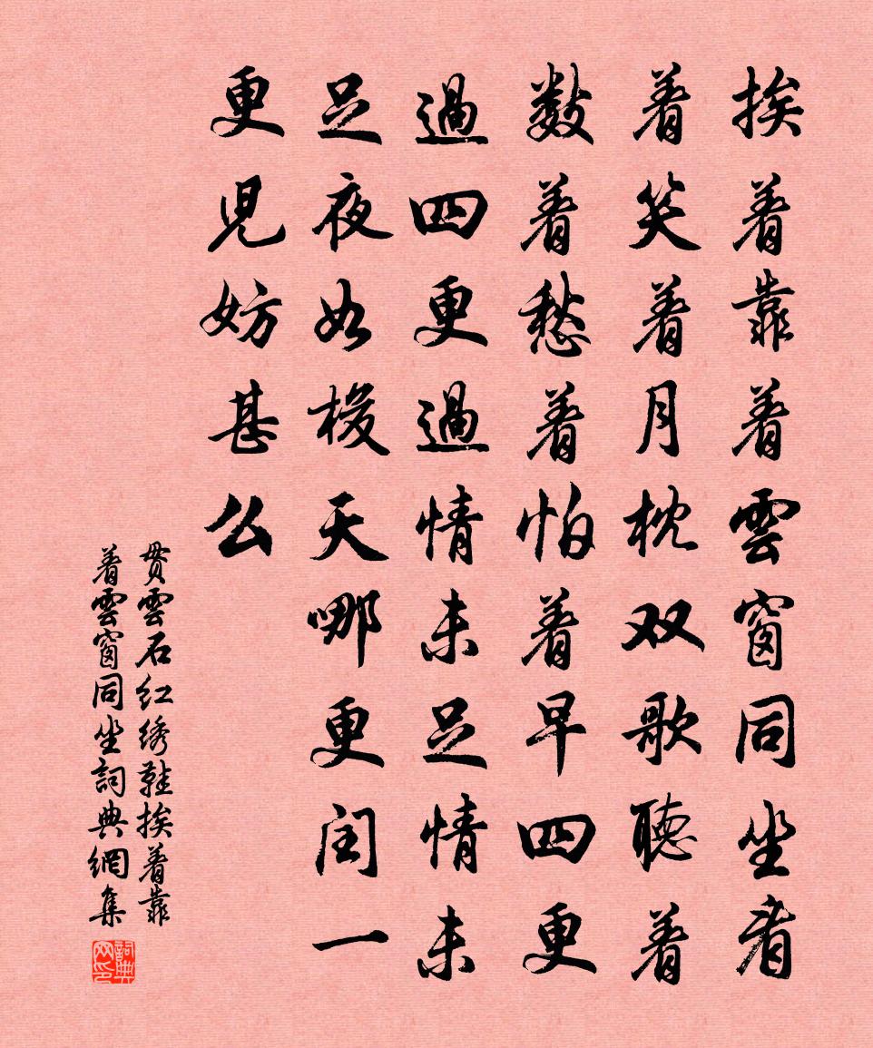 挨著靠著雲窗同坐,看著笑著月枕雙歌,聽著數著愁著怕著早四更過。四更過,情未足;情未足,夜如梭。