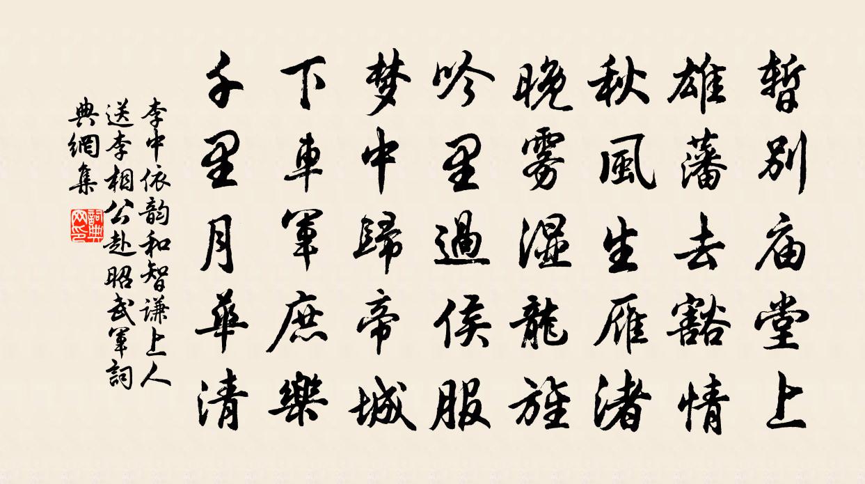 詩詞名句歷史字典書法欣賞書法字典國語詞典說文解字康熙字典古漢語字典標 題 作 者 詩 句 依韻和智謙上人送李相公赴昭武軍作者:李中 朝代:唐代原文暫別廟堂上,雄藩去豁情。秋風生雁渚,晚霧濕龍旌。吟里過侯服,夢中歸帝城。下車軍庶樂,千里月華清。詩詞問答問:《依韻和智謙上人送李相公赴昭武軍》的作者是誰?答:李中問:該詩寫於哪個朝代?答:唐代問:該詩是什麼體裁?答:五律書法欣賞依韻和智謙上人送李相公赴昭武軍書法作品注釋全唐詩:卷747-17詩詞推薦偈釋宗演〔宋代〕一九與二九,相逢不出手。世間出世間,無剩亦無少。送潘翠谷方逢辰〔宋代〕無屋住僧廬,無菜挑野草。野草風味長,僧廬人跡少。剝剝誰扣扃,訪予事幽討。錢唐有騷翁,自號翠谷老。疋馬次韻寄汪教授二首陳造〔宋代〕客路何人起病懷,論交今得謫仙才。每當玉麈玄譚勝,不問銅壺漏箭催。魯泮舊常烹瓠葉,廣平聊復賦江梅。揆予石菊史鑄〔宋代〕乾弱葉織花特奇,艷濃九夏到秋進。枝頭結實元為樂,爭奈越中人罕知。酬韓侍郎張博士雨後游曲江見寄白居易〔唐代〕小園新種紅櫻樹,閒繞花行便當游。何必更隨鞍馬隊,沖泥蹋雨曲江頭。無眠虞儔〔宋代〕蛩吟砌下豈知時,我亦無眠有所思。夜永只憐燈作伴,秋涼最許簟先知。十年擾擾夢中事,一笑悠悠世上兒。數盡應詔內苑牡丹三首千葉宋祁〔宋代〕一豫凝皇覽,千英薦瑞葩。壓枝高下錦,斜蕊淺深霞。疊采晞陽媚,鮮苞照露斜。九莖休衒葉,五出浪言花。鬱郁曾季飲少卿安序堂次朱希真韻周必大〔宋代〕行藏本同塗,明哲遇輒安。畎畝道可樂,肯思負鼎乾。膰肉倘愛禮,豈遽涉汶川。大哉天地準,笑汝士女耽。丈人木蘭花/玉樓春朱敦儒〔宋代〕老後人間無去處。多謝碧桃留我住。紅塵回步舊煙霞,清境開扉新院宇。隱几日長香一縷。風散飛花紅不聚。眼前贈李支使方乾〔唐代〕藥成平地是寥天,三十人中最少年。白雪振聲來輦下,青雲開路到床前。公卿位近應翹足,荀宋才微可拍肩。一等玉甑峰陳岩〔宋代〕茹芝仙客老仙鄉,淨盡人間粒食腸。玉甑豈能無用處,幾番與世熟黃粱。清平樂袁去華〔宋代〕春衫袖窄。燭底橫波溢。困倚屏風無氣力。故故停歌駐拍。夜深滿勸金杯。曲中偷送情來。歸去十分準擬,今宵夢通真觀李堅〔宋代〕璇璿非復舊宮壇,獨向徐碑識二難。井底丹靈勿輕汲,昔年曾壽兩蒼官。中秋待月不見仇遠〔宋代〕期修翫事在杭州,月夕那知常滯留。縱有侯芭常載酒,惜無李白共登樓。蛩催纖婦貧非懶,雲掩霜娥老似羞。應笑挽高宗皇帝章四首衛涇〔宋代〕歷數千齡在,謳歌四海歸。地雄元帥府,天授上皇衣。洗甲乾坤淨,投戈日月揮。成功有如此,今古獨巍巍。齋後與金老銛朴翁聰自酌龍進而發姜夔〔宋代〕年時六月海揚塵,遙見青山起白雲。聞有高僧一誦咒,岩前拋珓問龍君。同諸友山行分袂言別五首程公許〔宋代〕羅家隔香積,天國近花坪。何日同搜覽,題詩索載賡。和龔漕二首吳芾〔宋代〕人生笑口苦難開,故事當修戲馬台。已許為君拼一醉,何妨今日且銜杯。七絕句羅公升〔宋代〕賈生空痛哭,漢吏孰分憂。謾倚天為命,天命不自由。黃魯直真一酒詩帖贊岳珂〔宋代〕以蜜為酒,昉於東坡,托詩惟傳,百世不磨。然而濁為賢而清為聖,泛為醪而盎為酇。自古以降,厥名孔多,要皆名句推薦三更月。中庭恰照梨花雪。賀鑄《子夜歌·三更月》 欲知卻老延齡藥,百草摧時始起花。蘇軾《趙昌寒菊》 雉雊麥苗秀,蠶眠桑葉稀。王維《渭川田家》 不見穿針婦,空懷故國樓。孟浩然《他鄉七夕》 蜀國曾聞子規鳥,宣城還見杜鵑花。李白《宣城見杜鵑花 / 子規》 小娃撐小艇,偷采白蓮回。白居易《池上》 涼月如眉掛柳灣,越中山色鏡中看。戴叔倫《蘭溪棹歌》 君子進則能益上之譽,而損下之憂戴聖《大戴禮記·曾子制言中第五十五》 不效艾符趨習俗,但祈蒲酒話昇平。殷堯藩《端午日》 波漂菰米沉雲黑,露冷蓮房墜粉紅杜甫《秋興八首》