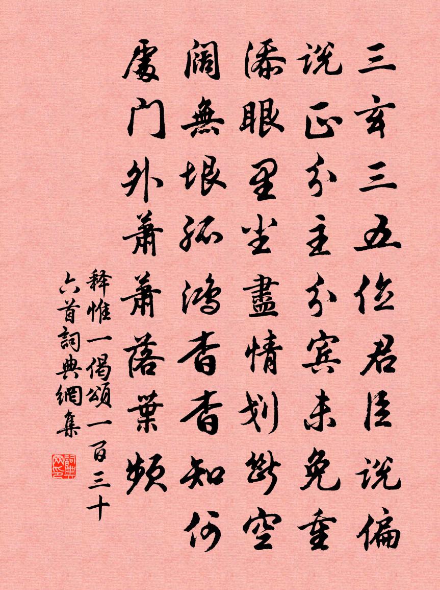 詩詞名句歷史字典書法欣賞書法字典國語詞典說文解字康熙字典古漢語字典標 題 作 者 詩 句 偈頌一百三十六首作者:釋惟一 朝代:宋代偈頌一百三十六首原文三玄三,五位君臣。說偏說正,分主分賓。未免重添眼裡塵。盡情劃斷,空闊無垠。孤鴻杳杳知何處,門外蕭蕭落葉頻。詩詞問答問:偈頌一百三十六首的作者是誰?答:釋惟一問:偈頌一百三十六首寫於哪個朝代?答:宋代釋惟一偈頌一百三十六首書法欣賞偈頌一百三十六首書法作品詩詞推薦程氏館燈下白菊花陳普〔宋代〕燈前一陣玉胡蝶,火急教人網取看。乃是徑中白甘菊,主人移入伴清寒。書梅福殿壁二首張喬〔唐代〕梅真從羽化,萬古是須臾。此地名空在,西山雲亦孤。井痕平野水,壇級上春蕪。縱有雙飛鶴,年多松已枯。一自小重山賀鑄〔宋代〕一葉西風生嫩涼。彩舟旗影動,背斜陽。溪流幾曲似迴腸。高城遠,今夜為誰長。正節號清狂。薴蘿標韻美,倚新慶吉父七十作詩敘事王洋〔宋代〕男有仁賢慶壽祺,不辭沽酒典春衣。年高且作尋常看,身健須夸七十稀。頰火欲燒雙鬢白,心閒時笑昔年非。誰夸衡山縣曉渡揭傒斯〔元代〕古縣依江次,輕輿落岸隈。鳥沖行客過,山向野船開。近岳皆雲氣,中流忽雨來。何時還到此,明月照沿洄。和淨因老師漁父詞釋子淳〔宋代〕錦鱗吞餌浮絲擺,樵父兩岸皆憐愛。直透龍門頭角改,誰能怪,為霖方顯靈通大。題平遼碑宇文虛中〔金代〕十丈豐碑勢倚空,風雲猶憶下遼東。百年功業秦皇帝,一代文章太史公。石斷雲鱗秋雨後,苔封鰲背夕陽中。行人訴鍾情顧敻〔唐代〕永夜拋人何處去?絕來音。香閣掩,眉斂、月將沉。爭忍不相尋?怨孤衾。換我心、為你心。始知相憶深。王更令王哲〔元代〕三更端,鼓聲正。咚咚響,韻音轉令鳴瑩。其中便、*現靈根,會通賢道聖。慢慢來回遊捷徑。傳銀箭這番,穿成和賈耘老春晚陳師道〔宋代〕縈縈裊裊幾絲飛,榴葉千燈照晚暉。紫翠園林鶯欲懶,黃昏簾幕燕初歸。花明西苑將迎幸,草綠平原正打圍。一臥春集東園賦得萼字王洙〔宋代〕燕退朝事希,鳴騶出雲閣。近游速朋彥,名園接闉郭。幽芳尚閒整,新樾已清漠。歡談一坐傾,遞飲百分涸。我亦秋蕊香楊 * 〔宋代〕向曉銀瓶香暖。宿蕊猶殘嬌面。風塵一縷透窗眼。恨入春山黛淺。短書封了憑金線。系雙燕。良人貪逐利名遠。不禪人並化主寫真求贊釋正覺〔宋代〕性成而不立玄微,智詣而難分是非。天空雲澹濘,夜冷月依稀。蝴蝶夢魂兮春晝飛而齊物,白鷗盟事兮夕陽臥而亡偈頌一百零二首釋紹曇〔宋代〕明月可中庭,雁影沉寒水。烹金爐冷歲華深,九鼎遺言猶在耳。深深撥著,宿火通紅。不假一槌成大器,刈禾鐮子【仙呂】點絳唇_翻《歸去來張可久〔元代〕翻《歸去來辭》歸去來兮,故鄉近日。田園內,蕪草荒迷,催把微官棄。【混江龍】既心為形役,何須惆悵自生悲選冠子張景修〔宋代〕嫩水采藍,遙堤映翠,半雨半煙橋畔。鳴禽弄舌,蔓草縈心,偏稱謝家池館。紅粉牆頭,柳搖金縷,纖柔舞腰低軟浣溪沙王哲〔元代〕會看虛空七寶圓。能開寂靜六華軒。希夷微妙在坤乾。理透陰符三百字,搜通道德五千言。害風一任害風虔。次韻答少章聞雁聽雞二首黃庭堅〔宋代〕平生絕少分甘處,身要從師萬事忘。霜雁叫群傾半枕,夢回兄弟彩衣行。鷓鴣天(壽定庵運管兄)張榘〔宋代〕飽挹台城白鷺秋。又騎黃鵠上江州。恩波浩蕩三千里,多少人家願借留。□壽斝,菊香浮。姓名還喜到宸旒。片□挽楊茂原二首趙蕃〔宋代〕玉美終懷璞,蘭香竟死林。名期百世後,恨獨九原深。夜雨長形夢,秋風遂絕音。扁舟載孤旐,行路亦沾襟。名句推薦驛路侵斜月,溪橋度曉霜。呂本中《南歌子·驛路侵斜月》 鳥宿池邊樹,僧敲月下門。賈島《題李凝幽居》 五月五日午,贈我一枝艾。文天祥《端午即事》 擢擢當軒竹,青青重歲寒。呂太一《詠院中叢竹》 惟有南來無數雁,和明月、宿蘆花。鄧剡《唐多令·雨過水明霞》 喜無以賞,怒無以殺管仲《管子·版法》 穿天透地不辭勞,到底方知出處高。馮雲山《詠瀑布》 其交也以道,其接也以禮孟子《孟子·萬章章句下·第四節》 眇能視,不足以有明也。跛能履,不足以與行也。佚名《易傳·象傳上·履》 歸來飽飯黃昏後,不脫蓑衣臥月明。呂岩《牧童 / 令牧童答鍾弱翁》