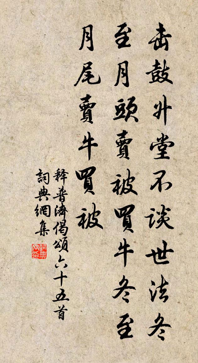 詩詞名句歷史字典書法欣賞書法字典國語詞典說文解字康熙字典古漢語字典標 題 作 者 詩 句 偈頌六十五首作者:釋普濟 朝代:宋代偈頌六十五首原文擊鼓升堂,不談世法。冬至月頭,賣被買牛。冬至月尾,賣牛買被。詩詞問答問:偈頌六十五首的作者是誰?答:釋普濟問:偈頌六十五首寫於哪個朝代?答:宋代釋普濟偈頌六十五首書法欣賞偈頌六十五首書法作品詩詞推薦大滌洞天留題果老〔宋代〕煙霞溟濛峰九轉,澱潑屏風倚天半。石龍背冷泉聲哀,萬疊靈鼉飛素練。江山登臨夙所願,何當騎麟醉游遍。仙人問性之病胡仲參〔宋代〕莫向推敲苦用心,聞君病里亦沉吟。書燈挑盡無人共,藥鼎煎殘到夜深。霜後菊花方寂寂,臘前梅事又駸駸。相看樊山張耒〔宋代〕黃葉疏林江上洲,西風角怨夕陽樓。晚天紫翠凌空闊,只有樊山取意秋。和張倅唐英詠梅十四首陳傅良〔宋代〕若以色見我,色衰令人忘。香為眾妙宗,妙亦不在香。鄉來芸芸者,自意傲雪霜。當斯玉立時,曾莫一在旁。和僧廣實三首王之道〔宋代〕聞說年來貧更甚,生涯和地與錐無。通身是手承誰力,方信常人實若虛。感春三首張耒〔宋代〕日長殘雪滴高檐,院靜人閒風度簾。可是歲華隨日好,故應愁恨逐春添。雪後尋梅偶得絕句十首陸游〔宋代〕青帝宮中第一妃,寶香熏徹素綃衣。定知謫墮不容久,萬斛玉塵來聘歸。中書即事晏殊〔宋代〕慘慘高槐落,淒淒餘菊寒。粉牆多記墨,聊為拂塵看。壽台州黃守王之望〔宋代〕千載初平慶未窮,本支今復見仙翁。當年郜鼎爭尤力,此日於門報已隆。政尚寬和承祖烈,量涵清濁稱家風。賜金用晦翁十梅詩韻酬張伯修孫子直吳泳〔宋代〕書消燕日長,棋遣花院寂。何羨山中人,餐霞拾橡實。漁父詞/漁父蒲壽宬〔宋代〕葭荻橫披眾木東。浪花如雪晚來風。雲母幌,水晶宮。蓮花一葉白頭翁。吳武昌孫元晏〔唐代〕西塞山高截九垓,讖謠終日自相催。武昌魚美應難戀,歷數須歸建業來。寄題張受益會清堂方回〔宋代〕伏生年九十,腹貯秦坑書。終童年十八,手擲漢關繻。一老一妙年,智勇夫何如。兩皆濟南人,稟受風氣殊。乾坤同坰寄黃濟川五首吳則禮〔宋代〕甘作華顛老,聊尋潁上梅。長須喚舟楫,赤腳洗尊罍。白日要可挽,清香不受摧。若為教騕褭,載得阿川來。和葉性之喜十吳芾〔宋代〕去歲饑荒特異常,那知今日便豐穰。田疇雨足經時潤,院宇風生著處涼。老去我方辭五斗,秋來誰解積千倉。從今夜遊灕江上李昇之〔宋代〕灕江開遍四時花,遊覽都忘屐齒賒。風景雖宜秋向老,關山無奈客思家。漏傳樓上三通鼓,水落灘頭幾尺沙。京國徐祠曾碑久仆前山長鬍端逸與士友共豎之邀予陳杰〔宋代〕短世人間廈幾顛,高風湖上榻猶懸。荒涼士豎殘碑日,遼邈官修廢祀年。萬古南州人似玉,千秋曾子筆如椽。斯文貧甚賣常用酒杯作詩自戲陸游〔宋代〕桃李成塵渾不數,海棠也作臙脂雨;清明未到春已空,枝上流鶯替人語。逢春日日合醉歸,莫笑典衣窮杜甫。生時農舍陸游〔宋代〕萬錢近縣買黃犢,襏襫行當東作時。堪笑江東王謝輩,唾壼塵尾事兒嬉。十二月十七日歸故園酌紅梅花下舒岳祥〔宋代〕今年剩有冬一月,今冬先得半月春。留春借冬皆樂事,但苦世上無閒人。平皋梅花如雪浪,夜色晨光迷滉漾。就中名句推薦飛雲當面化龍蛇,夭矯轉空碧。秦觀《好事近·夢中作》 不求同日生,只願同日死。施耐庵《水滸傳·第二回》 晚食以當肉,安步以當車劉向《戰國策·齊四·齊宣王見顏斶》 白雲回望合,青靄入看無。王維《終南山》 流年莫虛擲,華發不相容。方乾《送從兄郜 / 韋郜 / 途中別孫璐》 六翮飄颻私自憐,一離京洛十餘年。高適《別董大二首》 長安大雪天,鳥雀難相覓。張孜《雪詩》 道不同,不相為謀。孔子弟子《論語·衛靈公篇》 提出西方白帝驚,嗷嗷鬼母秋郊哭。李賀《春坊正字劍子歌》 於安思危,危則慮安。劉向《戰國策·楚四·虞卿謂春申君》