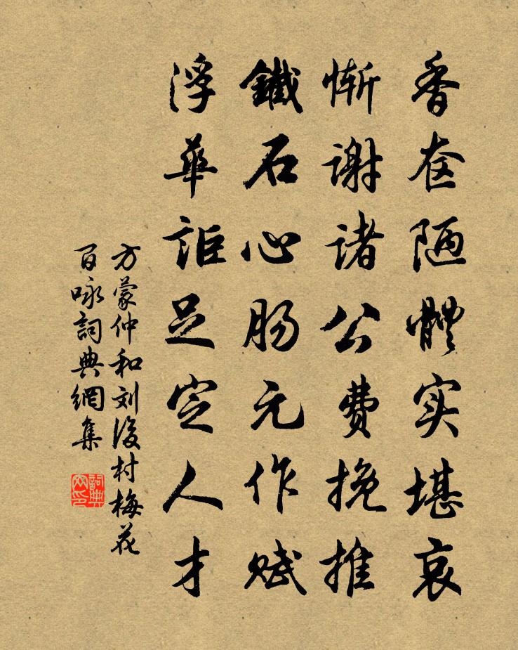 詩詞名句歷史字典書法欣賞書法字典國語詞典說文解字康熙字典古漢語字典標 題 作 者 詩 句 和劉後村梅花百詠作者:方蒙仲 朝代:宋代和劉後村梅花百詠原文香奩陋體實堪哀,慚謝諸公費挽推。鐵石心腸元作賦,浮華詎足定人才。詩詞問答問:和劉後村梅花百詠的作者是誰?答:方蒙仲問:和劉後村梅花百詠寫於哪個朝代?答:宋代方蒙仲和劉後村梅花百詠書法欣賞和劉後村梅花百詠書法作品詩詞推薦老而健貧而詩自志其喜八首方回〔宋代〕一時詩有思,何待苦吟成。老易惟難健,貧多但少清。藏書終不賣,耽酒別無營。十六年林下,休官萬事輕客感王珪〔唐代〕行子下驂去易迷,故鄉回首在天涯。春心南陌風光遠,曉夢西樓月影遲。沈客頻寬無奈瘦,阮生車斷不勝悲。花狂送羅判官還壽州幕皎然〔唐代〕君章才五色,知爾得家風。故里旋歸駕,壽春思奉戎。天寒長蛇伏,飆烈文虎雄。定頌張征虜,桓桓戡難功。苑中韓偓〔唐代〕上苑離宮處處迷,相風高與露盤齊。金階鑄出狻猊立,玉樹雕成狒犭術啼,外使調鷹初得按,中官過馬不教嘶。笙狀江南孟冬謝良輔〔唐代〕江南孟冬天,荻穗軟如綿。綠絹芭蕉裂,黃金橘柚懸。憩南屏釋紹嵩〔宋代〕窈窕階除天一方,隔簾時有芰荷香。老僧瀹茗供清興,不負西湖五月涼。江頭張籍〔唐代〕晚步隨江遠,來帆過眼頻。試尋新住客,少見故鄉人。回首憐歸翼,長吟任此身。應同南浦雁,更見嶺頭春。春日龍輔〔宋代〕風吹花香薰洞房,白日照鏡光射梁。後園草暖雙蝶曬,堂前塵落對燕翔。代書寄馬韋莊〔唐代〕驅馳曾在五侯家,見說初生自渥窪。鬃白似披梁苑雪,頸肥如撲杏園花。休嫌綠綬嘶貧舍,好著紅纓入使衙。穩上蟬陸九淵〔宋代〕風露枯腸里,宮商兩翼頭。壯號森木晚,清嘯茂林秋。南湖靜寄史彌寧〔宋代〕綿蕝南湖屋數椽,鷗邊一壑許容儂專。小軒東面雲生樹,貢檻前頭水接天。餉客清風無盡藏,可人明月不論錢。愛邵公濟求泰定山房十詩下馬橋蘇籀〔宋代〕泉下顏光祿,二紀瞻馬首。停驂肅松檟,風節應不朽。寄四明乾月庭厲二友顧逢〔宋代〕無言獨倚樓,故人在心頭。幾作宵中夢,多生別後愁。溪聲疏竹下,月色一庭秋。此景皆詩料,何時共唱酬。雜詩絕句十七首梅堯臣〔宋代〕度水紅蜻蜓,傍人飛欵欵。但知隨船輕,不知船去遠。過芙蓉嶺對鏡嶺羊斗嶺新嶺塔嶺賦短歌五首方回〔宋代〕客謂老夫今老矣,胡為尚落空山里。千艱百難萬不平,上嶺下嶺不肯已。此嶺第三未為險,人面獸心險於此。乾坤天游峰劉邊〔宋代〕紫翠飛來石蕊間,何年雙出小瀛寰。崖懸瘦瀑一千尺,峽束寒流 * 灣。蒼壁向人如有待,白云何事未知還。歌酣哭劉仲邍司馬光〔宋代〕昔醉金明渚,今來慧辯祠。當年笑相親,此日哭殊悲。天迥種原淨,風高草木衰。江梅靈氣在,泉下復相知。次韻景文山堂聽箏三首蘇軾〔宋代〕忽憶韓公二妙姝,琵琶箏韻落空無。猶勝江左狂靈運,空斗東昏百草須。馬上胡琴塞上姝,鄭中丞後有人無。詩成長樂集總序謝泌〔宋代〕潮田種滔重收谷,山路逢人半是僧。城裡三山千簇寺,夜間七塔萬枝燈。題釣台障子李頻〔唐代〕君家儘是我家山,嚴子前台枕古灣。卻把釣竿終不可,幾時入海得魚還。名句推薦天南地北雙飛客,老翅幾回寒暑。元好問《摸魚兒·雁丘詞 / 邁陂塘》 晝短苦夜長,何不秉燭游!佚名《生年不滿百》 三代之得天下也以仁,其失天下也以不仁。孟子《孟子·離婁章句上·第三節》 惟德動天,無遠弗屆。佚名《尚書·虞書·大禹謨》 竹邊荷外再相逢,又還是、浮雲飛去。趙以夫《鵲橋仙·富沙七夕為友人賦》 積土成山,風雨興焉;荀子《勸學》 我閉南樓看道書,幽簾清寂在仙居。李白《早秋單父南樓酬竇公衡》 武帝宮中人去盡,年年春色為誰來。岑參《登古鄴城》 靡靡秋已夕,淒淒風露交。陶淵明《己酉歲九月九日》 衣懶換,酒難賒。可憐此夕看梅花。吳文英《思佳客·癸卯除夜》