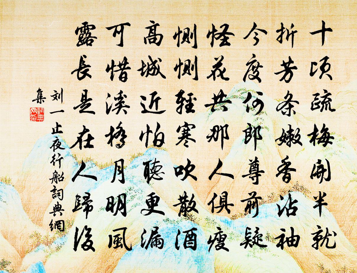 詩詞名句歷史字典書法欣賞書法字典國語詞典說文解字康熙字典古漢語字典標 題 作 者 詩 句 夜行船作者:劉一止 朝代:宋代夜行船原文十頃疏梅開半就。折芳條、嫩香沾袖。今度何郎,尊前疑怪,花共那人俱瘦。惻惻輕寒吹散酒。高城近、怕聽更漏。可惜溪橋,月明風露,長是在人歸後。詩詞問答問:夜行船的作者是誰?答:劉一止問:夜行船寫於哪個朝代?答:宋代問:夜行船是什麼體裁?答:詞劉一止夜行船書法欣賞夜行船書法作品詩詞推薦大滌洞天留題倪允文〔宋代〕巢父灘頭甫著鞭,名山入眼驛程邊。迂迴僅費商於地,領袖寧煩一介先。絕句二首劉克莊〔宋代〕枝上好花無十日,松梢老葉有千年。靜中勘破人間世,醒者常愚醉者賢。題信豐縣城門六首民信羅椅〔宋代〕南山天馬來,南城下盤踞。前撞古寺鐘,後捶譙樓鼓。我來俯崔巍,山靈相呼舞。年豐慢物熙,細聽閶閻語。戲友不識硯戴泰〔宋代〕古今天下多奇石,甲品從來只數端。千丈割雲潭影濕,一泓貯水月光寒。青瞳要辨生鴝眼,紫色須求死馬肝。鼠璞八月初一日方回〔宋代〕秋風幾日尚無詩,政坐炎歊轉赫曦。閒被貧為魔攬撓,病須涼當藥醫治。薄田董獲收新粟,老圃開包獻巨梨。顧此十日夜月中馬上作陸游〔宋代〕身游碧海跨鯨魚,心似寒冰貯玉壺。衣濕三更清露墜,眼明萬里片雲無。橫空孤鶴曾相識,散發飛僊定可呼。老向芳華樓夜飲陸游〔宋代〕結客追游亦樂哉!城南城北古池台。香生赭汗連錢馬,光溢金船撥雪醅。難覓長繩縻日住,且憑羯鼓喚花開。一春謝景文惠浩然所作廷珪墨黃庭堅〔宋代〕廷珪贗墨出蘇家,麝煤漆澤紋烏鞾。柳枝瘦龍印香字,一襲一日三摩挲。劉侯愛我如桃李,揮贈要我書萬紙。不意和邠老郎官湖懷古五首賀鑄〔宋代〕岑輔何為者,當年唱不應。名隨詩石在,附驥兩青蠅。水仙子薛昂夫〔元代〕幾年無事傍江湖,醉倒黃公舊酒壚。人間縱有傷心處,也不到劉伶墳上土,醉鄉中不辨賢愚。對風流人物,看江山寄和竹所叔攝慈谿稅官二首何夢桂〔宋代〕半夜愚翁挾北山,頭銜休系舊時官。風雲失手劍光冷,霜雪滿頭衣頻寬。歸去荒園三徑菊,相期晏歲九皋蘭。年年和人梅詩吳則禮〔宋代〕玉妃從以萬玉發,正倚廣寒琪樹柯。端憐橫笛隴頭罷,不恨落梅江上多。翠袖清尊知老矣,薰爐茗碗奈儂何。夢驚湖山陸游〔宋代〕淺井供茶灶,分流浣布沙。此泉吾所愛,百用給山家。孟津歲晚十首宋庠〔宋代〕地闊山川嶮,風高萬卉乾。山煙晨作暝,河氣晚催寒。革眼移前帶,梁金晦舊冠。胡然坐衰靡,無客餉千丸。和陳無逸木犀牟巘五〔宋代〕秋旻金氣正高張,並作西風一夜涼。何處杯中無白墮,如今扇底有黃香。自慚老卉如犀禿,卻笑春花為蝶狂。勝賞別天目施樞〔宋代〕東尖森洞穴,西目浚淵庭。三日若為霽,群龍亦有靈。立依松作蓋,坐倚石為屏。猶恨歸鞍急,回頭望遠青。吳門晚泊寄句曲道友羅隱〔唐代〕采香徑在人不留,采香徑下停葉舟。桃花李花斗紅白,山鳥水鳥自獻酬。十萬梅鋗空寸土,三分孫策竟荒丘。未知韓信張耒〔宋代〕登壇一日冠群雄,鍾室倉皇念蒯通。能用能誅誰計策,嗟君終自愧蕭公。省試白雲起封中陳希烈〔唐代〕千年泰山頂,雲起漢王封。不作奇峰狀,寧分觸石容。為霖雖易得,表聖自難逢。冉冉排空上,依依疊影重。素光月色許月卿〔宋代〕明月亦清哉,清風絕點埃。村童催睡去,野叟問禪來。樂事賞心夜,清風明月梅。夜深群籟靜,猿鶴莫相猜。名句推薦朝來入庭樹,孤客最先聞。劉禹錫《秋風引》 採蓮南塘秋,蓮花過人頭。佚名《西洲曲》 聞道欲來相問訊,西樓望月幾回圓。韋應物《寄李儋元錫》 雨足高田白,披蓑半夜耕。崔道融《田上》 可能無意傳雙蝶,盡付芳心與蜜房。宋祁《落花》 為君憔悴盡,百花時。溫庭筠《南歌子·倭墮低梳髻》 北山白雲里,隱者自怡悅孟浩然《秋登萬山寄張五/九月九日峴山寄張子容》 天子臨軒賜侯印,將軍佩出明光宮。王維《少年行四首》 林花謝了春紅,太匆匆。無奈朝來寒雨晚來風。李煜《相見歡·林花謝了春紅》 塞雁高飛人未還,一簾風月閒。李煜《長相思·一重山》