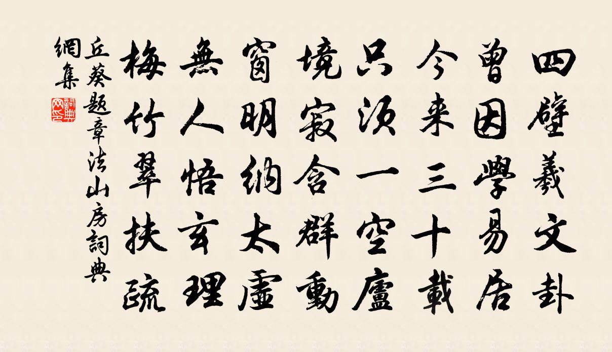 詩詞名句歷史字典書法欣賞書法字典國語詞典說文解字康熙字典古漢語字典標 題 作 者 詩 句 題章法山房作者:丘葵 朝代:宋代題章法山房原文四壁羲文卦,曾因學易居。今來三十載,只須一空廬。境寂含群動,窗明納太虛。無人悟玄理,梅竹翠扶疏。詩詞問答問:題章法山房的作者是誰?答:丘葵問:題章法山房寫於哪個朝代?答:宋代丘葵題章法山房書法欣賞題章法山房書法作品詩詞推薦簡吳郎司法杜甫〔唐代〕有客乘舸自忠州,遣騎安置瀼西頭。古堂本買藉疏豁,借汝遷居停宴遊。雲石熒熒高葉曙,風江颯颯亂帆秋。卻為已本立春前一日得雨時有百日之晴鄭剛中〔宋代〕陽春明日五更回,破旱先令一雨來。要得群生蒙實惠,故將膏澤潤枯荄。九日方回〔宋代〕樓前樓比後徘徊,便當登高百尺台。海內共知吾輩老,江南未見菊花開。細思去歲人誰健,遙想中原雁已來。我似到京師楊載〔元代〕城雪初消薺菜生,角門深巷少人行。柳梢聽得黃鸝語,此是春來第一聲。命解度正〔宋代〕世謂臧倉解譖軻,豈知天意在干戈。如天便欲平天下,縱百臧倉不奈何。送侄孫周上人歸剡余亦入吳門釋行海〔宋代〕三十餘年不在家,齒搖發白眼昏花。如今送子東歸去,心逐征帆過白沙。憶長安。十二月謝良輔〔唐代〕憶長安,臘月時,溫泉彩仗新移。瑞氣遙迎鳳輦,日光先暖龍池。取酒蝦蟆陵下,家家守歲傳卮。以玉帶施元長老元以衲裙相報次韻〔二首〕蘇軾〔宋代〕病骨難堪玉帶圍,鈍根仍落箭鋒機。欲教乞食歌姬院,故與雲山舊衲衣。此帶閱人如傳舍,流傳到我亦悠哉。錦袍題墨竹釋慧遠〔宋代〕通乎筆端之有神,妙乎造化之有功。戲蒼龍之引尾,背皓月而搖風。疏影無聲亂寒墨,瘦枝有葉翻秋空。比因和首座詩有故欲撩公懶是真之句名其室日趙蕃〔宋代〕少日經禪暇,猶余文字嬉。老來無復事,日用亦奚為。衲被忘宵度,團蒲失晝移。謂公真是懶,如我不其痴。次韻岩起綠萼梅李彌遜〔宋代〕村上未聞睍睆,杯中初薦屠酥。誰遣雲英萼綠,臨風搖曳輕裾。沈朝議之淵輓詩蔡戡〔宋代〕早擅雲間譽,唯公伯仲賢。諫篇余祖烈,經學自家傳。出處無餘恨,哀榮得兩全。善人今已矣,埋玉向新阡。和兼善韻袁說友〔宋代〕江湖蹤跡厭萍游,只有詩魔老未休。平日故人談語句,朞胩裹眼識風流。自能作意閒中趣,無復關心世外愁。趁此答鍾元達覓藉栽二首劉宰〔宋代〕紅妝翠蓋出污塗,水面風吹醉欲扶。逢是凌波有仙種,文君莫訝茂陵姝。挽先兄維曼大司農李盤〔清代〕不向青山正首丘,願傾熱血濺刀頭。出師表上風雷動,轉餉籌空日月愁。蝴蝶三更思漢鼎,子規萬里怨吳鉤。英魂虞神歌(一曲)范祖禹〔宋代〕駕玉龍。設初虞祭終。前旌舉,天回洛水,路轉崧峰。瞻寥廓,煙霏沖融。窅無蹤。震地鼓吹悲雄。誰何羽衛重。牽牛花趙與滂〔宋代〕西風樵了谷,藤蔓絡柴關。名在星河上,花開曉露間。秋空同碧色,曉日轉紅顏。若掛青松頂,翛然不可攀。送英公大師歸終南盧岳〔宋代〕擬息遊方興,蘿龕近翠微,幾程勞夜夢,一錫向秋歸。月彩籠清磬,嵐光潤紫衣。重尋溪上路,楓葉下岩扉。徐孺子讀書台分得高字孫素〔宋代〕吾愛徐聘君,沈冥乃人豪。諸賢搆黨禍,皎皎雲鴻毛。璋生讀何書,身隱名難逃。故宅照湖水,荒墳翳城蒿。焉知出歌孫楚〔魏晉〕茱萸出芳樹顛。鯉魚出洛水泉。白鹽出河東。美豉出魯淵。薑桂茶荈出巴蜀。椒橘木蘭出高山。蓼蘇出溝渠。精{名句推薦肉腐出蟲,魚枯生蠹。荀子《荀子·勸學》 中原事業如江左,芳草何須怨六朝。納蘭性德《秣陵懷古·山色江聲共寂寥》 舉大事必有所資李大師、李延壽《南史·列傳·卷五十三》 望君煙水闊,揮手淚沾巾。劉長卿《餞別王十一南遊》 知者順時而謀,愚者逆理而動范曄《後漢書·列傳·朱馮虞鄭周列傳》 漸紅濕杏泥,愁燕無語。吳文英《掃花游·西湖寒食》 桃花塢裏桃花庵,桃花庵裏桃花仙。唐寅《桃花庵歌》 來歲長安春事早,勸杏花、斷莫相思死。龔自珍《金縷曲·癸酉秋出都述懷有賦》 眼見的吹翻了這家,吹傷了那家,只吹的水盡鵝飛罷!王磐《朝天子·詠喇叭》 花漸凋疏不耐風,畫簾垂地晚重工,墮階縈蘚舞愁紅孫光憲《浣溪沙·花漸凋疏不耐風》