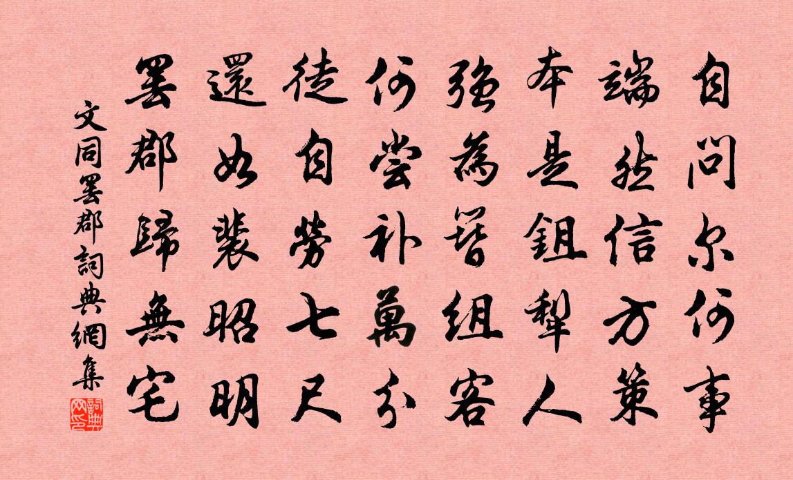 詩詞名句歷史字典書法欣賞書法字典國語詞典說文解字康熙字典古漢語字典標 題 作 者 詩 句 罷郡作者:文同 朝代:宋代罷郡原文自問爾何事,端然信方策。本是鉏犁人,強為簪組客。何嘗補萬分,徒自勞七尺。還如裴昭明,罷郡歸無宅。詩詞問答問:罷郡的作者是誰?答:文同問:罷郡寫於哪個朝代?答:宋代文同罷郡書法欣賞罷郡書法作品詩詞推薦冬祠太乙六言范成大〔宋代〕行道羽衣縹緲,卷班玉佩冬瓏。回首金鋪獸面,步虛聲在天風。聽安萬善吹觱篥歌李頎〔唐代〕南山截竹為觱篥,此樂本自龜茲出。流傳漢地曲轉奇, 涼州胡人為我吹。傍鄰聞者多嘆息,遠客思鄉皆淚垂。 讀白樂天臨水坐詩陳師道〔宋代〕西方社裡收身早,白髮人中得計長。不作北門東掖客,更無閒事可思量。減字木蘭花(二十六日立春)張孝祥〔宋代〕春如有意。未接年華春已至。春事還新。多得年時五日春。春郊便綠。只向臘前春已足。屈指元宵。正是新春二十水調歌頭(壽趙宰母)彭叔夏〔宋代〕銅章紆墨綬,茜服佩銀魚。慈闈一笑,全勝萊子彩衣裾。好事柿紅萱草,長伴朱顏綠髮,榮貴更誰如。軸錦裝鸞誥敘倫五言二十首劉克莊〔宋代〕晨膳嫌羹薄,寒機怪織遲。阿家語新婦,汝有作家時。擬古其五李白〔唐代〕今日風日好,明日恐不如。春風笑於人,何乃愁自居。 * 舞彩鳳,酌醴鱠神魚。千金買一醉,取樂不求餘。達士春寒復作陸游〔宋代〕春寒已解忽復作,病思不堪當語誰?青燈熒熒耿欲滅,殘雨滴滴休無期。故人已死夢中見,壯志未忘心自知。青絲遊子蘇泂〔宋代〕遊子那無故,青春亦有歸。小舟沖岸疾,白鳥破煙飛。物理迷終極,人生喜願違。東南雙病眼,隨日下漁磯。虞美人(代內)晁補之〔宋代〕梅花時候君輕去。曾寄紅箋句。胡麻好種少人知。正是歸時何處、誤芳期。誰教又作狂游遠。歸路楊花滿。當年不次韻仇仁近用韻見示五首方回〔宋代〕治任猶近旦中觿,旅次今移日至圭。惡況味逢佳節序,懶情懷怯好詩題。向來守黑元知白,幾輩平東復鎮西。定是二月十一日夜夢作東都蠶春絕句楊萬里〔宋代〕道是春來早,如何未見春。小桃三四點,偏報有情人。答劉競張籍〔唐代〕劉君久被時拋擲,老向城中作選人。昨日街西相近住,每來存問老夫身。尋陽道中作齊己〔唐代〕秋聲連岳樹,草色遍汀洲。多事時為客,無人處上樓。雲疏片雨歇,野闊九江流。欲向南朝去,詩僧有惠休。徑山出鄉舟中寄二偈示眾釋鹹傑〔宋代〕三冬水上打鞦韆,百尺竿頭棹釣船。寄語滿堂龍象眾,無勞掘地覓青天。飲酒·其四陶淵明〔魏晉〕秋菊有佳色,裛露掇其英。泛此忘憂物,遠我遺世情。一觴雖獨盡,杯盡壺自傾。日入群動息,歸鳥趨林鳴。嘯傲宮詞一百首岳珂〔宋代〕治定功成第四朝,八音純繹度英韶。儀凰舞獸今千載,還見安安似帝堯。句陳善〔宋代〕春風一日歸深院,巫峽千山鎖暮雲。句宗必經〔宋代〕不覺授書冬再易,我思黃霸欲消魂。新月二章張玉孃〔宋代〕拜新月,拜月下庭除。欲祝心間事,未語先慘悽。名句推薦胡馬依北風,越鳥巢南枝。佚名《行行重行行》 離歌且莫翻新闋。一曲能教腸寸結。歐陽修《玉樓春·尊前擬把歸期說》 賈生年少虛垂淚,王粲春來更遠遊。李商隱《安定城樓》 事君數,斯辱矣;朋友數,斯疏矣。孔子弟子《論語·里仁篇》 甘井近竭,招木近伐。墨子《墨子·01章 親士》 階下青苔與紅樹,雨中寥落月中愁。李商隱《端居》 黃雞白酒,君去村社一番秋。辛棄疾《水調歌頭·送楊民瞻》 別裁偽體親風雅,轉益多師是汝師。杜甫《戲為六絕句》 星垂平野闊,月涌大江流。杜甫《旅夜書懷》 天秋月又滿,城闕夜千重。戴叔倫《客夜與故人偶集 / 江鄉故人偶集客舍》