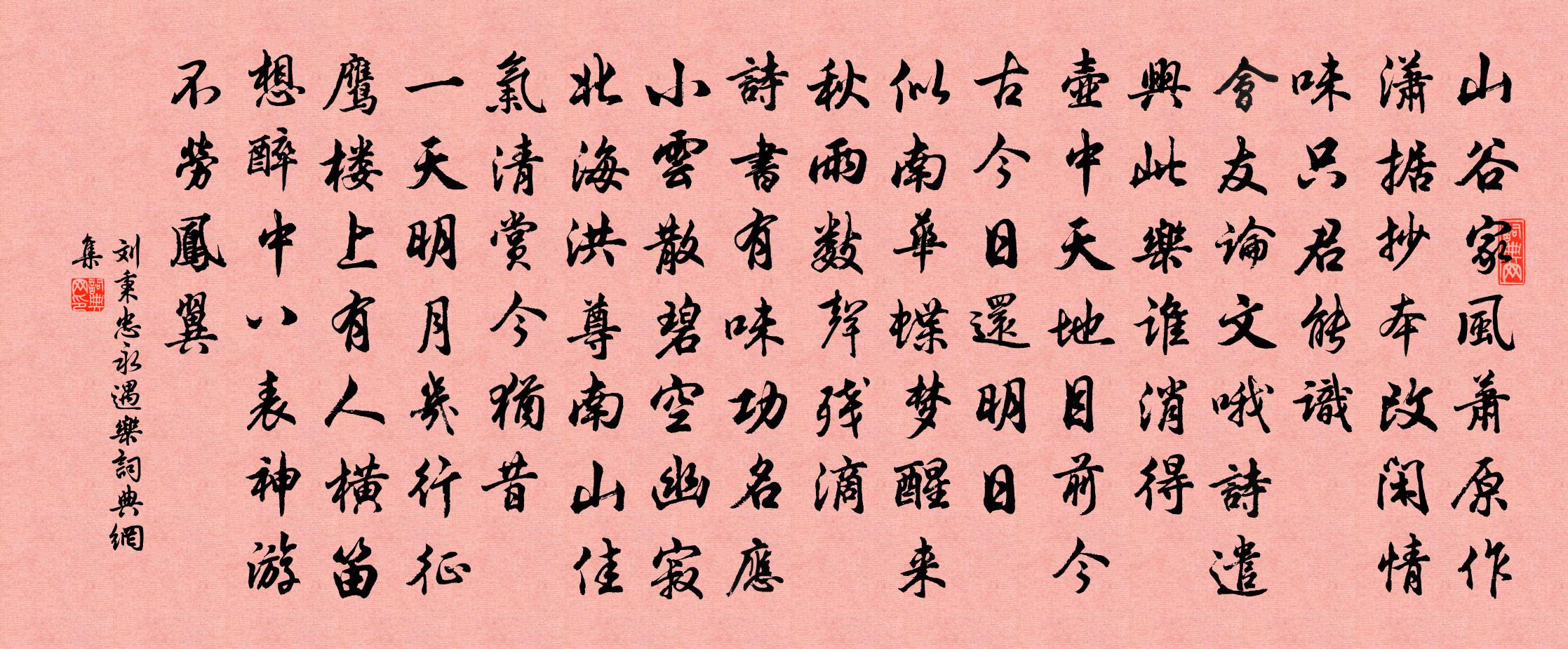 詩詞名句歷史字典書法欣賞書法字典國語詞典說文解字康熙字典古漢語字典標 題 作 者 詩 句 永遇樂作者:劉秉忠 朝代:元代永遇樂原文山谷家風,蕭原作瀟,據抄本改閒情味,只君能識。會友論文,喔詩遣興,此樂誰消得。壺中天地,目前今古,今日還明日。似南華蝶夢醒來,秋雨數聲殘滴。詩書有味,功名應小,雲散碧空幽寂。北海洪尊,南山佳氣,清賞今猶昔。一天明月,幾行征鷹,樓上有人橫笛。想醉中、八表神遊,不勞鳳翼。詩詞問答問:永遇樂的作者是誰?答:劉秉忠問:永遇樂寫於哪個朝代?答:元代問:永遇樂是什麼體裁?答:詞劉秉忠永遇樂書法欣賞永遇樂書法作品詩詞推薦隆興書堂自警三十五首陳淳〔宋代〕富貴以榮親,有命不可必。道義以榮親,古人所無斁。送歐陽仲勉通判渭州孔武仲〔宋代〕當年筆戰共詞場,老大聯祛振鷺行。薦牘北來當玉座,軺車西去擁銀章。潼關曉色雲藏市,渭貢春寒菜有霜。公退高文廟趙汝譡〔宋代〕盛朝陵谷遠,遺廟林麓長。美哉漢二君,百世常流光。功高拯塗炭,德盛敦農桑。興禮表儒化,授經恢士方。盡令擬娼樓節怨劉方平〔唐代〕上苑離離鶯度,昆明冪冪蒲生。時光春華可惜,何須對鏡含情。念奴嬌(持節道京城中秋日)曹勛〔宋代〕五門照日,是真人膺籙,炎圖家國。二百年來,撫四海安樂,六服承德。虎旅橫江,胡塵眯眼,恨有中原隔。宮城句張埴客〔宋代〕無雙詩客到江乾,願借明珠一顆觀。紀游十首劉克莊〔宋代〕捫蘿伏虎岩,把釣斬蛟潭。偶有樵夫過,呼來與共談。戲答林園白居易〔唐代〕豈獨西坊來往頻,偷閒處處作遊人。衡門雖是棲遲地,不可終朝鎖老身。東京留守宗公靖康小雅〔宋代〕洪河滔滔,撼野摧山。砥柱中立,獨當狂瀾。敵勢焰焰,動植俱殘。公俯視之,若螢燐然。知無不為,獨殿中原。書黁公詩後(並敘)蘇軾〔宋代〕過加祿鎮南二十五里大許店,休焉於逆旅祁宗祥家。見壁上有幅紙題詩云:滿院秋光濃欲滴,老僧倚杖青松側。只寄并州故人鄭獬〔宋代〕年來羈客減歡游,少對清樽浣別愁。社裡故人相憶否,夜來歸夢到并州。答田端彥歐陽獻〔宋代〕莫嗟騏驥老,不識雲台仗。北驥天所脫,未易論得喪。明招雜詩四首呂祖謙〔宋代〕風檐裊茶煙,銅瓶語相泣。清陰一疎箔,不礙飛花入。送臨清楊可主簿入蜀王禹偁〔宋代〕脫白去焚黃,遙知祖德光。墓墳喬木老,襟袖桂枝香。回見梅含雪,歸逢橘飽霜。子云應有宅,為奠草玄堂。詠史下山濤陳普〔宋代〕君王祖述竹林風,竹葉紛紛插滿宮。禍亂古今惟晉酷,是非憂樂一山公。趙同叔開軒植竹以自娛樂諸公雖為賦詩而未嘗吳儆〔宋代〕手種琅玕翠竹行,幽窗一見自心涼。君家有此揚州鶴,倦客無由對一觴。偈傾一百三十三首釋法薰〔宋代〕晷運推移,日南長至。佛法世法,因行掉臂。高峰更囑諸人,第一莫眠冷地。早發杜甫〔唐代〕有求常百慮,斯文亦吾病。以茲朋故多,窮老驅馳並。早行篙師怠,席掛風不正。昔人戒垂堂,今則奚奔命。濤翻念奴嬌吳季子〔宋代〕雪羅桃初試,過桃賜衣時節桃,才三四桃日。記得延陵公子宅,麟角當年新紱。半刺名家,一經奧學,是青雲人物雨中觀廬山岳珂〔宋代〕半生每負看山眼,此日真成帶雨游。欹枕有無疑欲暮,成峰橫側總宜秋。耳喧似厭泉嗚咽,腰系不妨雲去留。明日名句推薦成大功者不小苛。劉向《說苑·政理》 草鋪橫野六七里,笛弄晚風三四聲。呂岩《牧童》 父老得書知我在,小軒臨水為君開。蘇軾《送賈訥倅眉》 且莫思身外,長近尊前。周邦彥《滿庭芳·夏日溧水無想山作》 情之所鍾,雖醜不嫌。沈復《浮生六記·閨房記樂》 公生明,偏生暗荀子《荀子·不苟》 海畔尖山似劍鋩,秋來處處割愁腸。柳宗元《與浩初上人同看山寄京華親故》 宿醉離愁慢髻鬟,六銖衣薄惹輕寒,慵紅悶翠掩青鸞韓偓《浣溪沙·宿醉離愁慢髻鬟》 詩成自寫紅葉,和恨寄東流。晏幾道《訴衷情·憑觴靜憶去年秋》 台榭空濛煙柳暗,白鳥銜魚欲舞。納蘭性德《摸魚兒·午日雨眺》