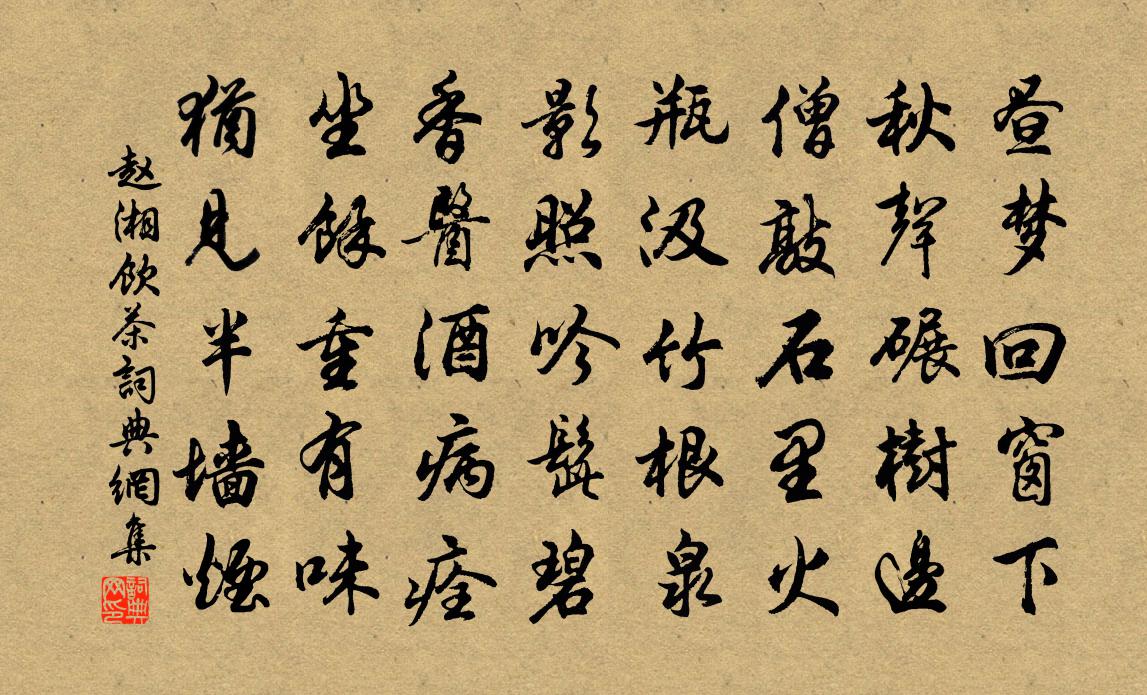 詩詞名句歷史字典書法欣賞書法字典國語詞典說文解字康熙字典古漢語字典標 題 作 者 詩 句 飲茶作者:趙湘 朝代:唐代飲茶原文晝夢回窗下,秋聲碾樹邊。僧敲石里火,瓶汲竹根泉。影照吟髭碧,香醫酒病痊。坐余重有味,猶見半牆煙。詩詞問答問:飲茶的作者是誰?答:趙湘問:飲茶寫於哪個朝代?答:唐代趙湘飲茶書法欣賞飲茶書法作品詩詞推薦哭陳先生呂岩〔唐代〕天網恢恢萬象疏,一身親到華山區。寒雲去後留殘月,春雪來時問太虛。六洞真人歸紫府,千年鸞鶴老蒼梧。自從寓言舒岳祥〔宋代〕妾家梯有高樓,梯高高入青梯天。欲作梯萬丈梯,倚空無攀援。良人在恨里,一去幾經年。長路與天接,舉足躡星卜運算元(李季允屷約登鄂州南樓即席次韻)魏了翁〔宋代〕攜月上至南樓,月已穿雲去。莫照峨眉最上峰,同在峰前住。東望極青齊,西顧窮商許。酒到憂邊總未知,猶認胡戊申年七夕五絕薛映〔宋代〕碧天如水月如鉤,金露盤高玉殿秋。青鳥潛來報訊息,一時西望九花虯。題九仙宮高獻民〔宋代〕迢遞尋真到紫壇,參差樓閣倚層巒。三株樹古巢玄鶴,五粒松低下素鸞。煙暖芝田應有玉,樹封藥灶已無丹。昔人送王子正宰長樂二首陳淳〔宋代〕一陽天運復來亨,君子隨時亦吉徵。暫向三山瀕海處,小馳百里愛人聲。從知文物新長樂,便作弦歌舊武城。須信淑妃閣端午帖子夏竦〔宋代〕宴寢奉朝鳴采玉,良辰襲慶表長絲。仰承中壺垂芳裕,永播周南逮下詩。紅梅石延年〔宋代〕梅好唯傷白,今紅是絕奇。認桃無綠葉,辨杏有青枝。烘笑從人贈,酡顏任笛吹。未應嬌意急,發赤怒春遲。虞美人邵亨貞〔元代〕天涯綠遍王孫草。魂夢長飛繞。長安無復麗人行。只有青山,依舊向人明。平泉金谷俱陳跡。古路荒苔碧。金鞍去東風第一枝 年來逆境驅馳,不知歲序之有游邵亨貞〔元代〕與南金翦鐙小酌,分題寫懷。追念古人樂事,今無一在眼,時於文字中見其一二,遂各想像舊事為之。然心之所好同水心吊薛子舒墓戴栩〔宋代〕自劚青雲去,長途墜玉鑣。有名天所吝,無病藥為妖。月斧千家寂,霓梭五色銷。夢靈虛吐鳳,數短實如鴞。筦庫扶風馬君輓詞樓鑰〔宋代〕豁野真連璧,一齋寧遺金。齊家平日學,憂世百年心。折券無難色,傾囷想義襟。月評何處見,名士列碑陰。尋戴處士皇甫冉〔唐代〕車馬長安道,誰知大隱心。蠻僧留古鏡,蜀客寄新琴。曬藥竹齋暖,搗茶松院深。思君一相訪,殘雪似山陰。和程泰之閣學詠雪十二題留雪袁說友〔宋代〕相看景物又年華,淅淅投窗意轉嘉。冷落不堪春信晚,稍留六出待梅花。送僧往湖南(一作送清上人)劉商〔唐代〕閒出東林日影斜,稻苗深淺映袈裟。船到南湖風浪靜,可憐秋水照蓮花。臨江仙許將〔宋代〕聖主臨軒親策試,集英佳氣蔥蔥。鳴鞘聲震未央宮。捲簾龍影動,揮翰御煙濃。上第歸來何事好,迎人花面爭紅。詠二疏張元乾〔宋代〕兩傅常存好老心,漢廷元自少知音。歸來日日相娛樂,賴有君王舊賜金。欲入山訪參寥預令探梅毛滂〔宋代〕誰作東州客,支公合往還。想無詩外事,聊輟定中閒。拂石須相憩,留雲欲共攀。為尋梅發處,先過向南山。詠史下蜀先主陳普〔宋代〕西行不與本心符,西負劉璋東負吳。漢業此時如累卵,天公先與殺周瑜。水調歌頭佚名〔宋代〕橘記一年景,梅泄小春英。見說彭成仙隱,對此慶生辰。壽比太公欠一,年並楚丘逾九,益壯異常人。細數稱觴日名句推薦燕子斜陽來又去,如此江山。朱彝尊《賣花聲·雨花台》 今夕何夕,見此良人?佚名《綢繆》 借錢塘潮汐,為君洗盡,岳將軍淚!陳德武《水龍吟·西湖懷古》 花開深洞仙門小,路過懸橋羽節輕。劉滄《贈道者》 無限枝頭好顏色,可憐開不為重陽。丘浚《詠菊》 力貴突,智貴卒。得之同則速為上,勝之同則濕為下。呂不韋《呂氏春秋·論·開春論》 草色青青柳色黃,桃花歷亂李花香。賈至《春思二首·其一》 君安游兮西入秦,願為影兮隨君身。傅玄《車遙遙篇》 功蓋三分國,名成八陣圖。杜甫《八陣圖》 落梅庭榭香,芳草池塘綠。晏幾道《生查子·落梅庭榭香》
