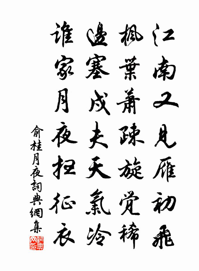 詩詞名句歷史字典書法欣賞書法字典國語詞典說文解字康熙字典古漢語字典標 題 作 者 詩 句 月夜作者:俞桂 朝代:宋代月夜原文江南又見雁初飛,楓葉蕭疎旋覺稀。邊塞戍夫天氣冷,誰家月夜掃征衣。詩詞問答問:月夜的作者是誰?答:俞桂問:月夜寫於哪個朝代?答:宋代俞桂月夜書法欣賞月夜書法作品詩詞推薦思歸天台曹勛〔宋代〕山中小築枕溪流,卻踏紅塵笑拙謀。鬢點吳霜今已才,兒皆楚語只堪愁。猿驚鶴怨事偶爾,燕語鶯啼春罷休。每與【仙呂】桂枝香關漢卿〔元代〕因他別後,懨懨消瘦。粉褪了雨後桃花,頻寬了風前楊柳。這相思怎休?這相思怎休?害得我天長地久,難禁難受贈豫章來子儀言詩曾豐〔宋代〕少年氣宇要自恢,見人賦詩謂為才,出入常將筆裝懷。中年心地要自息,見人喔詩謂為癖,起居常把口掛壁。子儀句魏瓘〔宋代〕誰言嶺外無霜雪,何事秋來亦滿頭。元日訪丁端叔安撫二首陳造〔宋代〕幾夜徒勞夢帝宸,行貲已橐更逡巡。北山只合追逋客,南道於今欠主人。表表德名當世重,堂堂公議有時申。繼今恣逍遙 景金本注云,二首名殢人嬌贈眾道友丘處機〔元代〕昔種良因,今生福地。虛空感、上真加衛。開壇闡化,垂恩普濟。凡一月、於中建成三會。三齋七也至日相呼,臨清平樂·留人不住晏幾道〔宋代〕留人不住,醉解蘭舟去。一棹碧濤春水路,過盡曉鶯啼處。渡頭楊柳青青,枝枝葉葉離情。此後錦書休寄,畫樓雲酬和甫祥源觀醮罷見寄王安石〔宋代〕竊祿祠官久見容,每持金石薦宸衷。鈞天忽忽清都夢,方丈寥寥羽水風。知結勝緣人意外,想尋陳跡馬蹄中。新詩頌一百則釋重顯〔宋代〕對一說,太孤絕,無孔鐵鎚重下楔。閻浮樹下笑呵呵,昨夜驪龍拗角折。別別,韶陽老人得一橛。姑孰官舍許渾〔唐代〕草生宮舍似閒居,雪照南窗滿素書。貧後始知為吏拙,病來還喜識人疏。青雲豈有窺梁燕,濁水應無避釣魚。不待青石阻雨李新〔宋代〕茅屋陰多麥化蛾,西山雲重雨流禾。未聞因也改其樂,解道虞兮奈若何。身與前村孤堠遠,淚隨流水一溪多。文章餞湖州薛司馬宋之問〔唐代〕別駕促嚴程,離筵多故情。交深季作友,義重伯為兄。鎮靜移吳俗,風流在漢京。會看陳仲舉,從此拜公卿。次韻趙道夫待制放魚之作李彌遜〔宋代〕出門忽見腥城市,脫爾寧捐一粒貲。就使烹鮮真可口,誰能結網更臨池。斜風逆浪回頳尾,淺水平沙走素鰭。勿謂頌古二十一首釋正覺〔宋代〕我這鎌子用得快,當時三十文錢買。南泉門下路歧通,寄語行人著精彩。憶帝京(黔州張倅生日)黃庭堅〔宋代〕鳴鳩乳燕春閒暇。化作綠陰槐夏。壽酒舞紅裳,睡鴨飄香麝。醉此洛陽人,佐郡深儒雅。況坐上、玉麟金馬。更莫送赴省諸友方善夫昆仲劉克莊〔宋代〕君家科級每蟬聯,何況高才更妙年,肄業機雲同屋住,論文坡潁對床眠。一雙璧有連城價,九轉丹能拔宅仙。思蜀陸游〔宋代〕譚侯才氣敵文園,日日銀鞍畫戟門。奇句入神聞鬼泣,巨觥如海看鯨吞。一官胄監能令死,萬里銘旌忍更論。湖上送長道客滑道士晁補之〔宋代〕海山兜率事悠悠,底處仍須著力修。莫認箭邊曾有鹿,安知蓑外是無牛。社樗共作支離病,園絮同為汗漫遊。亦見宮詞王珪〔唐代〕盡日間窗財選仙,小娃爭覺倒盆錢。上籌得占蓬萊島,一擲乘鸞出洞天。自平陽館赴郡暢當〔唐代〕晨興平陽館,見月沈江水。溶溶山霧披,肅肅沙鷺起。奉恩謬符竹,伏軾省頑鄙。何當施教化,愧迎小郡吏。寥落名句推薦北風其喈,雨雪霏霏,惠而好我,攜手同。劉向《列女傳·辯通傳·楚處莊侄》 待到重陽日,還來就菊花。孟浩然《過故人莊》 農不出則乏其食,工不出則乏其事,商不出則三寶絕,虞不出則財匱少。司馬遷《史記·七十列傳·貨殖列傳》 春愁凝思結眉心,綠綺懶調紅錦薦。顧敻《玉樓春·拂水雙飛來去燕》 纖雲弄巧,飛星傳恨,銀漢迢迢暗度。秦觀《鵲橋仙·纖雲弄巧》 山路元無雨,空翠濕人衣。王維《山中》 胭脂淚,相留醉,幾時重。李煜《相見歡·林花謝了春紅》 更待菊黃家醞熟,共君一醉一陶然。白居易《與夢得沽酒閒飲且約後期》 高節志凌雲,不敢當滕六。環山樵《薛寶釵·雪竹》 不信樓頭楊柳月,玉人歌舞未曾歸。謝枋得《蠶婦吟》