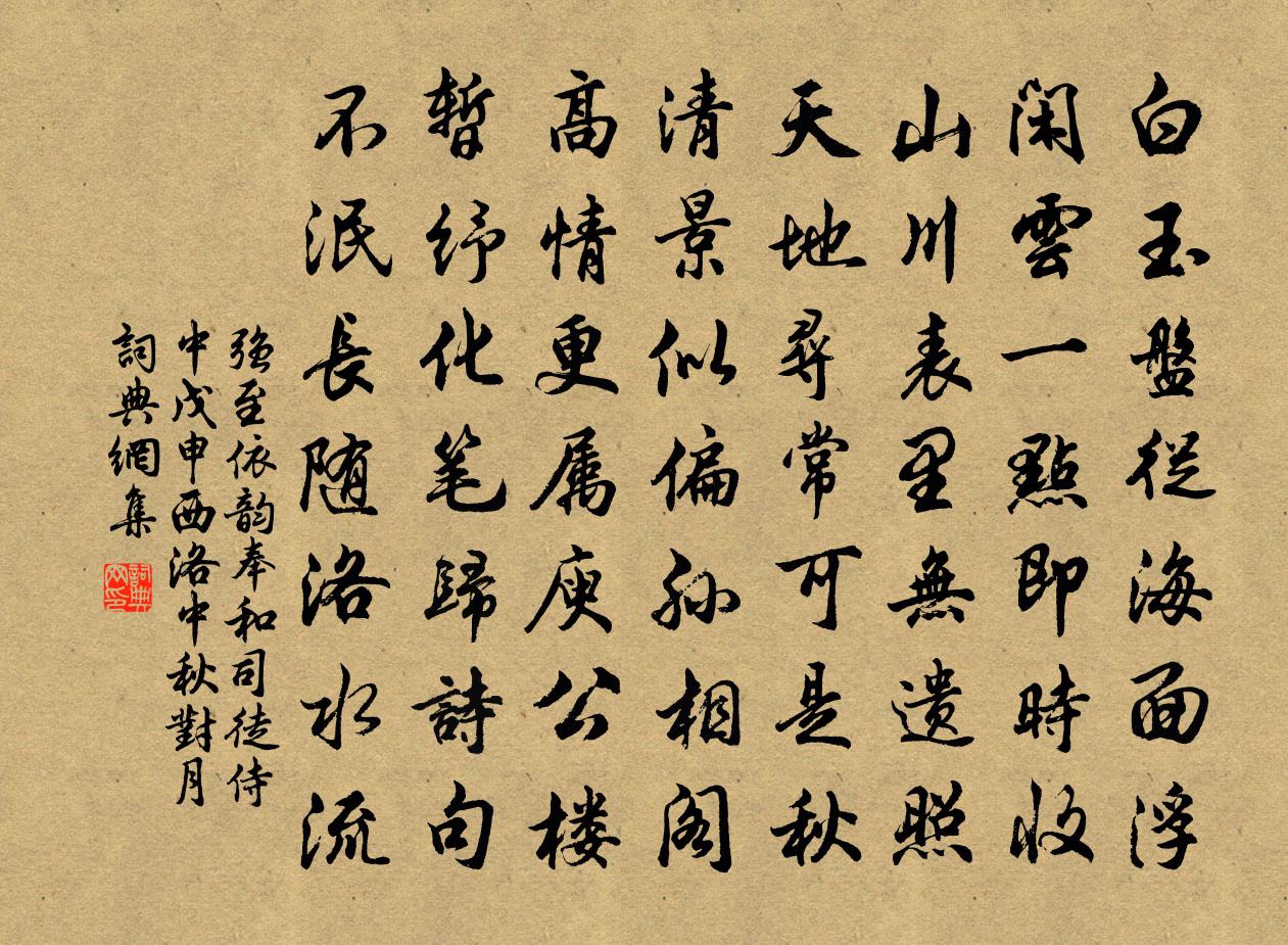 詩詞名句歷史字典書法欣賞書法字典國語詞典說文解字康熙字典古漢語字典標 題 作 者 詩 句 依韻奉和司徒侍中戊申西洛中秋對月作者:強至 朝代:宋代原文白玉盤從海面浮,閒雲一點即時收。山川表里無遺照,天地尋常可是秋。清景似偏孫相閣,高情更屬庾公樓。暫紓化筆歸詩句,不泯長隨洛水流。詩詞問答問:《依韻奉和司徒侍中戊申西洛中秋對月》的作者是誰?答:強至問:該詩寫於哪個朝代?答:宋代書法欣賞依韻奉和司徒侍中戊申西洛中秋對月書法作品詩詞推薦暴雨韋莊〔唐代〕江村入夏多雷雨,曉作狂霖晚又晴。波浪不知深幾許,南湖今與北湖平。禪人並化主寫真求贊釋正覺〔宋代〕清若松篁雪,虛明河漢秋。深心老節歲寒事,穩放胡床默默游。即事十首方岳〔宋代〕得搖牙處盡搖牙,底用鳴聲繞鬢嘩。政自為渠眠不熟,西風吹葉打窗紗。過皖口王安石〔宋代〕皖城西去百重山,陳跡今埋杳靄間。白髮行藏空自感,春風江水照衰顏。溪上野人家釋文珦〔宋代〕隔水兩三家,荊扉帶郭斜。春風喧燕雀,時雨足桑麻。翁媼皆垂白,衣冠不尚華。烏蓬船一隻,出入渡頭沙。噫嘻佚名〔先秦〕噫嘻成王,既昭假爾。率時農夫,播厥百穀。駿發爾私,終三十里。亦服爾耕,十千維耦。簡叔和詩再寄劉克莊〔宋代〕棄置而今成禿翁,君恩量給太倉紅。著鞭縱落諸公後,揮麈猶堪一世雄。花月三千篇絕唱,海天九萬里剛風。胸中和王誠之群圃勝集虞儔〔宋代〕何人浪說四難並,此地追隨眼更清。飛蓋數移紅步幛,肩輿穩度翠圍屏。春回觴詠頻頻舉,風度笙歌處處聽。晝短送福師朱翌〔宋代〕春到春城和雅歌,又攜春去度雲蘿。過余竹里煎茶久,看子花邊簇馬多。千里福星臨福地,一時天使挽天河。江紅和趙仲白陳宓〔宋代〕不踏人間桃李場,要看梅花帶嚴霜。敷成妙賦飄飄意,吐出新詩字字香。爽致青山期取友,高情春晝與俱長。蘇黃早歲趙蕃〔宋代〕早歲耽詩老不工,但余多難似詩窮。忽來數紙丁寧甚,恍憶他時繾綣同。幕府十年公勿厭,風霜滿面我思東。幾因鳴禽陸游〔宋代〕小徑霜泥結凍時,幽人十日廢筇枝。新晴池館春來早,簾外鳴禽聖得知。鳳棲梧(王克恭生日)王庭珪〔宋代〕瓊海無邊銀浪卷。畫戟朱樓,縹緲雲間見。當日使君曾擁傳。海霞光里時開宴。翠斝紅鱗吹酒面。莫謂今朝,人在景德祭社稷三首佚名〔宋代〕百彀蕃滋,麗乎下土。聿崇明祀,垂之千古。育物惟茂,粒民斯普。報本攸宜,國章鹹睹。送王仲言倅泰州絕句陸游〔宋代〕汝陰太史萬簽藏,酸棗先生六世芳。豹尾屬車留不住,卻尋陳跡海陵倉。三日侍華光殿曲水宴代人應詔詩 十謝朓〔南北朝〕天地既成。泉流既清。薄暮沾幸。屬奉文明。將標齊配。刻掃秦京。願馳龍漠。飲馬懸旌。和杜柳溪韻黃庚〔宋代〕白髮垂垂一老夫,年來漸覺世情疏。石床夢冷和雲臥,茅屋燈殘共明居。客至何妨賒魯酒,家貧涉及典唐書。羨君演雅十章張至龍〔宋代〕猩猩隕機穽,鸚鵡鏁金籠。言笑適為累,緘嘿斯保躬。和強君瓦亭蘇轍〔宋代〕君為魏博三年客,日有江湖萬里心。暫得野亭留馬足,強循疏柳步堤陰。無人攜手共吳語,得意搖頭時越吟。何日紹興朝會十三首佚名〔宋代〕用武不虞,誰能去兵。師出以律,動必有名。折彼遐術,布昭聖武。和眾安民,時惟多助。名句推薦行人夜宿金陵渚,試聽沙邊有雁聲。李頎《送劉昱》 夜雨做成秋,恰上心頭。納蘭性德《浪淘沙·夜雨做成秋》 何當載酒來,共醉重陽節。孟浩然《秋登蘭山寄張五》 坑灰未冷山東亂,劉項原來不讀書。章碣《焚書坑》 辛苦遭逢起一經,干戈寥落四周星。文天祥《過零丁洋》 離歌且莫翻新闋。一曲能教腸寸結。歐陽修《玉樓春·尊前擬把歸期說》 年年躍馬長安市。客舍似家家似寄。劉克莊《玉樓春·戲林推》 埏埴以為器,當其無,有器之用。鑿戶牖以為室,當其無,有室之用。故有之以為利,無之以為用。老子《老子·道經·第十一章》 獸爐沉水煙,翠沼殘花片。一行寫入相思傳。張可久《塞鴻秋·春情》 一年三百六十日,多是橫戈馬上行。戚繼光《馬上作》