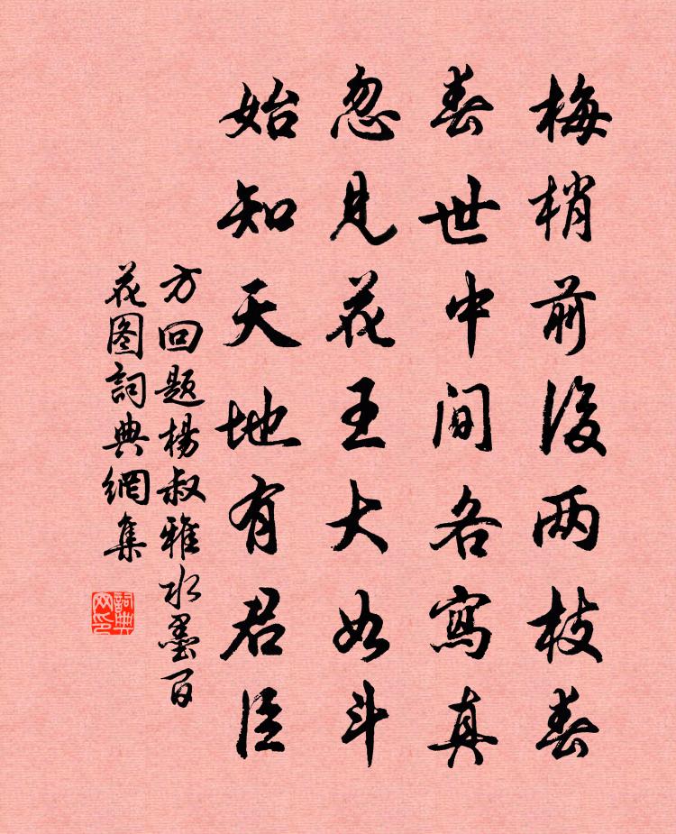 詩詞名句歷史字典書法欣賞書法字典國語詞典說文解字康熙字典古漢語字典標 題 作 者 詩 句 題楊叔雅水墨百花圖作者:方回 朝代:宋代題楊叔雅水墨百花圖原文梅梢前後兩枝春,春世中間各寫真。忽見花王大如斗,始知天地有君臣。詩詞問答問:題楊叔雅水墨百花圖的作者是誰?答:方回問:題楊叔雅水墨百花圖寫於哪個朝代?答:宋代方回題楊叔雅水墨百花圖書法欣賞題楊叔雅水墨百花圖書法作品詩詞推薦賦房玄齡李世民〔唐代〕太液仙舟迥,西園隱上才。未曉徵車度,雞鳴關早開。淳熙八年端午帖子詞太上皇帝合六首崔敦詩〔宋代〕竹殿陰陰間綠槐,日長棋罷看流杯。北窗風味沈沈靜,南內時新節節來。崧高詩為九江趙使君壽楊冠卿〔宋代〕我來自東,小大稽首。是用作歌,以介眉壽。秋雨初晴有感陸游〔宋代〕炎曦赫赫尚餘威,冷雨蕭蕭故解圍。號野百蟲如自訴,辭柯萬葉竟安歸?芼羹菰菜珍無價,上釣魴魚健欲飛。散吏泛鏡湖□□王貞白〔唐代〕我泛鏡湖日,未生千里蓴。時無賀賓客,誰識謫仙人。吟對四時雪,憶游三島春。惡聞亡越事,洗耳大江濱。過淮河宿闞石有感文天祥〔宋代〕北征垂半年,依依只南土。今晨渡淮河,始覺非故宇。江鄉已無家,三年一羈旅。龍翔在何方,乃我妻子所。昔也由之流溪回亭午苦熱小憩牧馬寺喻良能〔宋代〕長途畏日欲流金,聊向招提覓快襟。翠合苔痕人寂寂,涼生柏影院深深。苦無俗物敗佳思,況有寒泉醒客心。一餉六友詩寄林景雲留壽國林道初俞季淵清友劉黻〔宋代〕清友天賦完,歲晚樹獨暖。粲此白玉英,瑟彼清廟瓚。香自根中來,冰雪匪壓斷。一見一回老,殷勤呼茗碗。送鄭寂上人南行許渾〔唐代〕儒家有釋子,年少學支公。心出是非外,跡辭榮辱中。錫寒秦嶺月,杯急楚江風。離怨故園裡,小秋梨葉紅。延平粹廳十詠飛霞陳宓〔宋代〕小閣本非寬,宇宙在其內。心與太初鄰,不假飛霞佩。古詩十九首·驅車上東門佚名〔兩漢〕驅車上東門,遙望郭北墓。白楊何蕭蕭,松柏夾廣路。下有陳死人,杳杳即長暮。潛寐黃泉下,千載永不寤。浩浩和新市雜詠趙希逢〔宋代〕新詩曾寄紫雲娘,異日相逢尚未忘。料想匆匆恨離別,愁腸萬縷系垂楊。酬錢汝州許渾〔唐代〕白雪多隨漢水流,謾勞旌旆晚悠悠。笙歌暗寫終年恨,台榭潛消盡日憂。鳥散落花人自醉,馬嘶芳草客先愁。怪來贈李輔聖黃庭堅〔宋代〕交蓋相逢水急流,八年今復會荊州。已回青眼追鴻翼,肯使黃塵沒馬頭。舊管新收幾妝鏡,流行坎止一虛舟。相看元夕周端臣〔宋代〕小院春寒月到遲,閉門閒課上元詩。南來父老消磨盡,耳畔無人說舊時。江村遇九日戴表元〔宋代〕去年九月江城角,尚得臨風把一杯。今歲並無 * 看,誰家更遣白衣來。身猶是雁飛難泊,時不如潮去解回。還有題廣福寺軒陳睍〔宋代〕小軒架寒溜,激激鳴水蒼。老僧不靳惜,借與一榻涼。枕流暫憩息,清飈襲衣裳。蟬聲亦多思,牽引晝夢長。俗慮寄同年懷安曹守二首袁說友〔宋代〕慈恩猶記北山游,四十年間幾別愁。歲晚天涯重握手,兩翁齊白九分頭。霜夜望月楊萬里〔宋代〕人靜蛩喧天欲霜,不眠獨自步風廊。閒看月走仍雲走,知是雲忙復月忙。春懷十首汪莘〔宋代〕大皞涵帝德,勾芒播皇仁。群龍服蒼駕,靈雨冒南岑。淵魚自暖躍,谷鳥相和吟。桃花既夾道,麥苗亦成林。竹籬名句推薦日長睡起無情思,閒看兒童捉柳花。楊萬里《閒居初夏午睡起》 予獨愛蓮之出淤泥而不染,濯清漣而不妖周敦頤《愛蓮說》 地下千年骨,誰為輔佐臣。戎昱《詠史 / 和蕃》 只有天在上,更無山與齊寇準《詠華山》 日暮長江里,相邀歸渡頭。儲光羲《江南曲四首》 牧童歸去橫牛背,短笛無腔信口吹。雷震《村晚》 聽其言也,觀其眸子,人焉廋哉?孟子《孟子·離婁章句上·第十五節》 遊人不管春將老,來往亭前踏落花。歐陽修《豐樂亭遊春·其三》 樓頭小婦鳴箏坐,遙見飛塵入建章。王昌齡《青樓曲二首》 憂勞可以興國,逸豫可以亡身歐陽修《伶官傳序》