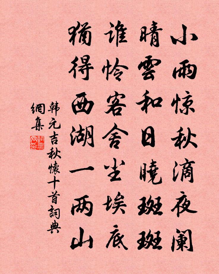 詩詞名句歷史字典書法欣賞書法字典國語詞典說文解字康熙字典古漢語字典標 題 作 者 詩 句 秋懷十首作者:韓元吉 朝代:宋代秋懷十首原文小雨驚秋滴夜闌,晴雲和日曉斑斑。誰憐客舍塵埃底,猶得西湖一兩山。詩詞問答問:秋懷十首的作者是誰?答:韓元吉問:秋懷十首寫於哪個朝代?答:宋代問:韓元吉的名句有哪些?答:韓元吉名句大全韓元吉秋懷十首書法欣賞秋懷十首書法作品詩詞推薦上平西(惜春)程垓〔宋代〕愛春歸,憂春去,為春忙。旋點檢、雨障雲妨。遮紅護綠,翠帷羅幕任高張。海棠明月杏花天,更惜濃芳。喚鶯吟水龍吟(題瓢泉)辛棄疾〔宋代〕稼軒何必長貧,放泉檐外瓊珠瀉。樂天知命,古來誰會,行藏用舍。人不堪憂,一瓢自樂,賢哉回也。料當年曾問送孫逸歸廬山(得帆字)劉長卿〔唐代〕爐峰絕頂楚雲銜,楚客東歸棲此岩。彭蠡湖邊香橘柚,潯陽郭外暗楓杉。青山不斷三湘道,飛鳥空隨萬里帆。常愛古歌贈岩主喜公陶羽〔宋代〕喜公心眼如有靈,善擇此岩來構扃。崖根踏碎暮煙碧,洞門鑿破蒼苔青。交加亂石虎狼墜,縱橫怪木龍蛟形。其間朝日載升蘇洵〔宋代〕朝日載升,薨薨伊氓。於室有績,於野有耕。於途有商,於邊有徵。天生斯民,相養以寧。嗟我何為?踽踽無營。崇勝寺夏竦〔宋代〕山當廬阜五峰邊,地占侯谿好習禪。杳藹峰巒雲蔽日,參差樓殿瓦生煙。僧房宿鳥栖簾外,客館鳴泉過枕前。但可題黃花驛薛逢〔唐代〕孤戍迢迢蜀路長,鳥鳴山館客思鄉。更看絕頂煙霞外,數樹岩花照夕陽。贈崔十三評事公輔杜甫〔唐代〕飄飄西極馬,來自渥窪池。颯飁定山桂,低徊風雨枝。我聞龍正直,道屈爾何為。且有元戎命,悲歌識者誰。官聯荷葉杯·知己一人誰是納蘭性德〔清代〕知己一人誰是?已矣。贏得誤他生。有情終古似無情,別語悔分明。莫道芳時易度,朝暮。珍重好花天。為伊指點楊柳詞四解宋祁〔宋代〕玉樹森森拂曉空,子云辛苦賦青蔥。不知苒弱當君意,卻就長楊便作宮。相和歌辭。襄陽曲施肩吾〔唐代〕大堤女兒郎莫尋,三三五五結同心。清晨對鏡冶容色,意欲取郎千萬金。重遊寄老庵懷僧芝賀鑄〔宋代〕淡游已恨失芝公,陳躅空留夢境中。欲問孤云何處去,庭前雙樹自西風。鵝湖山范端臣〔宋代〕繚垣千尺秀峰環,台殿參差杳靄間。更借西湖一千頃,為君題作小孤山。元宵雨戴復古〔宋代〕窮人不謀歡,元夜如常時。晴雨均寂寞,蚤與一睡期。朱門粲燈火,歌舞臨酒池。酒闌歡不足,九街恣游嬉。前呵送杜少柳起萃知遂寧府以高名千古重如山為韻韓元吉〔宋代〕厚味得無毒,良藥信多苦。毒留患滋生,苦過疾息愈。吾君堯舜資,事業方復古。公行幸遲遲,去國猶去魯。壽周益公李商叟〔宋代〕百年能幾見英豪,主聖臣賢未易遭。□□□□新制度,宗臣當國大勳勞。三師告老恩榮備,□□藏書日月高。猶有句張嵲〔宋代〕白水汪汪滿稻畦,樟花零落遍前溪。春日吳浚〔宋代〕畫堂簾箔碧籠蔥,午夢模糊燕語中。微雨嫩晴天似醉,鬧紅吹上海棠風。秋至葉茵〔宋代〕節序暗推移,清商漸戒期。旅懷{上艹中大下蟲}早計,涼信柳先知。萬事到雙鬢,餘生消幾詩。最憐樑上燕,巢過梅里七首家於無錫四十載今敝廬數堵…於後。上家山李紳〔唐代〕上家山,家山依舊好。昔去松桂長,今來容須老。上家山,臨古道。高低入雲樹,蕪沒連天草。草色綠萋萋,寒蛩名句推薦夜雪初霽,薺麥彌望。姜夔《揚州慢·淮左名都》 汴水流,泗水流,流到瓜州古渡頭。吳山點點愁白居易《長相思·汴水流》 得成比目何辭死,願作鴛鴦不羨仙。盧照鄰《長安古意》 行人刁鬥風沙暗,公主琵琶幽怨多。李頎《古從軍行》 佳人亦何念,淒斷陽關曲。蘇軾《送頓起》 非學無以廣才,非志無以成學。諸葛亮《誡子書》 唯見鴻雁飛,令人傷懷抱。高適《登百丈峰二首》 自春來、慘綠愁紅,芳心是事可可。柳永《定風波·自春來》 夫輕諾必寡信,多易必多難。老子《老子·德經·第六十三章》 願得一心人,白頭不相離。卓文君《白頭吟》