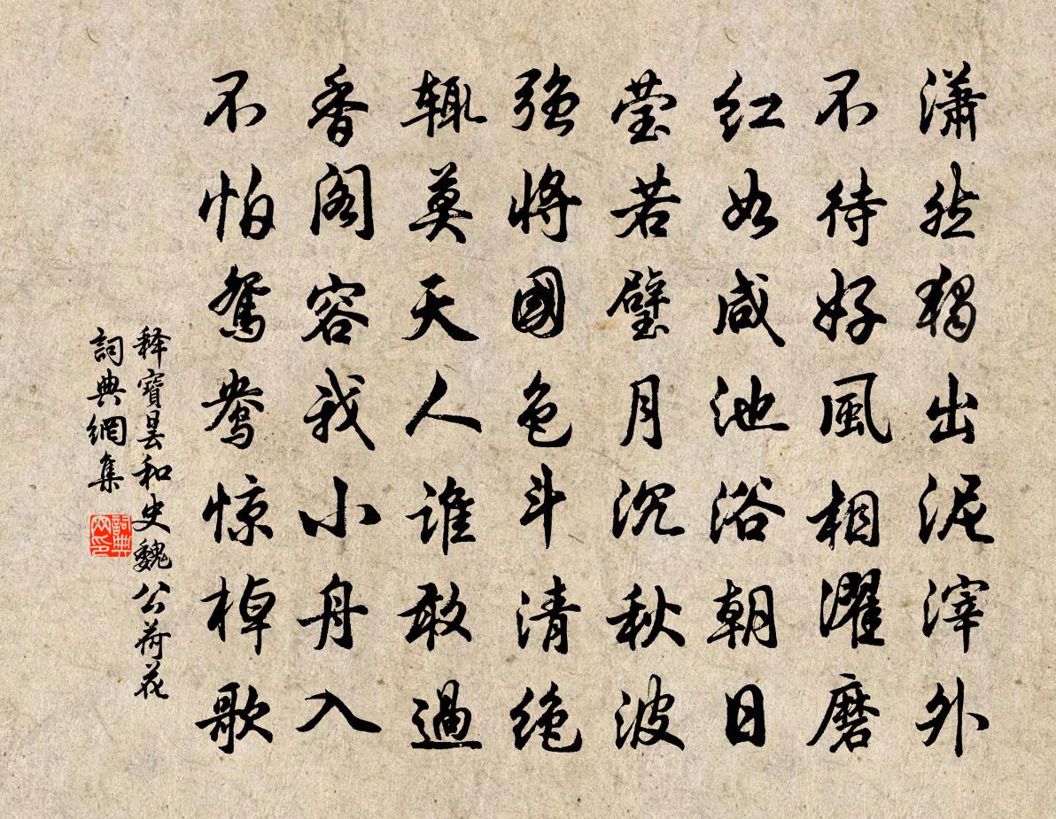 詩詞名句歷史字典書法欣賞書法字典國語詞典說文解字康熙字典古漢語字典標 題 作 者 詩 句 和史魏公荷花作者:釋寶曇 朝代:宋代和史魏公荷花原文瀟然獨出泥滓外,不待好風相濯磨。紅如鹹池浴朝日,瑩若璧月沉秋波。強將國色斗清絕,輒莫天人誰敢過。香閣容我小舟入,不怕鴛鴦驚棹歌。詩詞問答問:和史魏公荷花的作者是誰?答:釋寶曇問:和史魏公荷花寫於哪個朝代?答:宋代釋寶曇和史魏公荷花書法欣賞和史魏公荷花書法作品詩詞推薦讀韓非傳張鎡〔宋代〕諫鼓招言事蔑聞,昧時自鬻更紛紛。胸中著許堤防策,不救危身肯濟君。雒陽陳去非自符寶郎謫陳留酒官予時作丞澶淵張元乾〔宋代〕寒水繞近郭,棲鴉蔽高原。映帶幽人居,暝色起草根。衡門東南開,濁河日夜奔。所喜古堤月,初出煙江村。不入去郡三思方岳〔宋代〕我思種明逸,與帝自賓友。歸眠青山雲,未醒紫宸酒。誰何敢譏彈,乃有此健守。天心本無私,以一調眾口。徙之句釋惠崇〔宋代〕扇聲猶泛暑,井氣忽生秋。贈畫師郭叔詹李呂〔宋代〕蚤覺儒冠多誤身,聊工傳寫養偏親。丹青遊戲臻能事,造休生成羨逼真。筆下豈皆行路輩,眼中誰是築岩人。會當從軍行三首李約〔唐代〕看圖閒教陣,畫地靜論邊。烏壘天西戍,鷹姿塞上川。路長須算日,書遠每題年。無復生還望,翻思未別前。柵高雜詠一百首巷伯劉克莊〔宋代〕哆侈何其甚,憂傷只自知。雖經夫子筆,不廢寺人詩。玉樓春王采〔宋代〕繡屏曉夢鴛鴦侶。可惜夜來歡聚取。幾聲低語記曾聞,一段新愁看乍覷。繁紅洗盡胭脂雨。春被楊花勾引去。多情早春十絕呈石湖陳造〔宋代〕未須看竹扣人門,且復尋梅過水村。香片點衣歸馬健,臨風只博斷吟魂。又賦如山姜特立〔宋代〕如山堂上好登臨,羅列堂前紫翠岑。萬古煙霞供坐嘯,四時風月伴閒吟。海鷗心性滄洲遠,野鹿精神草樹深。卻笑貞方翥〔宋代〕牛背穩如千斛舟,斜煙細雨任遨遊。春風草綠江南岸,不因人喚始回頭。輸棋方岳〔宋代〕半崦山雲舊草堂,鳥啼花落幾平章。酒無賢聖同歸醉,風有雌雄各自涼。賴與鷗盟同保社,吵隨蟻垤夢侯王。未償贈竹卿釋行海〔宋代〕一擊虛空成粉碎,渭川千畝亦徒勞。不沾一點湘妃淚,自是無心節更高。和答還卷張舜民〔宋代〕屈宋功成道不傳,後來雞犬各登仙。留連光景隨時俗,盜竊聲名至暮年。陷沒李陵因北伐,漂流杜甫為南遷。耒陽呈胡伯圓尚書釋紹嵩〔宋代〕自挽狂瀾制百川,致君何日不堯年。由來八座尚書貴,盛事駸駸海內傳。酬謝侍御喜王宇及第見賀不遇之作嚴維〔唐代〕寂寞柴門掩,經過柱史榮。老夫寧有力,半子自成名。柳映三橋發,花連上道明。緘書到別墅,郢曲果先成。偈頌一百二十三首釋祖欽〔宋代〕叢林雖未整肅,更點卻要分明。粒米須還粒飯,八兩定要半斤。春日途中五首項安世〔宋代〕未說離家日日晴,離家三日雨如傾。津頭小吏詢名氏,但道當年段墨卿。和東海題雲松嶺書堂陳宓〔宋代〕百尺長松帶碧蘿,杜溪深鎖蔣洋坡。一堂來作群山主,四牖分盛好景多。書卷不須扃戶讀,詩翁頻許杖藜過。一生初九夜月二首楊萬里〔宋代〕也知月姊是天妹,天上人間絕世無。霧刷雲撩何不可,卻須插一水精梳。名句推薦春風不解禁楊花,蒙蒙亂撲行人面。晏殊《踏莎行·小徑紅稀》 殘星幾點雁橫塞,長笛一聲人倚樓。趙嘏《長安晚秋 / 秋望 / 秋夕》 繡幃人念遠,暗垂珠淚,泣送征輪。韓縝《鳳簫吟·鎖離愁》 白馬金鞍從武皇,旌旗十萬宿長楊。王昌齡《青樓曲二首》 萬里橋邊多酒家,遊人愛向誰家宿。張籍《成都曲》 今宵絕勝無人共,臥看星河盡意明。陳與義《雨晴·天缺西南江面清》 花谷依然,秀靨偷春小桃李。吳文英《荔枝香近·送人游南徐》 春雨斷橋人不度,小舟撐出柳陰來。徐俯《春遊湖》 笑殺陶淵明,不飲杯中酒。李白《嘲王歷陽不肯飲酒》 冉冉秋光留不住,滿階紅葉暮。李煜《謝新恩·冉冉秋光留不住》