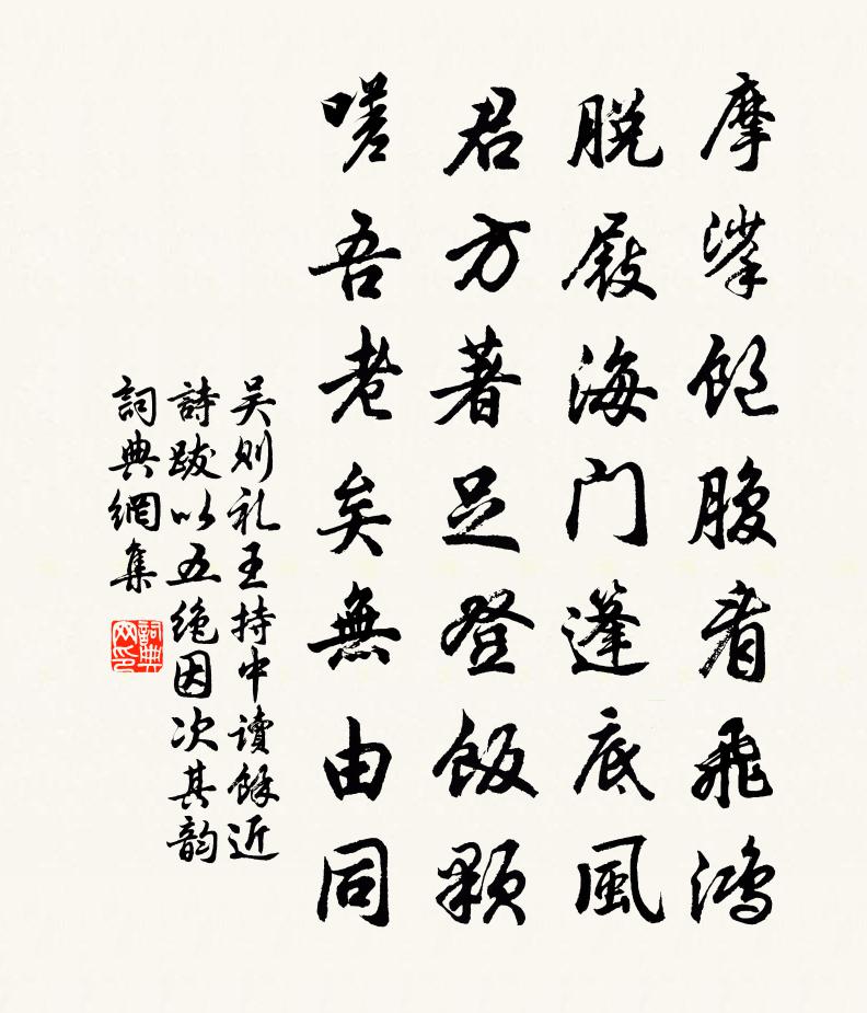 詩詞名句歷史字典書法欣賞書法字典國語詞典說文解字康熙字典古漢語字典標 題 作 者 詩 句 王持中讀余近詩跋以五絕因次其韻作者:吳則禮 朝代:宋代原文摩挲飽腹看飛鴻,脫屐海門篷底風。君方著足登飯顆,嗟吾老矣無由同。詩詞問答問:《王持中讀余近詩跋以五絕因次其韻》的作者是誰?答:吳則禮問:該詩寫於哪個朝代?答:宋代書法欣賞王持中讀余近詩跋以五絕因次其韻書法作品詩詞推薦燕岩游罷與岩主話別白玉蟾〔宋代〕西風吹作此岩游,滿目松筠翠欲流。玉燕不飛明月夜,石種一振曉霜秋。惜乎分水便南北,忽爾回頭欲去留。且去代壽某帥二首陳宗遠〔宋代〕三年姬袞尚居東,官府清平冠六雄。仙洞蟠桃紅映日,山亭修竹綠梳風。已將儒雅安時俗,更即人和驗歲豐。儉幕二翁登泰山佚名〔〕昔有二翁,同邑(里)而居。甲翁之妻子去鄉,唯叟一人而已。一日,叟攜酒至乙翁第,二人對酌,不亦樂乎!乙縱步至董氏園亭三首陳與義〔宋代〕池光修竹里,筇杖季春頭。客子愁無奈,桃花笑不休。百年今日勝,萬里此生浮。莽莽樽前事,題詩記獨游。賀鄭使君貫休〔唐代〕三衢蜂蠆陷城池,八詠龍韜整武貔。才諭危亡書半幅,便思父母淚雙垂。戈收甲束投仁境,汗浹魂飄拜虎旗。死地塞上雪中楊冠卿〔宋代〕雪色迷江國,人誰入蔡城。窗虛元自白,梅破不勝清。佳客苦難喚,清尊只細傾。吾衰便靜退,不忍浪談兵。老猿舒岳祥〔宋代〕一笑已霜千丈發,三聲應斷九迴腸。巴陵月暝林巒慘,巫峽江空道路長。招圖機吃槐葉冷淘有狐泉之句輒復為謝晁說之〔宋代〕野狐泉畔昔人集,朱亥墓南今日豪。慚愧曾槐誰細摘,蹔拋湯餅屬吾曹。夏旱三首岳珂〔宋代〕問津六輔到長安,滿目疲羸不忍觀。耕耨又孤今歲飽,蓋藏尤比去年難。綺羅有目須令見,鐵石為心方自寬。欲借送周彥敷通判之官臨川楊萬里〔宋代〕益國今姬旦,治中小呂申。留家視蘭膳,疋馬見州民。慈訓二六句,寒窗三十春。校書天祿閣,才子即雲津。露青竹杖歌顧況〔唐代〕鮮于仲通正當年,章仇兼瓊在蜀川。約束蜀兒采馬鞭,蜀兒采鞭不敢眠。橫截斜飛飛鳥邊,繩橋夜上層崖顛。頭插次韻程以忠同飲方回〔宋代〕飲濕自嫌無聖酒,摘鮮猶幸有真茶。艱危昔偶分侯竹,老病今還齕庶瓜。已約社鷗盟水石,尚驚征馬困風沙。醉人自題月軒釋德聰〔宋代〕軒前轆轤轉冰盤,軒里詩成徹骨寒。多少人來看明月,誰知倒被月明看。雜曲歌辭。出門行元稹〔唐代〕兄弟同出門,同行不同志。淒淒分岐路,各各營所為。兄上荊山巔,翻石辨虹氣。弟沉滄海底,偷珠待龍睡。出門偈頌七十六首釋師範〔宋代〕雲收霧斂,地辟天開。處處彌勒,門門善財。安得真男子,同上黃金台。墳庵枕上追愴賦此張栻〔宋代〕秋氣惻惻侵戶牖,霜林風過猶餘音。八年淚濕龍塘土,展轉不眠中夜心。荊州即事藥名詩八首黃庭堅〔宋代〕四海無遠志,一溪甘遂心。牽牛避洗耳,臥著桂枝陰。隨緣吟邵雍〔宋代〕得路青霄正好沖,休貪糧稻戀深籠。要無為後須還朴,好自由時莫厭窮。百計用心終上錯,一場大夢到頭空。生涯雨後病起二首陳造〔宋代〕旱歲仍無麥,淮民食正艱。幾時占雨信,今日破天慳。盡息田家嘆,聊開病客顏。何由長歲稔,金火莫循環。過太乙觀賈生房王維〔唐代〕昔余棲遁日。之子煙霞鄰。共攜松葉酒。俱簪竹皮巾。攀林遍岩洞。採藥無冬春。謬以道門子。征為驂御臣。常恐名句推薦木落山空天遠大,送飛鴻、北去傷懷久。戴復古《賀新郎·寄豐真州》 願得一心人,白頭不相離。卓文君《白頭吟》 得天下英才而教育之,三樂也!孟子《孟子·盡心章句上·第二十節》 春雲吹散湘簾雨,絮黏蝴蝶飛還住。納蘭性德《菩薩蠻·春雲吹散湘簾雨》 織婦何太忙,蠶經三臥行欲老。元稹《織婦詞》 黃雲連白草,萬里有無間。王鎡《塞上曲》 佳人彩雲里,欲贈隔遠天。李白《折荷有贈》 只有一枝梧葉,不知多少秋聲。張炎《清平樂·候蛩淒斷》 寧做太平犬,莫做離亂人!佚名《增廣賢文·下集》 藍橋春雪君歸日,秦嶺秋風我去時。白居易《藍橋驛見元九詩》
