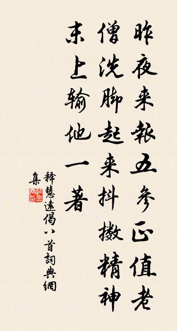 詩詞名句歷史字典書法欣賞書法字典國語詞典說文解字康熙字典古漢語字典標 題 作 者 詩 句 偈八首作者:釋慧遠 朝代:宋代偈八首原文昨夜來報五參,正值老僧洗腳,起來抖擻精神,末上輸他一著。詩詞問答問:偈八首的作者是誰?答:釋慧遠問:偈八首寫於哪個朝代?答:宋代釋慧遠偈八首書法欣賞偈八首書法作品詩詞推薦道林寺送莫侍御(一作麓州精舍送莫侍御歸寧)張謂〔唐代〕何處堪留客,香林隔翠微。薜蘿通驛騎,山竹掛朝衣。霜引台烏集,風驚塔雁飛。飲茶勝飲酒,聊以送將歸。楊待制輓詞韓元吉〔宋代〕妙齡著足道家山,壯歲升華玉筍班,千里麾符才假手,幾年香火竟投閒。詩書坐命名家聲大,簪紱誰令壽歷慳。太鴛鴦盧汝弼〔唐代〕雙浮雙浴傍苔磯,蓼浦蘭皋繡帳幃。長羨鷺鷥能潔白,不隨鸂鶒斗毛衣。霞侵綠渚香衾暖,樓倚青雲殿瓦飛。應笑雪中雪坡十憶姚勉〔宋代〕近水新栽一巷梅,而今雪裡想齊開。只愁夜後花幽獨,誰與攜筇踏月來。句王隨〔宋代〕桑斧刊春色,漁歌唱夕陽。乳燕飛周密〔宋代〕山、碧浪湖者,皆橫陳於前,特吾幾席中一物耳。遙望具區,渺如煙雲;洞庭、縹緲諸峰,矗矗獻狀,蓋王右丞、贈無咎張耒〔宋代〕快哉亭下水連城,落日斷霜相映明。人在捲簾尊俎里,詩從揮麈笑談生。揚州何遜風流在,江夏黃香句法清。□□華嚴真師以詩見貺聊成二章紀其趣尚司馬光〔宋代〕素髮青眸七十餘,未嘗遊學只安居。旁無几杖身輕健,應為心閒得自如。送怡齊周居士兼簡湯東澗釋普度〔宋代〕我羨怡齊去又來,澗邊無一點塵埃。高風凜凜照今古,有口不談聲似雷。螢葉茵〔宋代〕自明自滅度方池,熠熠飛來去覺遲。入坐點衣情分熟,納交元在讀書時。歸來曲侯善淵〔元代〕真常道,日用遍三千。大則包羅天地外,小周沙芥亦如然。物物盡通玄。威神力,混里任循環。撞破虛空七八片,秋思李白〔唐代〕燕支黃葉落,妾望自登台。海上碧雲斷,單于秋色來。胡兵沙塞合,漢使玉關回。征客無歸日,空悲蕙草摧。和襲美褚家林亭陸龜蒙〔唐代〕一陣西風起浪花,繞欄桿下散瑤華。高窗曲檻仙侯府,臥葦荒芹白鳥家。孤島待寒凝片月,遠山終日送餘霞。若知題仙居偉羌山六絕陳襄〔宋代〕四友之賢世莫如,白頭須作一鄉居。此山不惜將錢買,嘆息無人共結廬。菊坡朱應龍〔宋代〕口有綺語債,長詠菊坡詩。最好重陽景,母雞肥熟時。夏日對雨偶成寄韓仲文兄弟梅堯臣〔宋代〕日日城頭雨,還愁湖上波。窗中人自聽,門外潦應多。不畏車生耳,還愁麥化蛾。吾廬無所有,頻看壁間梭。送虞司理赴官辰州二首項安世〔宋代〕窈窈辰溪路,秦人此避秦。子孫為洞戶,世系本王民。問淑桑鴞變,言忠黍貊親。此心能勿舍,何地不歸仁。雁南飛戴表元〔宋代〕雁南飛,飛且鳴。我不愛爾絕漢排雲之健翼,愛爾秋來意氣各有適,江湖萬里同風聲,風聲萬里秋蕭索,山鄉田荒頌古三十八首釋從瑾〔宋代〕自有覓不得,無端面發紅。翻身吃一{左足右顛},兩手摸虛空。雪窗張孝伯〔宋代〕先生原是山中客,僅能揚雄一區宅。窮冬十日不出門,群玉峰前看三白。誰將名字落人間,丹陛入對天開顏。江城名句推薦山致其高而雲雨起焉,水致其深而蛟龍生焉,君子致其道而德澤流焉。文子《文子·卷六·上德》 長驅入,歌台舞榭,風卷落花愁徐君寶妻《滿庭芳·漢上繁華》 古戍三秋雁,高台萬木風。屈大均《魯連台》 正是霜風飄斷處,寒鷗驚起一雙雙。陸龜蒙《冬柳》 湖水無端浸白雲,故人書斷孤鴻沒。黃庭堅《秋懷二首》 君子恥不修,不恥見污。荀子《荀子·非十二子》 雄州霧列,俊采星馳。王勃《滕王閣序》 乘興南遊不戒嚴,九重誰省諫書函。李商隱《隋宮》 至道深微,惟人是弘李大師、李延壽《南史·本紀·卷四》 別浦今朝暗,羅帷午夜愁李賀《七夕》