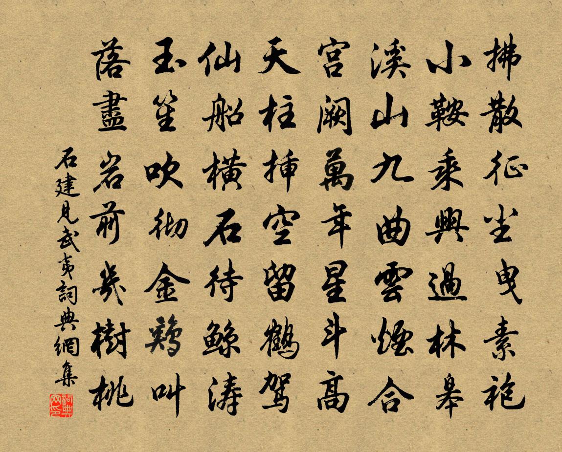 詩詞名句歷史字典書法欣賞書法字典國語詞典說文解字康熙字典古漢語字典標 題 作 者 詩 句 武夷作者:石建見 朝代:宋代武夷原文拂散征塵曳素袍,小鞍乘興過林皋。溪山九曲雲煙合,宮闕萬年星斗高。天柱插空留鶴駕,仙船橫石待鯨濤。玉笙吹徹金雞叫,落盡岩前幾樹桃。詩詞問答問:武夷的作者是誰?答:石建見問:武夷寫於哪個朝代?答:宋代石建見武夷書法欣賞武夷書法作品詩詞推薦頌古十七首釋宗演〔宋代〕山前田地賣還買,松竹清風痛自憐。堪笑夢中夸富貴,覺來那直半分錢。三禽言方岳〔宋代〕呂望非熊亦非龍,後車載歸作三公。龐眉皓髮八十翁,幾何日月土一叢。盍不徑老磻溪風,以文見醫方自功。西山贊水月觀音釋法薰〔宋代〕現自在端嚴相,起利他悲憫心。水茫茫,月沉沉。眾生無盡,我顧方興。曉起復昏,泯去來今。連州天際嶺陶弼〔宋代〕南來未見此高峰,下際滄溟上際空。辛苦限蠻成底事,坐看嵩華作三公。山居雪後二首楊萬里〔宋代〕一點紅塵未敢生,松間雪後政堪行。日光半破風微度,時作高林落果聲。詠懷阮籍〔魏晉〕危冠切浮雲,長劍出天外。細故何足慮,高度跨一世。非子為我御,逍遙遊荒裔。顧謝西王母,吾將從此逝。豈與寄題傅欽之源別業司馬光〔宋代〕縣郭遙相望,修篁百畝余。林間清濟水,門外太行車。道勝隨宜足,身閒與世疏。何時容命駕,采蕨釣肥魚。和洪秀才八首胡寅〔宋代〕聞說頻頻黨,深遵秩秩猷。題評歸月旦,裁鑒比陽秋。賦謝雕蟲手,詩通美盼眸。看君多直諒,端似漢朱游。三學山開照寺薛能〔唐代〕盡室遍相將,中方上下方。夜深楠樹遠,春氣陌林香。聖跡留岩險,靈燈出混茫。何因將慧劍,割愛事空王。郊廟歌辭。祀圜丘樂章。壽和佚名〔唐代〕八音斯奏,三獻畢陳。寶祚惟永,暉光日新。和清臣病後韻陳耆卿〔宋代〕契闊芝眉兩月中,往尋一笑思春融。知君近日能尋樂,款我昨宵多發蒙。快得聯詩到侯喜,何當載酒過揚雄。交情清真香歌丁謂〔宋代〕四兩玄參三兩松,麝香半分蜜和同。丸如彈子金爐爇,還似花心噴曉風。紹興祀神州地祗十六首佚名〔宋代〕[太簇為角]洪惟坤元,道著品物。上配紫旻,厚載其德。良月毛若,祭哭布列。必先皇只,以迓景福。悲歌劉應炎〔宋代〕悲矣乎,杞人憂兮天莫支,權臣秉鈞兮社稷危。外夷相侵民流離,大廈將傾誰設施。悲矣乎,吾將抱徐衍之石兮,謝趙太傅遺聚米圖經黃庶〔宋代〕文武生賢子,羌圖帝所多。始欣知馬援,終嘆失廉頗。蒼鼠巢遺稿,黃埃鎖舊戈。遠人猶偃蹇,掩帙淚滂沱。雜詠一百首張說劉克莊〔宋代〕玉檢匪頒隆,珠簾餽遺通。更揮諛墓筆,褒讚死姚崇。初八日過總持以雨不得觀龍井休日再往經孺子趙蕃〔宋代〕滿城車馬走塵埃,湖上幽蹊長積苔。喟嘆高風尚千載,殷勤兩日為重來。吾生詎老五斗米,此地終期三徑開。大廈暮熱游荷池上五首楊萬里〔宋代〕寒甃千尋汲井花,病身一浴不勝佳。追涼不得渾閒事,燒眼生憎半幅霞。聽新蟬寄張晝方乾〔唐代〕細聲頻斷續,審聽亦難分。仿佛應移處,從容卻不聞。蘭棲朝咽露,樹隱暝吟雲。莫遣鄉愁起,吾懷只是君。秀州僧本瑩靜照堂蘇軾〔宋代〕鳥囚不忘飛,馬系常念馳。靜中不自勝,不若聽所之。君看厭事人,無事乃更悲。貧賤苦形勞,富貴嗟神疲。作堂名句推薦佳人重勸千長壽。柏葉椒花芬翠袖。毛滂《玉樓春·己卯歲元日》 把酒送春春不語。黃昏卻下瀟瀟雨。朱淑真《蝶戀花·送春》 衰柳寒蟬一片愁,誰肯教白衣送酒?盧摯《沉醉東風·重九》 美人如花隔雲端。李白《長相思三首》 雪消門外千山綠,花發江邊二月晴。歐陽修《春日西湖寄謝法曹歌》 利莫長乎簡,福莫久於安。韓非及後人《韓非子·大體》 一葉漁船兩小童,收篙停棹坐船中。楊萬里《舟過安仁》 烏鳥之狡,雖善不親。不重之結,雖固必解管仲《管子·形勢》 芳草句,碧雲辭,低徊閒自思。佟世南《阮郎歸·杏花疏雨灑香堤》 明月,明月,胡笳一聲愁絕。戴叔倫《轉應曲·邊草》