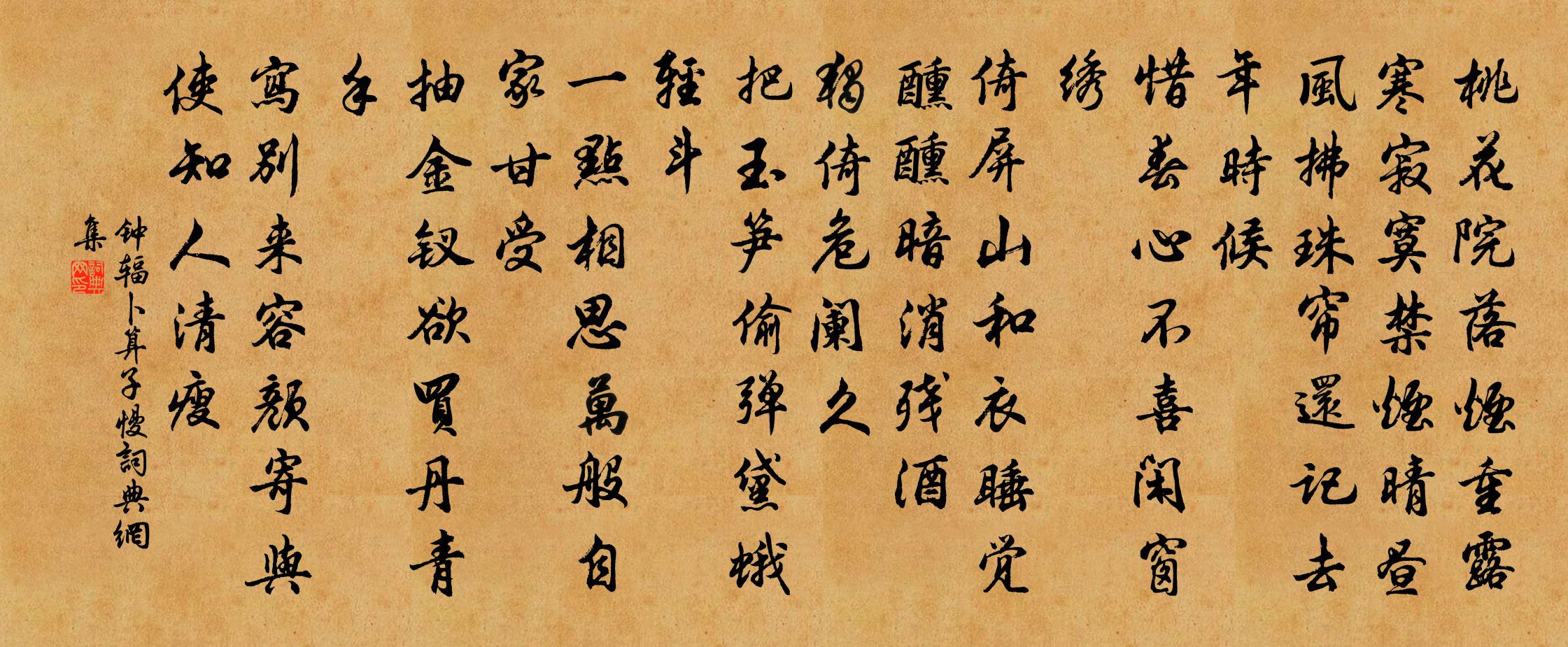 詩詞名句歷史字典書法欣賞書法字典國語詞典說文解字康熙字典古漢語字典標 題 作 者 詩 句 卜運算元慢作者:鍾輻 朝代:唐代卜運算元慢原文桃花院落,煙重露寒,寂寞禁菸晴晝。風拂珠簾,還記去年時候。惜春心,不喜閒窗繡。倚屏山,和衣睡覺。醺醺暗消殘酒。獨倚危闌久。把玉筍偷彈,黛蛾輕斗。一點相思,萬般自家甘受。抽金釵,欲買丹青手。寫別來,容顏寄與,使知人清瘦。詩詞問答問:卜運算元慢的作者是誰?答:鍾輻問:卜運算元慢寫於哪個朝代?答:唐代問:卜運算元慢是什麼體裁?答:詞鍾輻卜運算元慢書法欣賞卜運算元慢書法作品注釋全唐詩:卷891-36詩詞推薦挽肯齋儲居士陳宓〔宋代〕長樂與家鄰,安輿來往頻。詩方貽五字,訃只隔三晨。事業傳賢嗣,鄉閭失善人。薰風丹荔熟,追感一沾巾。江城梅花引(枕屏)丘崈〔宋代〕輕煤一曲染霜紈。小屏山。有無間。宛是西湖,雪後未晴天。水外幾家籬落晚,半開關。有梅花、傲峭寒。漸看。送公濟還闕下強至〔宋代〕不候關征滿歲歸,邑人徒爾挽行衣。肯將淚對殘花落,應自心先去鳥飛。官向長安多富貴,君當即日享輕肥。綠槐蘇學十題玲瓏石朱長文〔唐代〕巨浪洗蒼玉,一峰飛我前。鑿開混沌竅,窺見滄浪天。洞敞延華月,岩虛生翠煙。幽軒相對久,古意日倏然。行田登海口盤嶼山詩謝靈運〔南北朝〕羈苦孰雲慰。觀海藉朝風。莫辨洪波極。誰知大壑東。依稀采菱歌。彷佛含嚬容。遨遊碧沙渚。游衍丹山峯。橙子孔武仲〔宋代〕秋露凝漿細,朝陽入色深。冰虀不須搗,恐碎褭蹄金。福州長溪樂山王居士遣兒惟惺投師薙髮寫師頂釋普濟〔宋代〕瘦骨稜層一擔夫,幾年寥落在江湖。麵皮捩轉無人識,有甚閒名上祖圖。題文丞相吟嘯集李謹思〔宋代〕南人不識兩膝貴,曲折百態卑且勞。斯人護膝不護頭,故以頸血沾君刀。蟠胸孤憤擘不碎,殺氣千丈纏旌旄。援桴鷓鴣天(迎春)劉辰翁〔宋代〕去年太歲田間土,明日香菸壁下塵。馬上新人紅又紫,眼前歌妓送還迎。釵頭燕,勝金紃。燕歌趙舞動南人。遺民送客春遊嶺南二十韻白居易〔唐代〕已訝游何遠,仍嗟別太頻。離容君蹙促,贈語我殷勤。迢遞天南面,蒼茫海北漘。訶陵國分界,交趾郡為鄰。蓊鬱奉和魯望讀陰符經見寄皮日休〔唐代〕三百八十言,出自伊祁氏。上以生神仙,次雲立仁義。玄機一以發,五賊紛然起。結為日月精,融作天地髓。不測贈江處士徐仲雅〔唐代〕門在松陰里,山僧幾度過。藥靈丸不大,棋妙子無多。薄霧籠寒徑,殘風戀綠蘿。金烏兼玉兔,年幾奈公何。臨江仙(周國正生朝)韓淲〔宋代〕寒食清明春事好,公家霽月光風。年時猶記雨聲中。州侯陳樂舞,法從酒杯同。坐上王楊雖自散,酴醿依舊香濃。蕭二十三赴歙州婚期二首盧仝〔唐代〕淮上客情殊冷落,蠻方春早客何如。相思莫道無來使,回雁峰前好寄書。南方山水生時興,教有新詩得寄余。路帶苦熱和袁應祥用韋蘇州喬木生夏涼流雲吐華月郭印〔宋代〕中扃自清涼,穿鑿多門戶。神凝一氣歸,陋哉勤納吐。沁園春佚名〔宋代〕絕品龍團,製造幽微,建溪路賒。向南山采的,蟾酥烏血,和合北海,七寶靈芽。時遇陽春,收歸*瓊室,碾磨搗虢州臥疾,喜劉判官相過水亭岑參〔唐代〕臥疾嘗晏起,朝來頭未梳。見君勝服藥,清話病能除。低柳共系馬,小池堪釣魚。觀棋不覺暝,月出水亭初。城東閒遊劉禹錫〔唐代〕借問池台主,多居要路津。千金買絕境,永日屬閒人。竹徑縈紆入,花林委曲巡。斜陽眾客散,空鎖一園春。太液池歌溫庭筠〔唐代〕腥鮮龍氣連清防,花風漾漾吹細光。疊瀾不定照天井,倒影盪搖晴翠長。平碧淺春生綠塘,雲容雨態連青蒼。夜深碧雲趙蕃〔宋代〕翳翳村巷,遙遙犬聲。肅肅庭枝,啾啾鳥鳴。名句推薦劉郎已恨蓬山遠,更隔蓬山一萬重!李商隱《無題·來是空言去絕蹤》 去來江口守空船,繞船月明江水寒。白居易《琵琶行 / 琵琶引》 柳鎖鶯魂,花翻蝶夢,自知愁染潘郎史達祖《夜合花·柳鎖鶯魂》 亂點鴛鴦譜馮夢龍《醒世恆言·卷八》 茶鼎熟,酒卮揚,醉來詩興狂。張大烈《阮郎歸·立夏》 蓮朝開而暮合,至不能合,則將落矣王永彬《圍爐夜話·第六九則》 疊嶂西馳,萬馬迴旋,眾山欲東。辛棄疾《沁園春·靈山齋庵賦時築偃湖未成》 先拂商弦后角羽,四郊秋葉驚摵摵。李頎《聽董大彈胡笳聲兼寄語弄房給事》 無常安之國,無宜治之民戴聖《大戴禮記·保傅第四十八》 江上晚來堪畫處,釣魚人一蓑歸去。馬致遠《壽陽曲·江天暮雪》