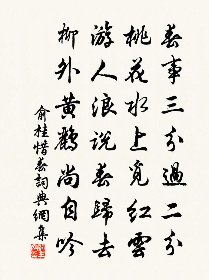 詩詞名句歷史字典書法欣賞書法字典國語詞典說文解字康熙字典古漢語字典標 題 作 者 詩 句 惜春作者:俞桂 朝代:宋代惜春原文春事三分過二分,桃花水上覓紅雲。遊人浪說春歸去,柳外黃鸝尚自吟。詩詞問答問:惜春的作者是誰?答:俞桂問:惜春寫於哪個朝代?答:宋代俞桂惜春書法欣賞惜春書法作品詩詞推薦偈頌二百零五首釋正覺〔宋代〕一句超然,良馬影鞭。道出語默,理合方圓。運斤之妙,賓主可憐。斲輪之伎,父子不傳。莫將爻象兮相求龜殼,元日次韻張先子野見和七夕寄莘老之作蘇軾〔宋代〕得句牛女夕,轉頭參尾中。青春先入睡,白髮不遺窮。酒社我為敵,詩罈子有功。縮頭先夏鱉,(見《玉川子》。黃耳冢林景熙〔宋代〕筠筒音斷水雲村,吠入空林枸杞根。我亦天涯音信杳,盧令詩在為招魂。道傍得熟人家曹彥約〔宋代〕舊雨留煙飾短垣,淺沙催水撼衡門。旗簾動眼新迎客,{禾罷}稏關心故弄孫。寄莫萬安升之二首趙蕃〔宋代〕身在江西盡處山,江東家住幾時還。苦吟更與風光別,一夜並成雙鬢斑。詠牛應制許圉師〔唐代〕逸足還同驥,奇毛自偶麟。欲知花跡遠,雲影入天津。西上罕嶺陳著〔宋代〕此去向南西,山高山復低。不逢清話客,已覺倦扶藜。送范大著文叔知彭州陳傅良〔宋代〕中書世祿今無幾,唐鑒家聲世不多。安得有人賢若此,忽聞去國意如何。同朝最是頭先白,知己還愁語太苛。盡欲偈頌一百三十六首釋惟一〔宋代〕萬法本無,一心何有。絕慮忘緣,默默自守。償能朝於斯夕於斯,自然虛而靈空而妙。正當恁么時,我手何似佛手句王子俊〔宋代〕沙鷗背人去。春日絕句陸游〔宋代〕介亭南畔排衙石,剝蘚剜苔覓舊題。讀罷南豐數行字,滿山煙雨共淒迷。清曉出郭迓客七里莊二首楊萬里〔宋代〕偏得春憐是柳條,腰支別作一般嬌。微風不動渠猶舞,剛道東風轉舞腰。題老學道院馬廷鸞〔宋代〕繁筆泉石兩成痴,早學東家晚學西。章甫峨峨寧汝誤,如今翻恨十年遲。雨後曉行喻良能〔宋代〕宿雨曉初收,長天澹如洗。解帶臨清流,泉聲細娛耳。有如到愚溪,還似游栗里。人生若此少,貧賤非所恥。酬友人春暮寄枳花茶李郢〔唐代〕昨日東風吹枳花,酒醒春晚一甌茶。如雲正護幽人塹,似雪才分野老家。金餅拍成和雨露,玉塵煎出照煙霞。相如汀州陳曄〔宋代〕嘗聞元豐間,元輿守茲土。別乘果為誰,青山郭功甫。二公德望尊,聲名播今古。除夜元稹〔唐代〕憶昔歲除夜,見君花燭前。今宵祝文上,重疊敘新年。閒處低聲哭,空堂背月眠。傷心小兒女,撩亂火堆邊。夏日夜憶張二駱賓王〔唐代〕伏枕憂思深,擁膝獨長吟。烹鯉無尺素,筌魚勞寸心。疏麻空有折,芳桂湛無斟。廣庭含夕氣,閒宇澹虛陰。織蟲頌證道歌證道歌釋印肅〔宋代〕覺後空空無大千,今年不離舊時天。春夏秋冬花木節,皆標實相耀心源。次韻秦觀秀才攜李公擇書相訪蘇轍〔宋代〕濟南三歲吾何求,史君後到消人憂。君言有客輕公侯,扁舟相從古揚州。致之匹馬恨無力,千里相望同異域。誦詩名句推薦宣父猶能畏後生,丈夫未可輕年少。李白《上李邕》 善禦敵者,正兵先合,而後扼之,此必勝之術也。尉繚《尉繚子·兵令上》 機心信隱,交接靡密,庶下者知威而畏也。來俊臣《羅織經·治下卷第三》 男兒何不帶吳鉤,收取關山五十州。李賀《南園十三首·其五》 桃花三十六陂,鮫宮睡起,嬌雷乍轉。吳文英《瑞龍吟·德清清明競渡》 明年豈無年,心事恐蹉跎。蘇軾《守歲》 漢家天馬出蒲梢,苜蓿榴花遍近郊。李商隱《茂陵》 清談可以飽,夢想接無由。韓愈《洞庭湖阻風贈張十一署·時自陽山徙掾江陵》 風引龍虎旗,歌鐘昔追攀。李白《登邯鄲洪波台置酒觀發兵》 舞榭歌台,風流總被雨打風吹去。辛棄疾《永遇樂·京口北固亭懷古》