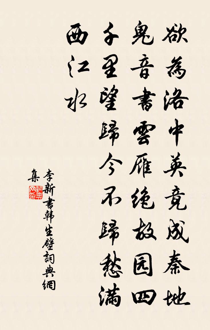 詩詞名句歷史字典書法欣賞書法字典國語詞典說文解字康熙字典古漢語字典標 題 作 者 詩 句 書韓生壁作者:李新 朝代:宋代書韓生壁原文欲為洛中英,竟成秦地鬼。音書雲雁絕,故園四千里。望歸今不歸,愁滿西江水。詩詞問答問:書韓生壁的作者是誰?答:李新問:書韓生壁寫於哪個朝代?答:宋代李新書韓生壁書法欣賞書韓生壁書法作品詩詞推薦峽口宋肇〔宋代〕萬里西南路,瞿唐據上游。峽分山對立,江合水爭流。蛟鱷從來患,風波自古愁。幾時飛兩槳,歸去幔帆秋。山家即事陳著〔宋代〕逃難走山巔,如何要順便。食艱蔬勝肉,衣薄炭輸綿。深靜初心見,高虛遠目鮮。沈思亦自好,寫景欠龍眠。江間作四首·其三潘大臨〔宋代〕西山通虎穴,赤壁隱龍宮。形勝三分國,波流萬世功。沙明拳宿鷺,天闊退飛鴻。最羨漁竿客,歸船雨打篷。贈梅蘇泂〔宋代〕不作梅花一句詩,今年參透老禪機。忽然吹墮紛紛雪,又挽寒香探落暉。滿江紅李壁〔宋代〕次韻上呈,並以寄洋州也簾卷東風,□林外、鳥啼姑惡。政迤邐、花梢紅綻,柳梢黃著。散策丘園容懶□,折衝樽罰赴邊上韋相公二首薛濤〔唐代〕螢在荒蕪月在天,螢飛豈到月輪邊。重光萬里應相照,目斷雲霄信不傳。按轡嶺頭寒復寒,微風細雨徹心肝。但得送趙國開赴崇安丞陳文蔚〔宋代〕十載交遊一日如,高情多謝不相疏。分攜幸不隔江海,得使常須訪起居。折柳正當三日暮,泛舟深約九秋餘。相期和戶部岑尚書參跡樞揆沈佺期〔唐代〕大君制六合,良佐參萬機。大業永開泰,臣道日光輝。鹽梅和鼎食,家聲眾所歸。漢章題楚劍,鄭武襲緇衣。理識西湖泛舟入靈隱山葛天民〔宋代〕晴嵐漠漠水溶溶,落葉遮船翠蓋重。秋色盡為漁者占,山光多向道人濃。雲連合抱前村樹,磵繞飛來小朵峰。送罷題揚州禪智寺杜牧〔唐代〕雨過一蟬噪,飄蕭松桂秋。青苔滿階砌,白鳥故遲留。暮靄生深樹,斜陽下小樓。誰知竹西路,歌吹是揚州。烈洲守風賀鑄〔宋代〕張帆早發石頭城,淹泊風波百里程。白芷汀洲潮進退,黃梅村落晝陰晴。官糧牽迫少休日,藥物扶持多半生。深閉頌證道歌證道歌釋印肅〔宋代〕維摩大士頓降疑,離四句兮絕百非。實相門中非我所,一輪心月鎮光輝。季弟黃岩任滿大人挈家眾先要作詩見示恭和元孫應符〔宋代〕心處中虛治五官,特來能應固非難。移忠益本居家孝,閱暑知曾歷歲寒。父子賡歌真內樂,弟兄分職賴居安。何妨雁兒落帶過得勝令吳西逸〔元代〕春花聞杜鵑,秋月看歸燕。人情薄似雲,風景疾如箭。留下買花錢,趲人種桑園。茅蓋三間廈,秧肥數頃田。床邊懶不作書急口令寄朝士戴復古〔宋代〕老病懶作書,行藏詩上見。一心不相忘,千里如對面。我已八十翁,此身寧久絆。諸君才傑出,玉石自有辯。隨才辨淵明詩方回〔宋代〕微禽移木石,欲以塞東洋。賦壽何能遠,銜冤未始忘。起脾訛越婢,澎浪轉彭郎。輕改刑天字,於文恐未詳。唐多令蔣春霖〔清代〕楓老樹留聲,蘆花吹又殘。系扁舟同倚朱闌。還似少年歌舞地,聽落葉,憶長安。哀角起重關。霜深楚水寒。背西木芙蓉釋輝〔宋代〕霜深才吐艷,日暮更饒紅。掩映殘荷浦,馮夷敗菊業。奉和成伯大雨中會客解嘲蘇軾〔宋代〕樂事難並真實語,坐排用意多乖誤。興來取次或成歡,瓦鉤卻勝黃金注。我生禍患久不擇,肯為一時風雨阻。天公鮮于子駿使君生日秦觀〔宋代〕惟昔高堂夢,熊羆兆吉占。氣鍾西蜀秀,時應仲秋嚴。江漢揮犀尾,風雲下筆尖。微辭追屈宋,精義到黃炎。操履名句推薦故人不可見,新知萬里外。文天祥《端午即事》 驛外斷橋邊,寂寞開無主。陸游《卜運算元·詠梅》 下馬登鄴城,城空復何見。岑參《登古鄴城》 晚食以當肉,安步以當車劉向《戰國策·齊四·齊宣王見顏斶》 玉慘花愁出鳳城,蓮花樓下柳青青。聶勝瓊《鷓鴣天·別情》 江上小堂巢翡翠,花邊高冢臥麒麟。杜甫《曲江二首》 信者人之乾也,義者行之節也。劉向《列女傳·貞順傳·陳寡孝婦》 凡令之行也,必待近者之勝也,而令乃行。管仲《管子·重令》 鳥銜野田草,誤入枯桑里。李白《樹中草》 永豐西角荒園裡,盡日無人屬阿誰。白居易《楊柳枝二首》