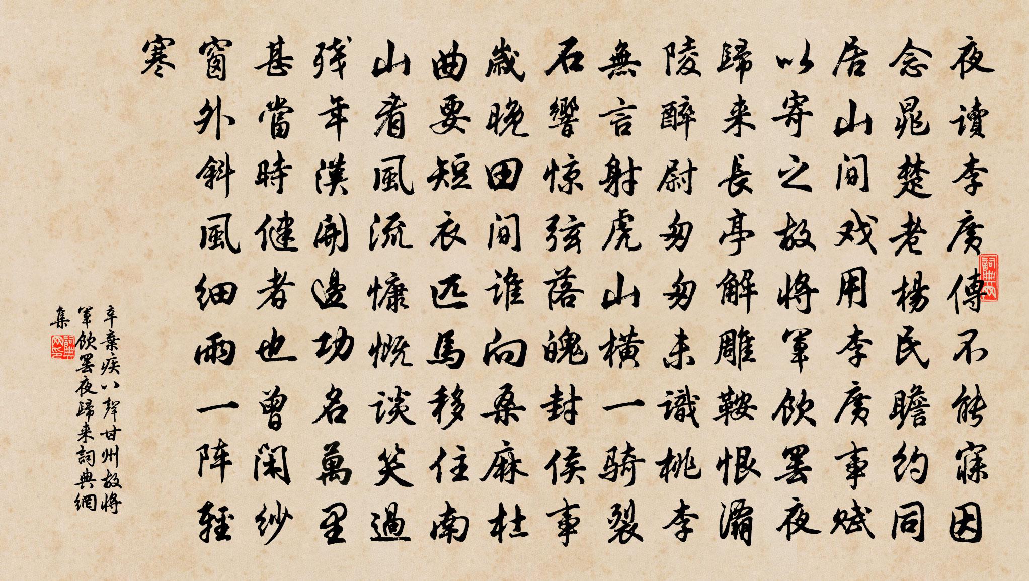 漢“飛將軍”李廣的故事廣為人知,在古代詩文中也多所詠及。辛棄疾的這首《八聲甘州》,便是其中的名篇。辛棄疾二十三歲即起兵抗金,南歸以後亦所至多有建樹。但因為人剛正不阿,敢於抨擊 * 勢力,遭到朝中奸臣的忌恨,不僅未能實現恢復中原的理想,且被誣以種種罪名,在壯盛之年削除了官職。他的這種遭遇,極似漢時名將李廣。這首詞即借李廣功高反黜的不平遭遇,抒發作者遭讒被廢的悲憤心情。辛棄疾在題語說“夜讀《李廣傳》,不能寐”,可見他當時的情緒是非常激動的。後邊說“戲用李廣事”,則不過是寓莊於諧的說法罷了。