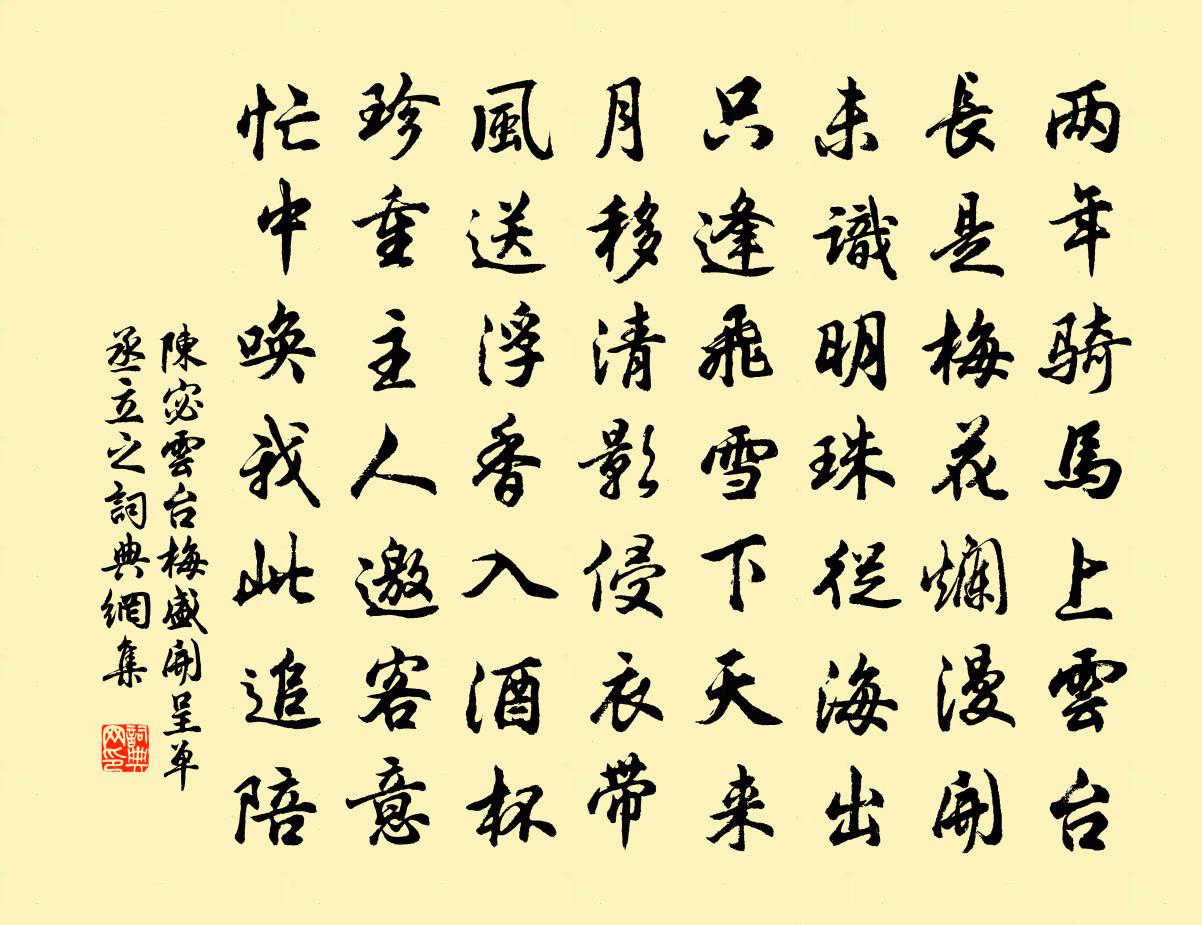 詩詞名句歷史字典書法欣賞書法字典國語詞典說文解字康熙字典古漢語字典標 題 作 者 詩 句 雲台梅盛開呈單丞立之作者:陳宓 朝代:宋代雲台梅盛開呈單丞立之原文兩年騎馬上雲台,長是梅花爛漫開。未識明珠從海出,只逢飛雪下天來。月移清影侵衣帶,風送浮香入酒杯。珍重主人邀客意,忙中喚我此追陪。詩詞問答問:雲台梅盛開呈單丞立之的作者是誰?答:陳宓問:雲台梅盛開呈單丞立之寫於哪個朝代?答:宋代陳宓雲台梅盛開呈單丞立之書法欣賞雲台梅盛開呈單丞立之書法作品詩詞推薦觀小魚釋永頤〔宋代〕藻間相失復相尋,水面爭浮力未禁。隔岸木蘭船欲去,浪花搖動一時沈。和丁御史出郊雩祀夕雨初霽蘇頌〔宋代〕雩帝臨初孟,涓辰用吉辛。肄儀慚陋學,司直接名臣。出從籠街馭,時觀避路人。雨餘鮮野服,雲霽變魚鱗。觚陛中秋夜南樓寄友人無可〔唐代〕海月出白浪,湖光射高樓。朗吟無綠酒,賤價買清秋。氣冷魚龍寂,輪高星漢幽。他鄉此夜客,對酌經多愁。張從之許玉友輒用其七夕賦韻以簡之李彌遜〔宋代〕四壁蕭蕭一味愁,了無從事到青州。殷勤獨有張公子,為遣玉人寬鬢秋。送僧休復之京師林逋〔宋代〕金錫指歸鴻,田衣獵曉風。春江片席遠,松月一房空。新句別離後,舊山魂夢中。到京當袖刺,館閣盡名公。洪扇贈別芮通父陳起〔宋代〕春冰幕千絲,我箑美無度。習習南浦秋,受藏憶襲護。之子思吳鱗,觸熱遙問津。舉箑寄薄劣,卻暑兼障塵。荊榛擬花蕊亞披紅詩楊萬里〔宋代〕花密非無蕊,繽紛亂眼中。千枝相亞鬧,一色總成紅。赴曉桃如積,爭晴杏欲烘。金須迷不見,玉頰醉來同。頓覺送顏倅之江西釋善珍〔宋代〕檻外江流知幾霜,煩君著語吊滕王。琴中誰識啼烏曲,酒後任稱司馬狂。閣序尚留唐篆刻,劍光何預晉興亡。此行山居雜詩九十首曹勛〔宋代〕休宮伏畎畝,農事未歷覽。年豐則知喜,歲歉頗不鑒。螟蜮則曰蠖,不實乃名冇。生民惰與勤,天災未嘗濫。初過隴山途中,呈宇文判官岑參〔唐代〕一驛過一驛,驛騎如星流。平明發鹹陽,暮及隴山頭。隴水不可聽,嗚咽令人愁。沙塵撲馬汗,霧露凝貂裘。西來雜詠一百首莊子劉克莊〔宋代〕誇大帝傳由,形容跖侮丘。僅饒聃禦寇,共載一虛舟。頌古一百則釋正覺〔宋代〕俱胝老子指頭禪,三十年來用不殘。信有道人方外術,了無俗物眼前看。所得甚簡,施設彌寬,大千剎海飲毛端。車中遙觀五峰胡仲弓〔宋代〕五峰天外立,驢腳慣經過。十載身萍梗,今朝面薜蘿。雲低山色暗,風急樹聲多。蠟屐何時辦,來聽樵五歌。述感陸游〔宋代〕斷簡承孤學,窮閻負壯心。方憂一齒落,何止二毛侵。買地開幽圃,招僧理廢琴。浮生祗如此,感慨不須深。送惟晤游廬山蘇頌〔宋代〕飛錫指湓城,秋風一衲輕。溪雲隨晚渡,嶺月伴晨征。敏思登臨發,空談舉動明。他時二林會,名字繼融生。次韻王得之游淨明題易安二絕張嵲〔宋代〕銅駝陌上須臾樂,金穴侯家瞬息歡。爭似蓋頭茅一把,老僧終日百般安。任所寄鄉關故舊周敦頤〔宋代〕老子生來骨性寒,宦情不改舊儒酸。停杯厭飲得醪味,舉筋常餐淡菜盤。事冗不知筋力倦,官清贏得夢魂安。故人有感嚴羽〔宋代〕誤喜殘胡滅,那知患更長。黃雲新戰路,白骨舊沙場。巴蜀連年哭,江淮幾郡瘡?襄陽根本地,回首一悲傷。偈頌一百三十六首釋惟一〔宋代〕不思善,不思惡。孤迥迥,活鱍鱍。不用追尋,不勞捉摸,只貴諸人知著落。知著落,楊岐驢子三隻腳。華嚴頂劉光第〔清代〕聞說金剛台外地,夜燈浮上獨茲峰。老猿抱子求僧飯,閒客看人打佛鐘。下界雲霞招杖屨,夕陽紅翠動杉松。風吹名句推薦一郡官閒唯副使,一年冷節是清明。王禹偁《清明日獨酌》 雨恨雲愁,江南依舊稱佳麗。王禹偁《點絳唇·感興》 行有不得者,皆反求諸己,其身正而天下歸之。孟子《孟子·離婁章句上·第四節》 危樓高百尺,手可摘星辰。李白《夜宿山寺》 卻看妻子愁何在,漫捲詩書喜欲狂杜甫《聞官軍收河南河北》 遮莫圓明似前度,不知誰續廣寒游。慧霖《閏中秋玩月》 天長雁影稀,月落山容瘦,冷清清暮秋時候。盧摯《沉醉東風·重九》 飄零疏酒盞,離別寬衣帶。秦觀《千秋歲·水邊沙外》 人逢喜事精神爽,悶上心來瞌睡多。吳承恩《西遊記·第三十五回》 明年此會知誰健?醉把茱萸仔細看。杜甫《九日藍田崔氏莊》