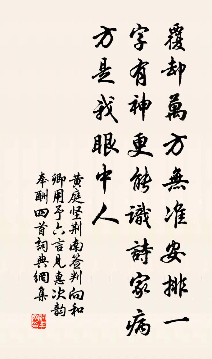 詩詞名句歷史字典書法欣賞書法字典國語詞典說文解字康熙字典古漢語字典標 題 作 者 詩 句 荊南簽判向和卿用予六言見惠次韻奉酬四首作者:黃庭堅 朝代:宋代原文覆卻萬方無準,安排一字有神。更能識詩家病,方是我眼中人。詩詞問答問:《荊南簽判向和卿用予六言見惠次韻奉酬四首》的作者是誰?答:黃庭堅問:該詩寫於哪個朝代?答:宋代問:黃庭堅的名句有哪些?答:黃庭堅名句大全書法欣賞荊南簽判向和卿用予六言見惠次韻奉酬四首書法作品詩詞推薦偶題殷堯藩〔唐代〕越女收龍眼,蠻兒拾象牙。長安千萬里,走馬送誰家。深夜司馬光〔宋代〕疏星映戶月流天,群動收聲四寂然。嗟爾寒蛩怨何事,悲吟徹曙亦無眠。池上早春,即事招夢得白居易〔唐代〕老更驚年改,閒先覺日長。晴熏榆莢黑,春染柳梢黃。雲破山呈色,冰融水放光。低平穩船舫,輕暖好衣裳。白角二十夜起對月懷斯無成父趙蕃〔宋代〕蟲鳴切切故關聽,重感跳丸去不停。不足有餘空歲計,書來吾友愧丁寧。哭李清卿侍郎王洋〔宋代〕金石雖雲久,精誠諒不移。但期忠可仗,誰謂敵誰知。吁極天應泣,難諶信有虧。報君如不盡,禍福定虛辭。哭薛吏部林季仲〔宋代〕伯仲皆登第,人言薛與林。淒涼五年事,摧折兩家心。漫醉春來酒,誰同別後襟。空餘釣磯在,落日見孤岑。里翁行陳與義〔宋代〕里翁無人支緩急,天雨牆壞百憂集。賣衣僱人築得牆,不慮偷兒披戶入。夜寒乾陬不經過,偷兒若來知奈何。君不次韻周守二首張嵲〔宋代〕西川方用武,憂思惔如焚。秋興悲黃葉,閒情屬野雲。鳴鴻何日到,絡緯不堪聞。每憶盈尊酒,清談從使君。偈頌一百零二首釋紹曇〔宋代〕百鳥啼春風,村村自花柳。揭示目前機,大地人積壓有。隨聲逐色,活陷重圍。蓋色騎聲,翻成窠臼。牢關擊碎,奉和御製玉清昭應宮成夏竦〔宋代〕中宸夜駐飛廉轡,東闕朝迎綠錯篇。祇建寶宮朝睟象,載崇金閣奉真銓。高侔紫極威神異,回據柔靈勝勢宣。矗矗陌上釋行海〔宋代〕別人楊柳別人花,自對春風感物華。陌上最憐芳草色,王孫多是不還家。正月一日皇帝御大慶殿受文武百僚朝賀行上壽蘇頌〔宋代〕嘉瑞降靈,應我皇德。燁燁神芝,不根而植。春秋三秀,晝夜五色。物播詩歌,聲被金石。送劉秀才南歸(一作陳存詩)劉復〔唐代〕鳥啼楊柳垂,此別千萬里。古路入商山,春風生灞水。停車落日在,罷酒離人起。蓬戶寄龍沙,送歸情詎已。游寶雨寺李復〔宋代〕信步出江{左舟右龍},庭松立兩龍。晨僧自汲水,高閣忽鳴鐘。淨飯多山蜜,新羹供野葑。傳聞初祖錫,猶掛最誡曾玉璟洪秀全〔清代〕迷途既返速加鞭,振起雄心趕向前。盡把凡情丟卻去,方能直上九重天。送張卿致仕王安石〔宋代〕子房籌策漢時功,身退超然慕赤松。餘烈尚能開後世,高材今復繼前蹤。執鞭始負平生願,操幾何知此地逢。竊食次韻酬徐仲元王安石〔宋代〕投老逍遙屺與堂,天刑真已脫桁楊。緣源靜翳無魚淰,度谷深追有鳥頏。每苦交遊尋五柳,最嫌尸祝擾庚桑。相看南柯子佚名〔宋代〕桐葉涼生夜,藕花香滿時,幾多離思有誰知。遙望盈盈一水、抵天涯。雨灑征衣淚,月顰分鏡眉。相逢又是隔年期寄四舍弟孔武仲〔宋代〕贛水南邊北勢回,層城中起郁孤台。憶初二陸同登此,喜有阿連相繼來。舊事前游休感嘆,清風佳景且徘徊。天涯戲李彥平李德邵仲並〔宋代〕人生貴適意,自苦良亦痴。百年同夢幻,富貴安所施。我生世緣薄,疲弱不可支。紛華豈不佳,自覺心已辭。歸來名句推薦所志在功名,離別何足嘆。陸龜蒙《別離》 十年離亂後,長大一相逢。李益《喜見外弟又言別》 願我如星君如月,夜夜流光相皎潔。范成大《車遙遙篇》 漆燕黃鸝夸舌健,柳花榆莢斗身輕。王禹偁《清明日獨酌》 停船暫借問,或恐是同鄉。崔顥《長干行·君家何處住》 不是冤家不聚頭,冤家相聚幾時休?馮夢龍《警世通言·卷二》 算陰晴,渾似幾番,渭城故人離會。吳文英《永遇樂·乙巳中秋風雨》 縱然生得好皮囊,腹內原來草莽。曹雪芹《紅樓夢·第三回》 丹砂成黃金,騎龍飛上太清家,雲愁海思令人嗟。李白《飛龍引二首·其一》 瀚海闌乾百丈冰,愁雲慘澹萬里凝。岑參《白雪歌送武判官歸京》