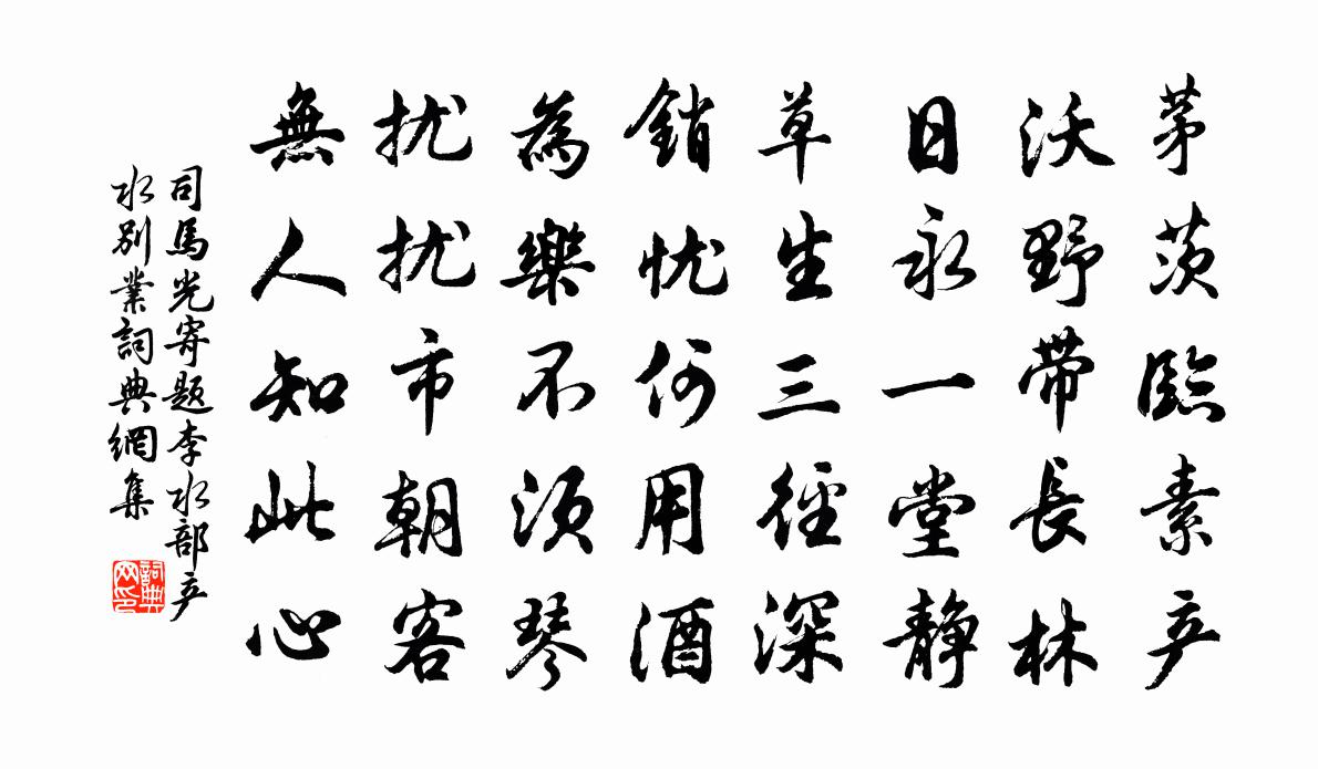 詩詞名句歷史字典書法欣賞書法字典國語詞典說文解字康熙字典古漢語字典標 題 作 者 詩 句 寄題李水部產水別業作者:司馬光 朝代:宋代寄題李水部產水別業原文茅茨臨素產,沃野帶長林。日永一堂靜,草生三徑深。銷憂何用酒,為樂不須琴。擾擾市朝客,無人知此心。詩詞問答問:寄題李水部產水別業的作者是誰?答:司馬光問:寄題李水部產水別業寫於哪個朝代?答:宋代問:司馬光的名句有哪些?答:司馬光名句大全司馬光寄題李水部產水別業書法欣賞寄題李水部產水別業書法作品詩詞推薦讀老子白居易〔唐代〕言者不如知者默,此語吾聞於老君。若道老君是知者,緣何自著五千文。役誠齋劉過〔宋代〕智愚上下爾自異,盡寸不差公短長。畢竟昌黎仍舊好,何曾人說段文昌。任氏鳴璫橋文同〔宋代〕清溪漱碧崖,袞袞寒聲落。子川愛溪聲,架橋橫絕壑。山風撼松月,倚檻聽噴薄。遂號曰鳴璫,古人無此作。潁川賞花二首陳襄〔宋代〕千騎重來此建旟,新年花發舊年株。東皇應是憐孤宦,十里全歸錦賬鋪。懷金陵知舊齊己〔唐代〕海門相別住荊門,六度秋光兩鬢根。萬象倒心難蓋口,一生無事可傷魂。石頭城外青山疊,北固窗前白浪翻。儘是夜聞牛歌宋庠〔宋代〕蕭蕭墟落暮雲寒,壞曲薪歌浹野歡。何處飯牛歸路遠,一聲辛苦愬漫漫。龍池寺喻良能〔宋代〕發軔資福山,弭轡龍池寺。杪春新雨足,老紅圍穉翠。溪流素縠寒,山色青羅膩。拄頰坐移晷,此意誰能會。怕愛劉克莊〔宋代〕月中玉女雖嚴冷,雪裡瑤姬轉麗華。不管達官怕木稼,且留處士愛梅花。朝中措曹勛〔宋代〕酴醿芳架引繁英。香遠透簾清。更與洛陽花市,一齊移在宮庭。琉璃萬朵,嬌紅嫩紫,總是嘉名。殿閣真仙同賞,次陳芸居問訊後村韻胡仲弓〔宋代〕人心真灩澦,世路多餚函。此險久已涉,此味久已諳。易節固不可,貧賤分所甘。浩歌一長慨,書與識者談。清夜次韻唐彥猷華亭十詠其六陸瑁養魚池王安石〔宋代〕野人非昔人,亦復水上居。紛紛水中游,豈是昔時魚。吹波浮還沒,競食糟糠余。吞舟不可見,守此歲月除。題妙智院朱利賓〔宋代〕江南景物可人意,夢裡家山喚客愁。歲月幾何春欲暮,水雲深處寺偏幽。宿黃花館楊發〔唐代〕孤館蕭條槐葉稀,暮蟬聲隔水聲微。年年為客路無盡,日日送人身未歸。何處離鴻迷浦月,誰家愁婦擣霜衣。夜深端午三殿侍宴應制探得魚字張說〔唐代〕小暑夏弦應,徽音商管初。願齎長命縷,來續大恩餘。三殿褰珠箔,群官上玉除。助陽嘗麥彘,順節進龜魚。甘露赴試途中有感李鴻章〔清代〕頻年伏櫪困紅塵,悔煞駒光二十春。馬足出群休戀棧,燕辭故壘更圖新。遍交海內知名士,去訪京師有道人。即此又三首范祖禹〔宋代〕九載扶皇業,三朝賴母儀。成乾功不有,並日照無私。天上軒星暗,人間薤露悲。君王自仁孝,舊典奉元龜。滿庭芳王丹桂〔元代〕一點靈明,萬情牽緒,豈曾時暫寧閒。輪迴催逼,販骨若丘山。由是迷心未悟,夸聰辯、馳聘伶奸。還同似,飛蛾乙已題制參蕭應父襲芳亭李曾伯〔宋代〕細攬群英入此亭,重開八葉付公門。無窮真意侵書架,不斷清香對酒樽。由實又花花又實,看孫生子子生孫。主人睹丞相曾公為桂帥時經過留題黃朝散〔宋代〕龍巖重到臘殘天,欲訪丹成行滿仙。因睹曾公題刻妙,氣騰忠誼拂雲煙。朝陽穿破衲二首釋智朋〔宋代〕骨相寒,毳寒衲。不朝陽,難提掇。正與麽時,大地火發。名句推薦淡雲孤雁遠,寒日暮天紅。徐昌圖《臨江仙·飲散離亭西去》 孔雀東南飛,五里一徘徊。佚名《孔雀東南飛 / 古詩為焦仲卿妻作》 憶昔花間相見後,只憑縴手,暗拋紅豆。歐陽炯《賀明朝·憶昔花間相見後》 有熊有羆,有貓有虎,慶既令居,韓姞燕譽。佚名《韓奕》 水天清話,院靜人銷夏。項鴻祚《清平樂·池上納涼》 忽憶故人天際去,計程今日到梁州。白居易《同李十一醉憶元九》 十分不耐煩,乃為人大病;一味學吃虧,是處事良方。王永彬《圍爐夜話·第五四則》 滯雨通宵又徹明,百憂如草雨中生。薛逢《長安夜雨》 無人調護,自去經心。沈復《浮生六記·閨房記樂》 日暮蒼山遠,天寒白屋貧。劉長卿《逢雪宿芙蓉山主人》