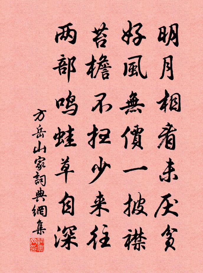 詩詞名句歷史字典書法欣賞書法字典國語詞典說文解字康熙字典古漢語字典標 題 作 者 詩 句 山家作者:方岳 朝代:宋代山家原文明月相看未厭貧,好風無價一披襟。苔檐不掃少來往,兩部鳴蛙草自深。詩詞問答問:山家的作者是誰?答:方岳問:山家寫於哪個朝代?答:宋代方岳山家書法欣賞山家書法作品詩詞推薦別莆陽史君林宗丞二首林亦之〔宋代〕下筆翩翩如史君,年過五十始朱輪。蜀山久托無家客,滕國曾為負耒人。脫印忽聞過我里,攀轅尤更甚州民。乍晴驀山溪(詠茶)王質〔宋代〕枯林荒陌,矮樹敷鮮葉。不見雅風標,十二分、山容野色。因何嫩茁,舞動小旗槍,梅花後,杏花前,色味香三絕送超禪人歸省親釋心月〔宋代〕參玄曾未造玄微,肯學新豐十不歸。歸舉清涼答佛話,教娘知有祖師機。送朱仲微使君赴闕孫應時〔宋代〕聲跡周行舊,人門漢相延。謝宗康樂在,阮侄仲容賢。文獻群公側,風流晚輩先。天資超珏,心量極澄淵。世故雖倦尋芳湯恢〔宋代〕餳簫吹暖,蠟燭分煙,春思無限。風到楝花,二十四番吹遍。煙濕濃堆楊柳色,晝長閒墜梨花片。悄簾櫳,聽幽禽永州寄翁靈舒徐照〔宋代〕古郡百蠻邊,蒼梧九點菸。去家疑萬里,歸計在明年。風順眠聽角,樓高望見船。筠州當半道,長得秀詩篇。九誦周公鮮于侁〔宋代〕噫嗟兮文公,巋然兮秘宇。悵王室兮多難,獨勤勞兮左右。四國流言兮沖人不知,東片問罪兮慆慆不歸。大電以風荷花四絕日吳龍翰〔宋代〕醉臉潮紅嬌欲眠,玉幢移影蓋嬋娟。一奩晴色開明鏡,暖熨金爐起碧煙。寄獻南京致政杜相公宋祁〔宋代〕調元罷後久忘機,三見東山拜詔時。言在典謨經舜問,規留廊廟許曹隨。人間歲月尊黃髮,方外謳謠續紫芝。舉酒水調歌頭(餞提舉陳秘丞)徐鹿卿〔宋代〕嶺嶠轉和氣,英盪挾新涼。登車攬轡慷慨,風采肅台綱。第一澄清官府,次第諮詢民瘼,餘事到囷倉。謹勿養稂莠臘日出獵因游梅山蘭若梅堯臣〔宋代〕我與二三騎,爭馳孤戍旁。逐麋逢野寺,息馬據胡床。鷹想支公好,人思濡上狂。歸來何薄暮,煙火照溪光。春詞二首張琰〔唐代〕垂柳鳴黃鸝,關關若求友。春情不可耐,愁殺閨中婦。日暮登高樓,誰憐小垂手。昨日桃花飛,今朝梨花吐。春色復用韻記昨日坐中劇談及趙家琵琶之妙,呈王范成大〔宋代〕病來六結總龜藏,不用濃薰戒定香。花下酒邊非我事,但余消瘦是東陽。緣識宋太宗〔宋代〕每逢清夜坐更深,白日忙忙各是情。南北東西誰定準,無窮天地始知名。夏夜司馬光〔宋代〕溽暑郁不聞,矗矗雲萬疊。長風捲地來,凍雨不濡葉。雖無潤物功,涼冷得所愜。須臾號怒息,清月照壁頰。小冠送蕃叟弟赴江西帥幕分韻得獨字陳傅良〔宋代〕生平未省友松竹,愛言從宦輸幽獨。子也諸侯老賓客,襆被僅緣升斗祿。為問江神何世情,霽月光風送帆幅。天意贈解禹玉陳造〔宋代〕讀書只博雙鬢斑,詩好豈解留朱顏。平時無客憐轍鮒,觸處有人嘲飯山。相府略嘗喚宜祿,木門不夢窺銅環。多病游僊陸游〔宋代〕鳳舞鸞歌宴蕊宮,碧桃花下醉千鍾。紅塵謫滿重歸去,花未開殘宴未終。挽主簿吳寧侯三首陳棣〔宋代〕昔我先君子,時稱鑒裁公。知君非介紹,虛館授兒童。倒屣迎王粲,登門得孔融。他年記先友,孰不仰清風。偈頌二十一首釋堅璧〔宋代〕十日梅天曉未晴,千岩俱作偃溪聲。直饒透出威音外,猶較曹山半月程。名句推薦賢達哀樂,不在窮通禍福之間。脫脫《遼史·列傳·卷三十四》 哀莫大於心死。莊子《莊子·外篇·田子方》 是法平等無有高下。鳩摩羅什譯《金剛經·淨心行善》 人無善志,雖勇必傷。劉安及其門客《淮南子·主術訓》 君子博學而日參省乎己,則知明而行無過矣。荀子《荀子·勸學》 相思了無益,悔當初相見。朱彝尊《憶少年·飛花時節》 五馬如飛龍,青絲結金絡。李白《陌上桑》 不須更上新亭望,大不如前灑淚時。虞集《挽文丞相》 以反求諸己為要法,以言人不善為至戒。胡宏《知言·文王》 聰明睿智,守之以愚李昉、李穆、徐鉉《太平御覽·文部·卷六》